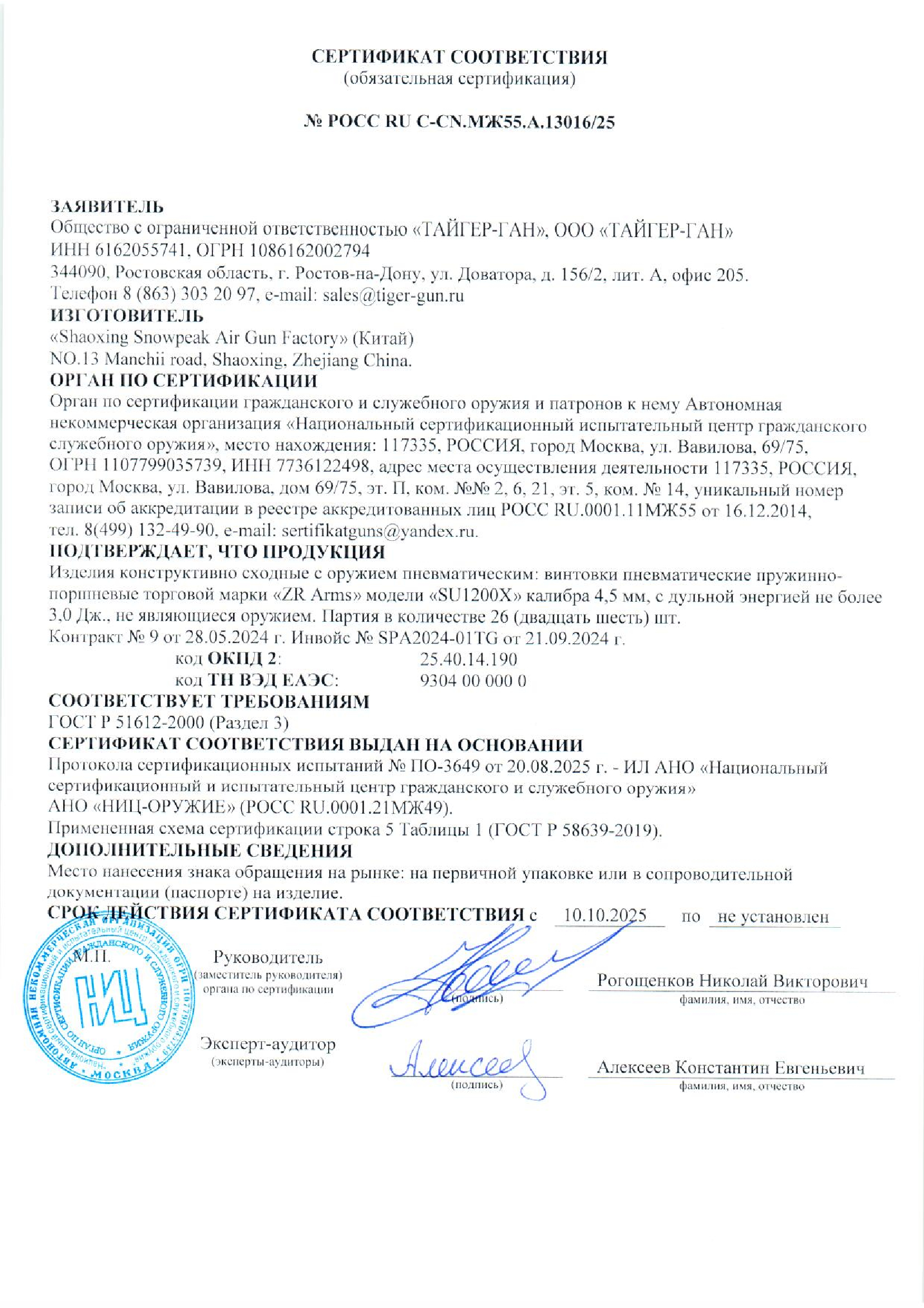 | Комплектация | Винтовка, упаковка, краткая документация, копия сертификата (по запросу покупателя) |