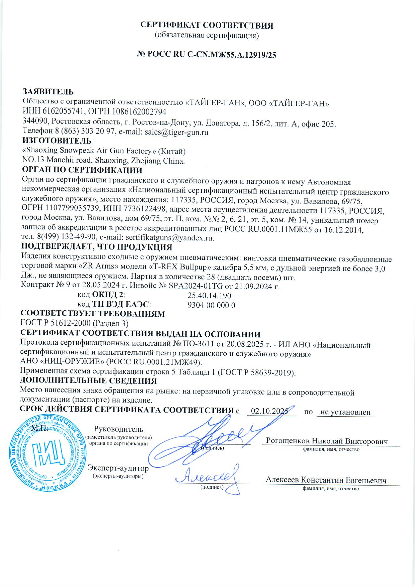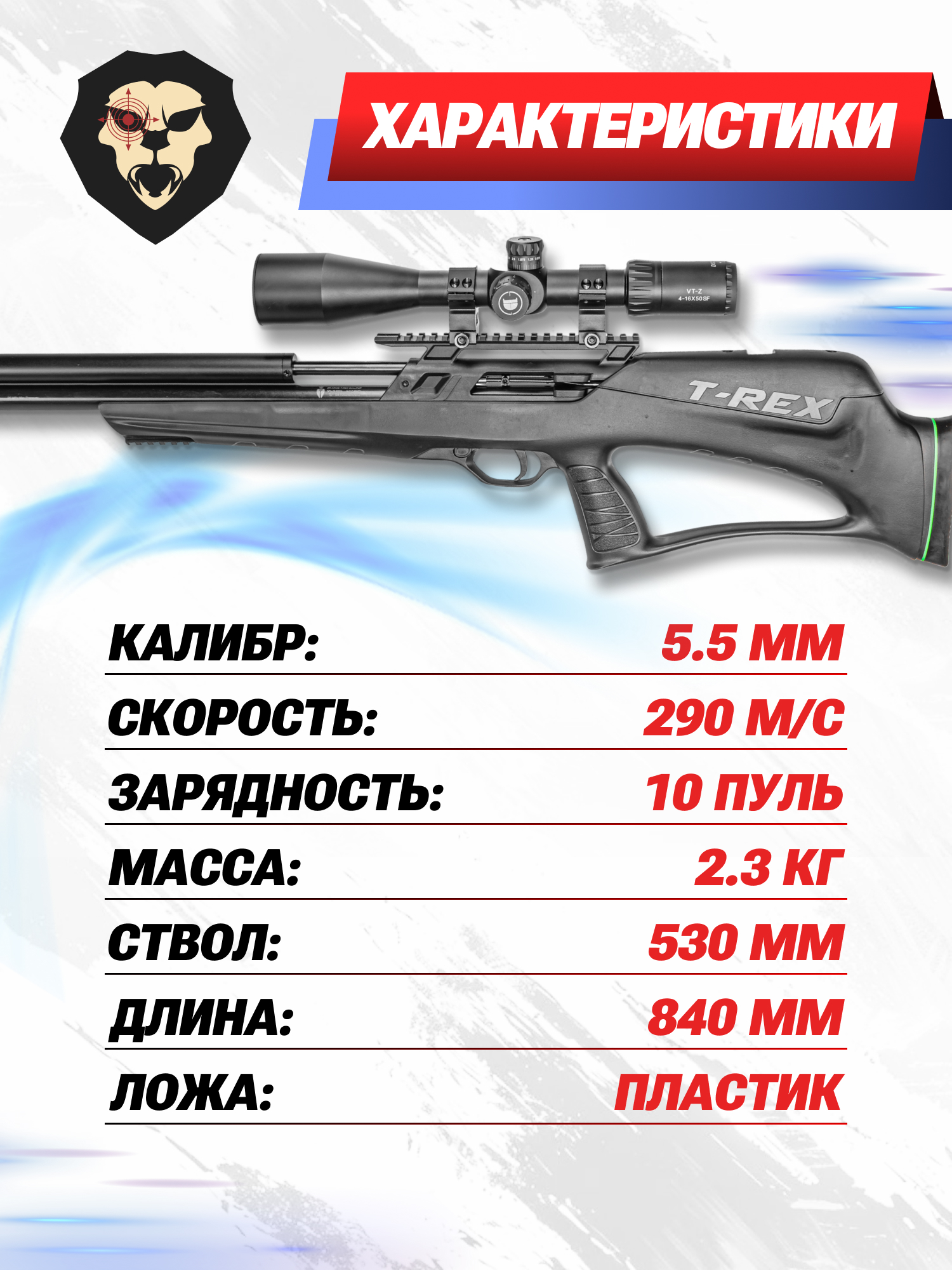 Информация о товаре "Пневматическая винтовка ZR Arms T-Rex BullPup 5.5 мм (пластик, PCP)" носит ознакомительный характер, и не является публичной офертой, определяемой положениями Статьи 437 Гражданского кодекса Российской Федерации, характеристики, внешний вид, цвет и комплектация могут быть изменены производителем без уведомления.