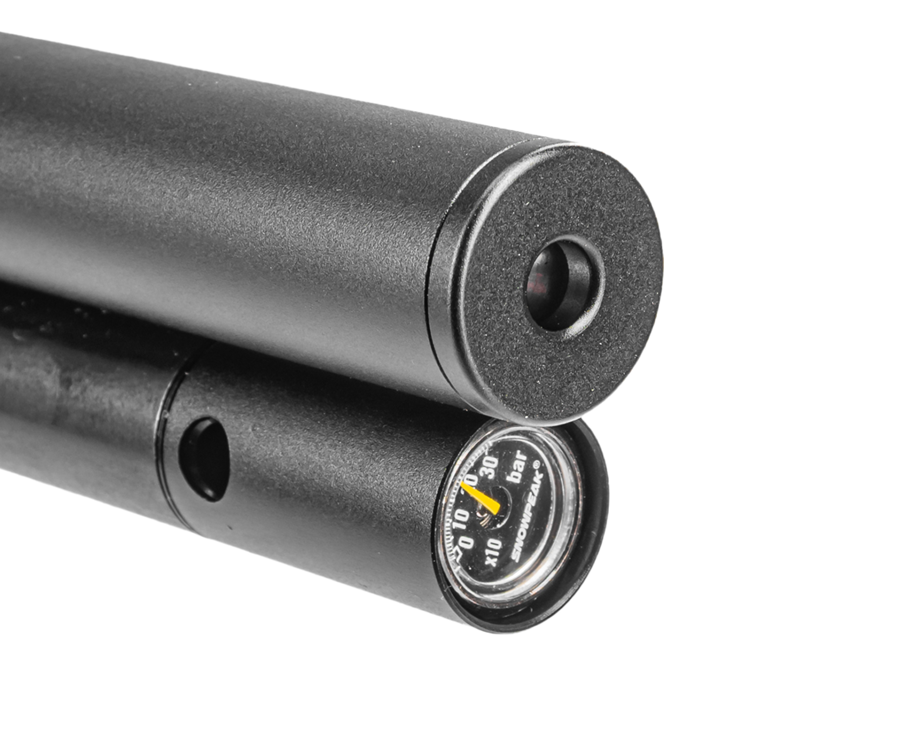 Предельно допустимый показатель заполнения составляет 250 Бар. Система устроена по редукторной схеме, следовательно, подразумевает тонкую настройку для максимально предсказуемой работы. Наблюдать текущее значение давления в ресивере можно посредством манометра.