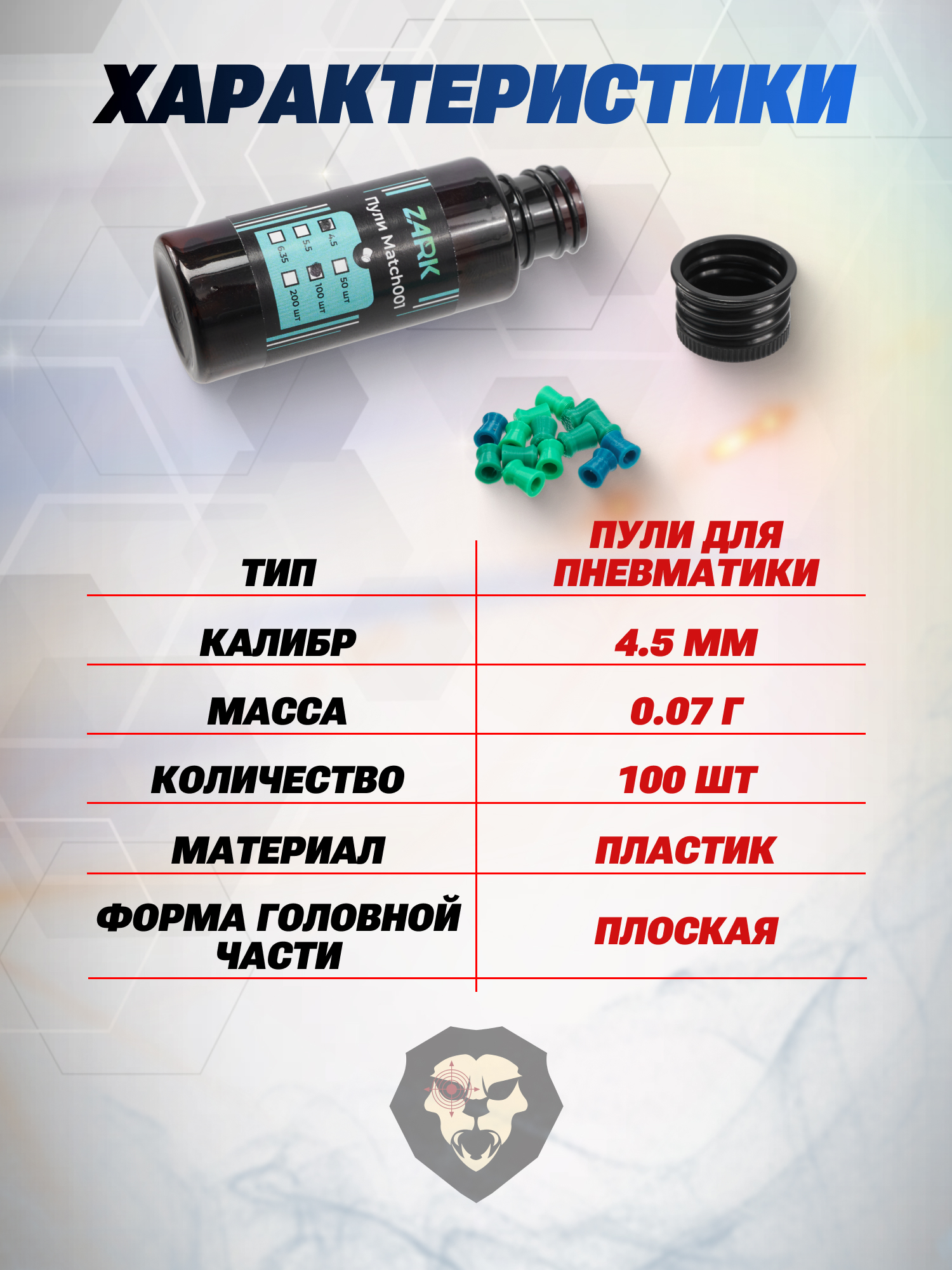 Информация о товаре "Пневматические пули Zark Arms Match001 4.5 мм (пластик, 100 шт, 0.07 г, легкие, до 3 Дж)" носит ознакомительный характер, и не является публичной офертой, определяемой положениями Статьи 437 Гражданского кодекса Российской Федерации, характеристики, внешний вид, цвет и комплектация могут быть изменены производителем без уведомления.