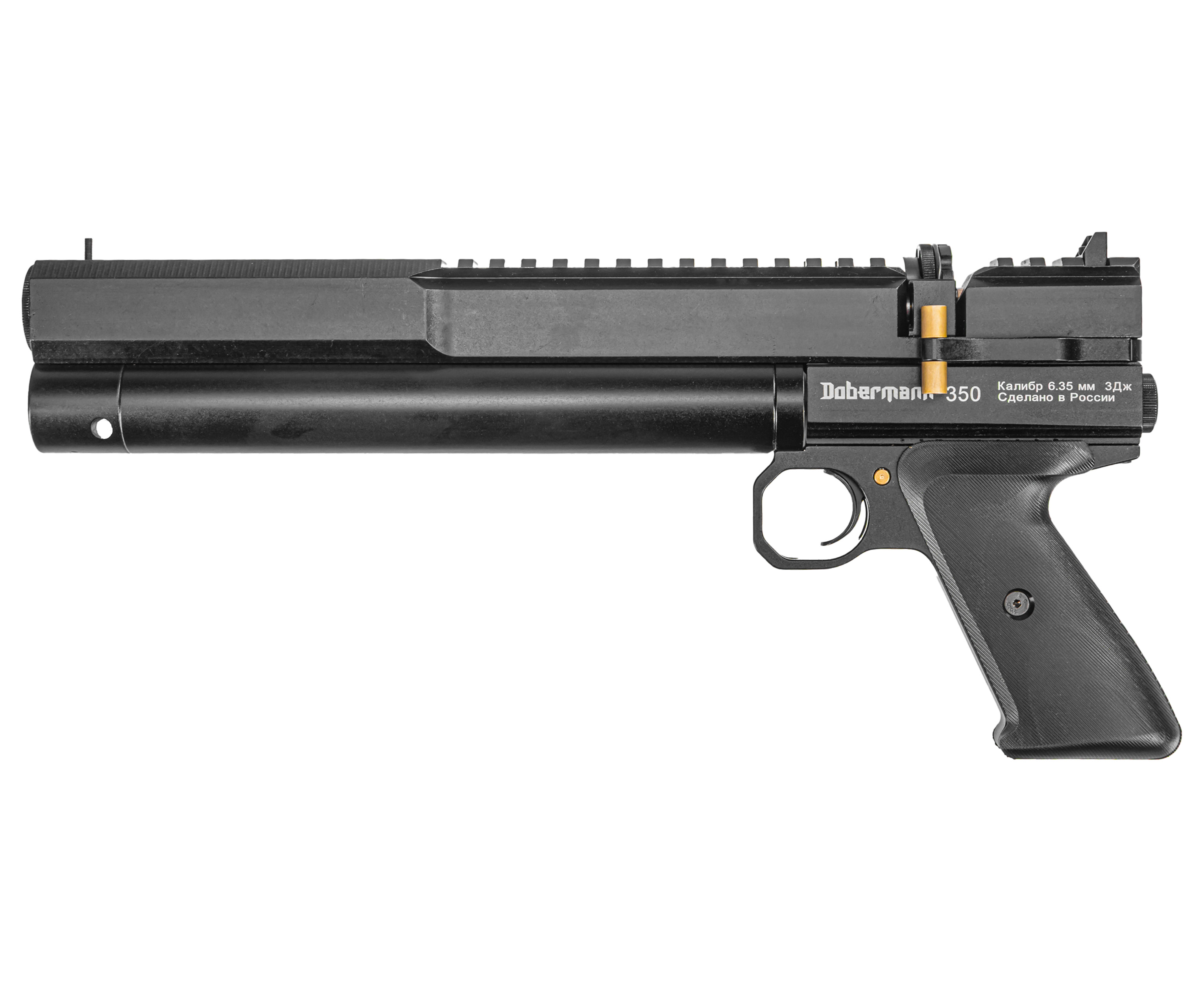 Такое оружие впускается многими компаниями в том числе и на территории России. Среди пользователей определенную известность за качество исполнения, надежность механизмов и мощностные характеристики получил бренд Dobermann, представивший серию пневматических PCP пистолетов Dobermann 350 Эксцентрик.