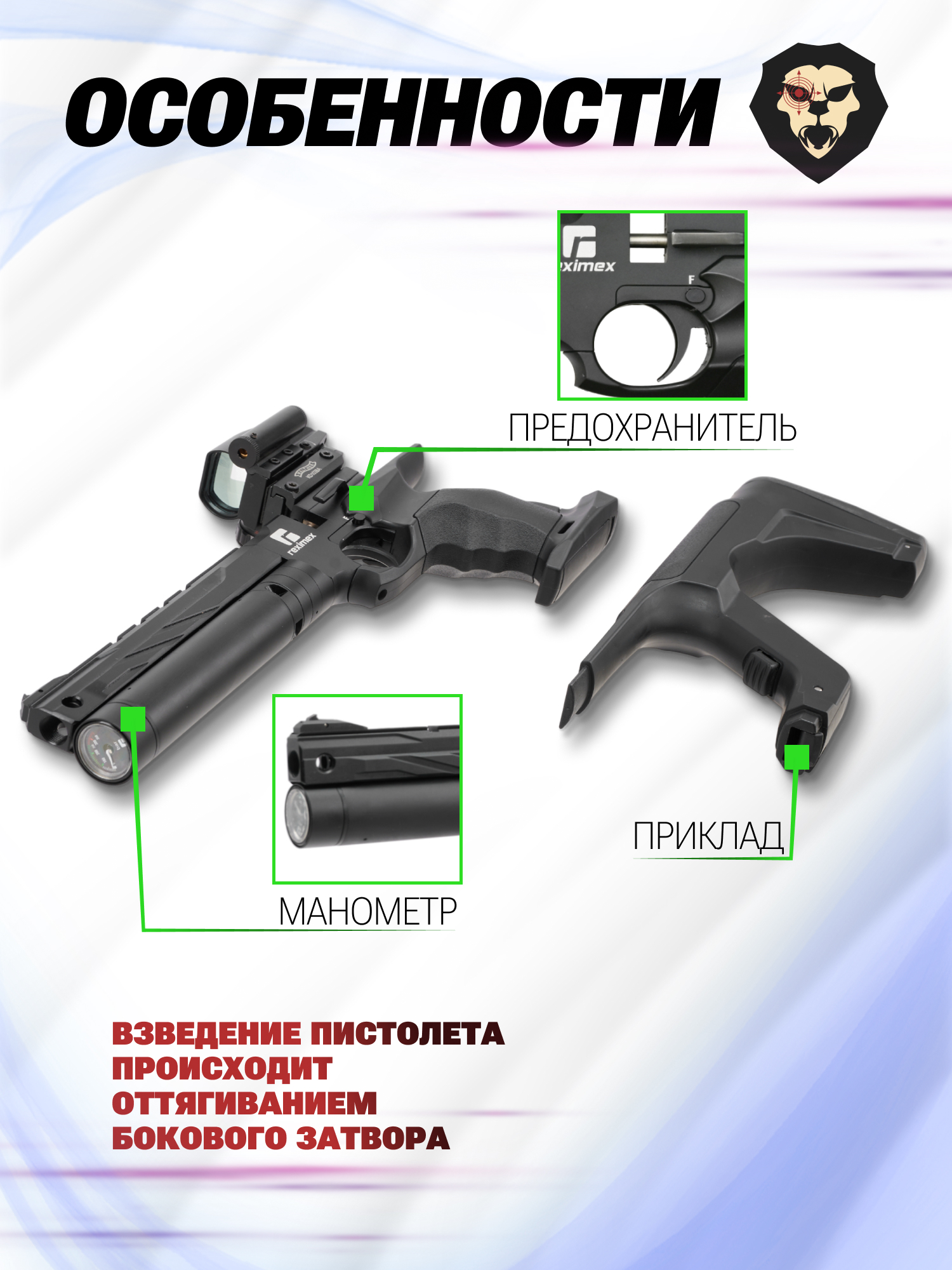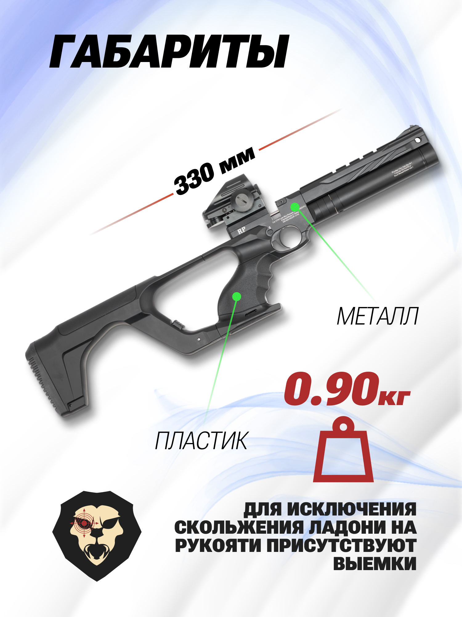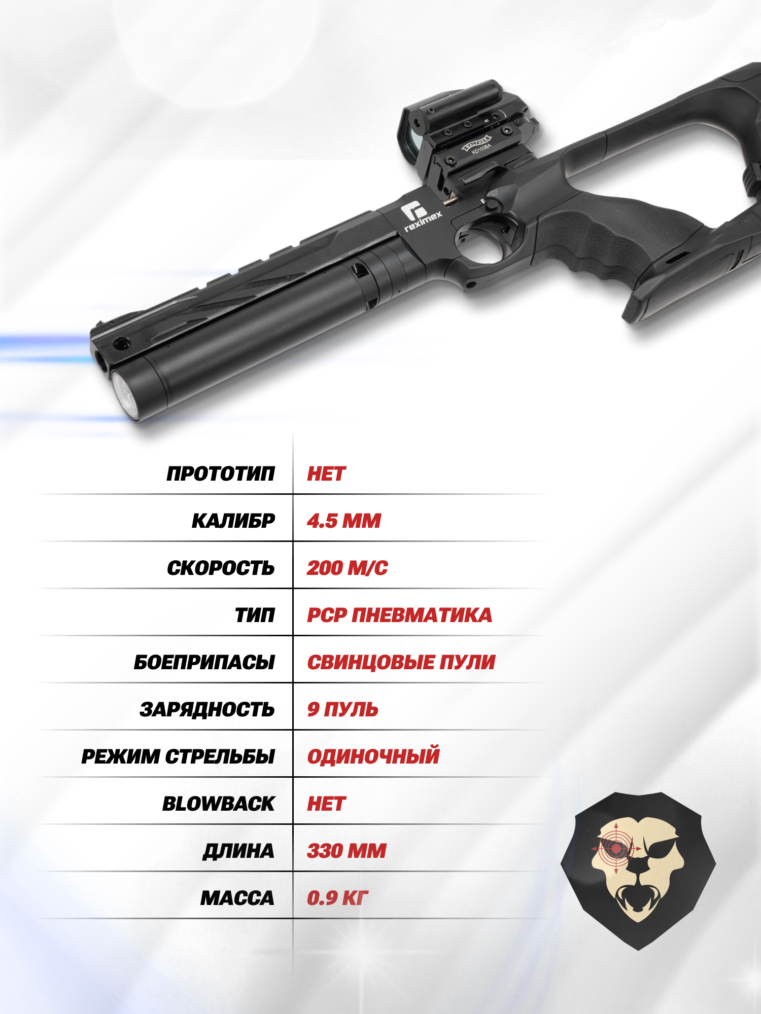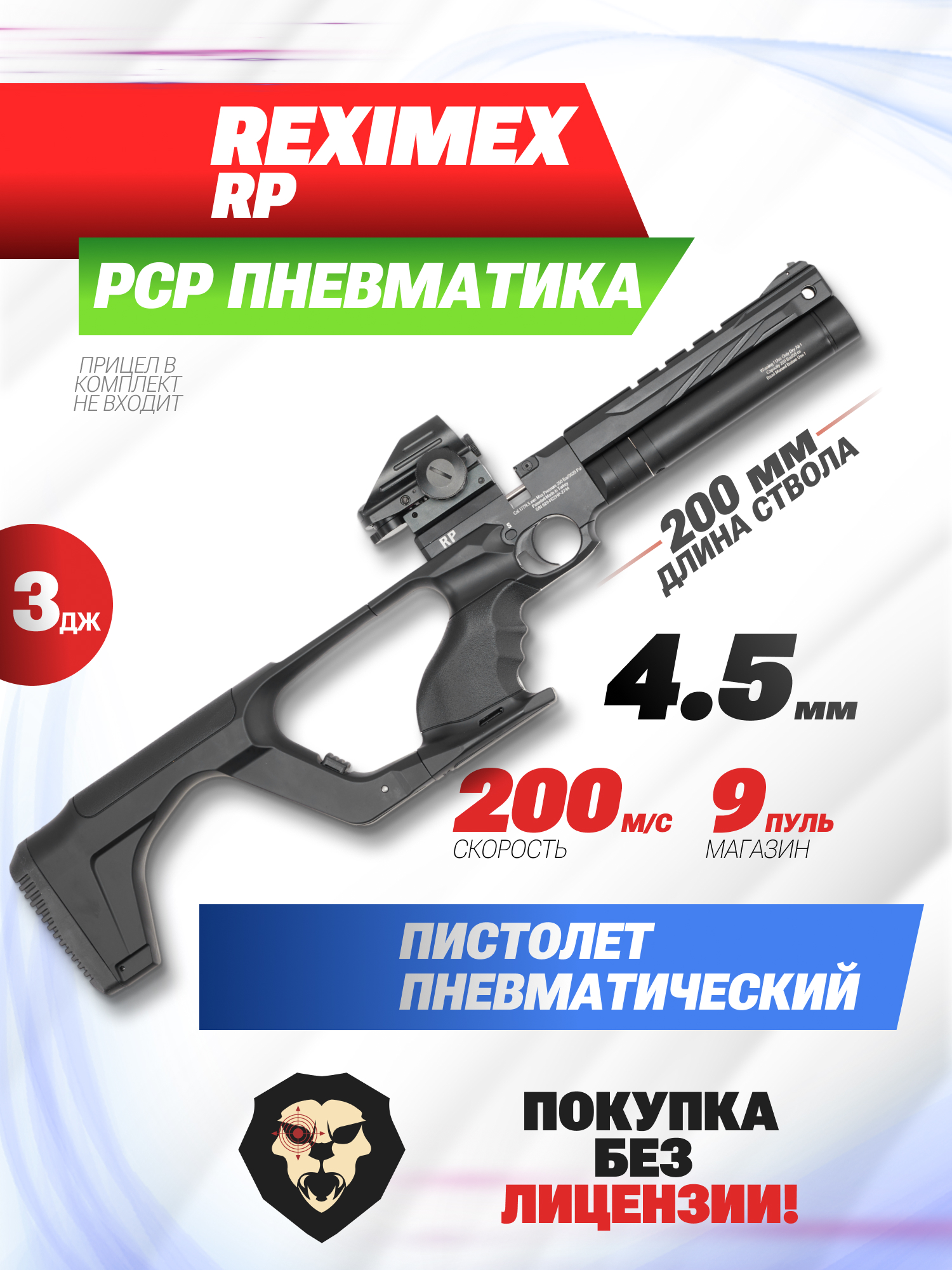 Рексимекс пистолет РП PCP относится к категории высокомощных образцов пневматики благодаря показателям скорости полета свинцового снаряда больше 200 метров в секунду. При этом в российских оружейных магазинах рассматриваемая модель представлена в исполнении с ограниченной дульной энергией выстрела в пределе трех Джоулей. Такая особенность позволяет приобретать описанный пистолет без оформления специализированной лицензии.