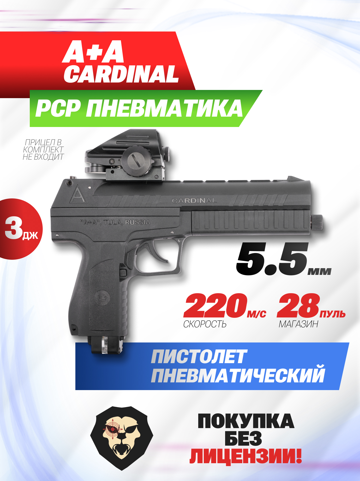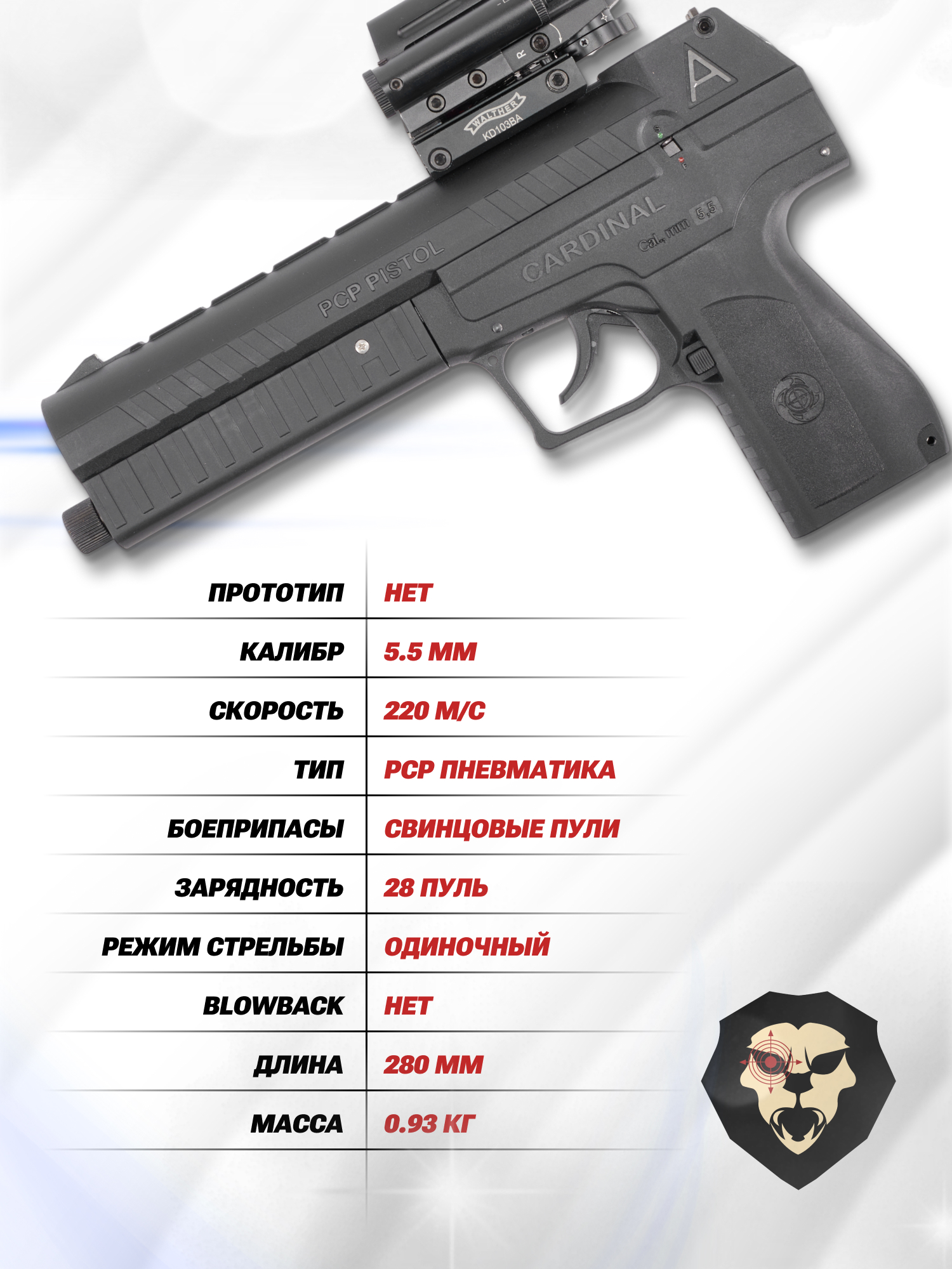 Артикул производителя Пневматический пистолет A+A Cardinal 5.5 мм (УСМ двойного действия, Пулевой, PCP) по низкой цене 42000 руб. Модель со штрихкодом производителя Вы можете оплатить наложенным платежем с доставкой или в отделении транспортной компании (ПЭК, СДЭК, Boxberry). Ваш заказ со штрихкодом 2000000075648 забрать на почте с оплатой при получении в любой части Российской Федерации.