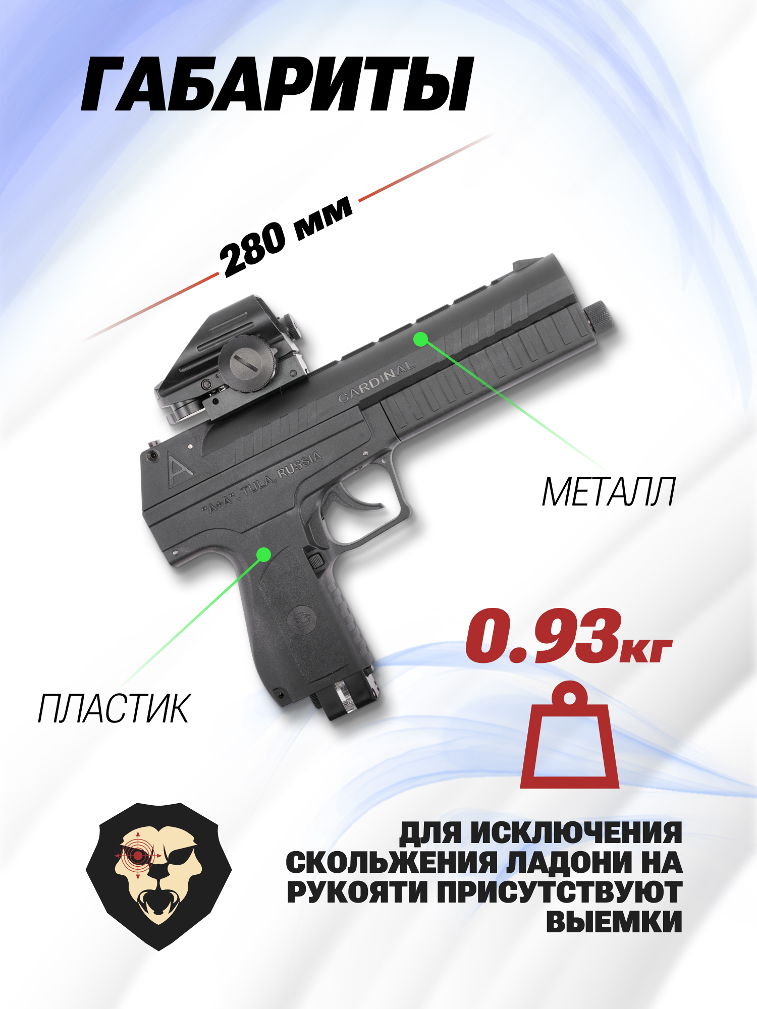 Пистолет А+А Кардинал в калибре 5.5 мм оборудован открытым прицельным приспособлением, а именно мушкой и целиком. Кроме того, модель имеет направляющую планку типа Вивер 22 мм на верхней части ствольной коробки.
