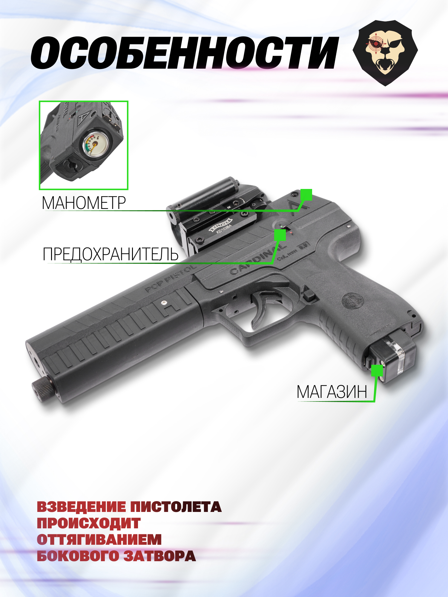 Информация о товаре "Пневматический пистолет A+A Cardinal 5.5 мм (УСМ двойного действия, Пулевой, PCP)" носит ознакомительный характер, и не является публичной офертой, определяемой положениями Статьи 437 Гражданского кодекса Российской Федерации, характеристики, внешний вид, цвет и комплектация могут быть изменены производителем без уведомления.