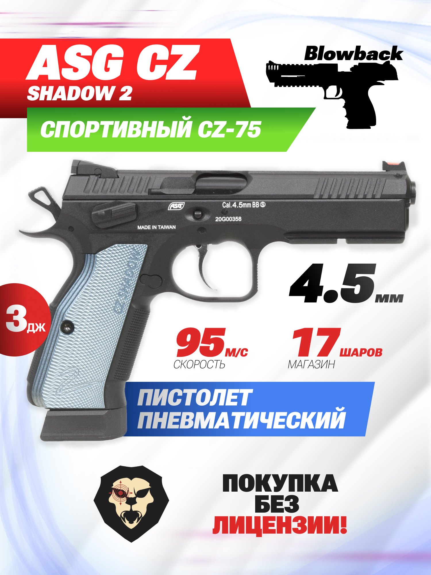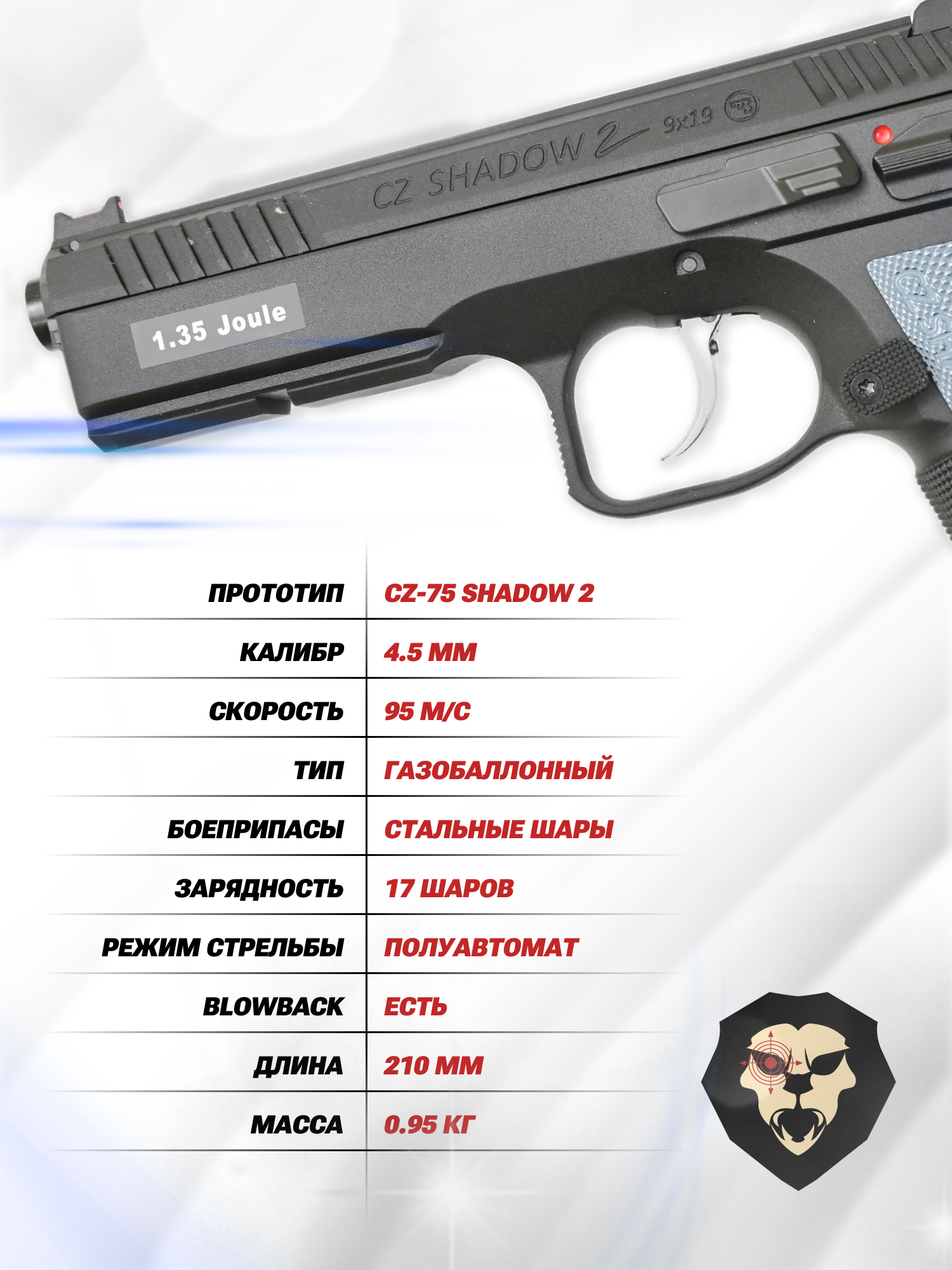 Информация о товаре "Пневматический пистолет ASG CZ Shadow 2 (4.5 мм, Blowback)" носит ознакомительный характер, и не является публичной офертой, определяемой положениями Статьи 437 Гражданского кодекса Российской Федерации, характеристики, внешний вид, цвет и комплектация могут быть изменены производителем без уведомления.