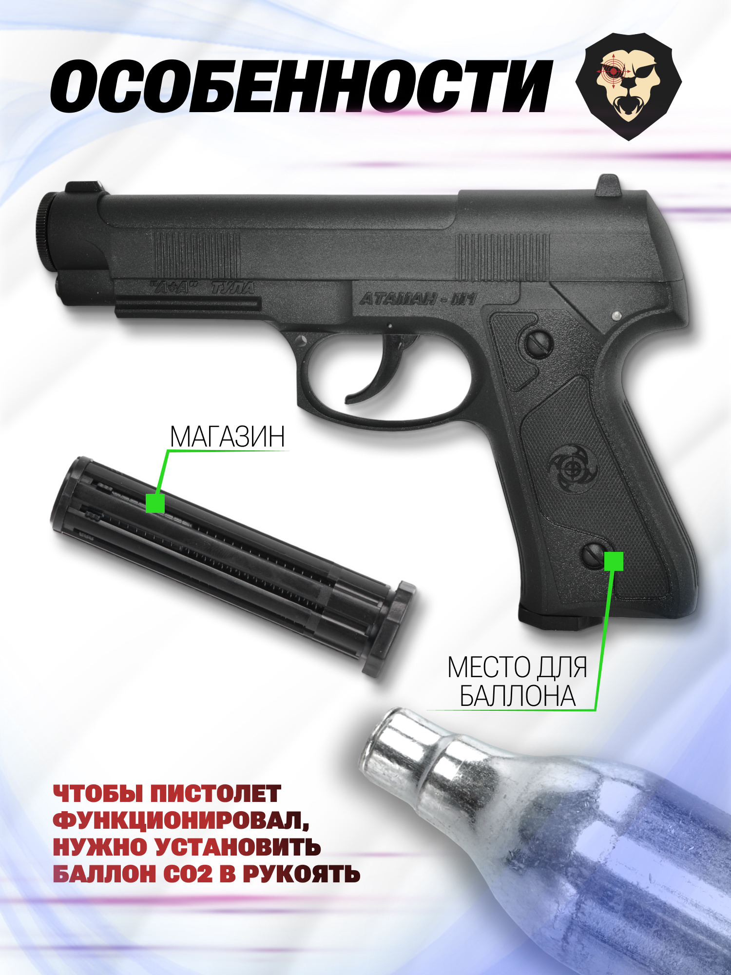 Представленный пневматический Атаман М1 выступает оружием, которое функционирует за счет диоксида углерода, он же углекислота CO2. Отмеченный газ поставляется на рынок в металлических специальных 12-граммовых баллончиках, которые обычно устанавливаются в оружие для последующей эксплуатации.