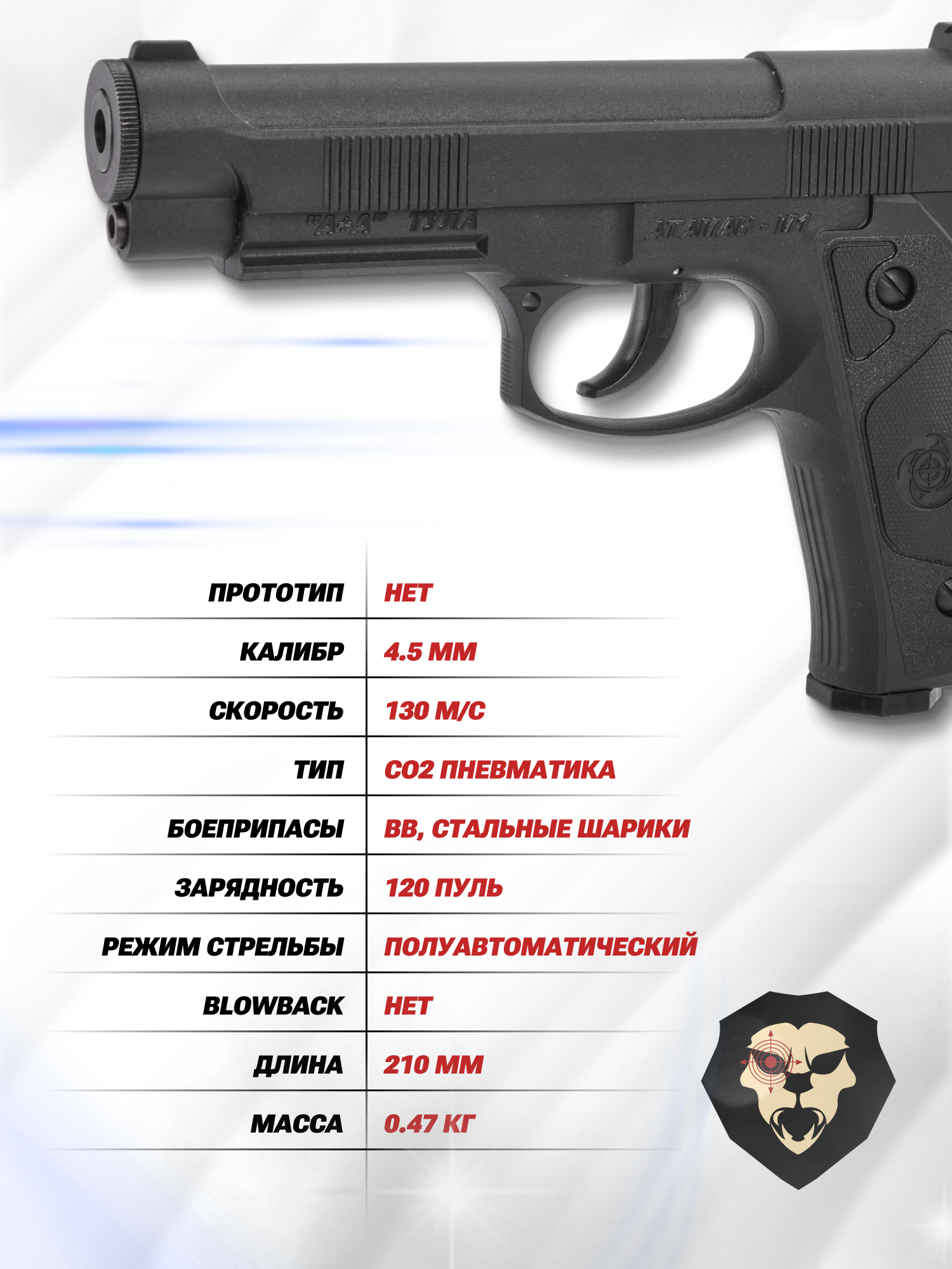 Информация о товаре "Пневматический пистолет А+А Атаман-М1 4.5 мм (CO2)" носит ознакомительный характер, и не является публичной офертой, определяемой положениями Статьи 437 Гражданского кодекса Российской Федерации, характеристики, внешний вид, цвет и комплектация могут быть изменены производителем без уведомления.