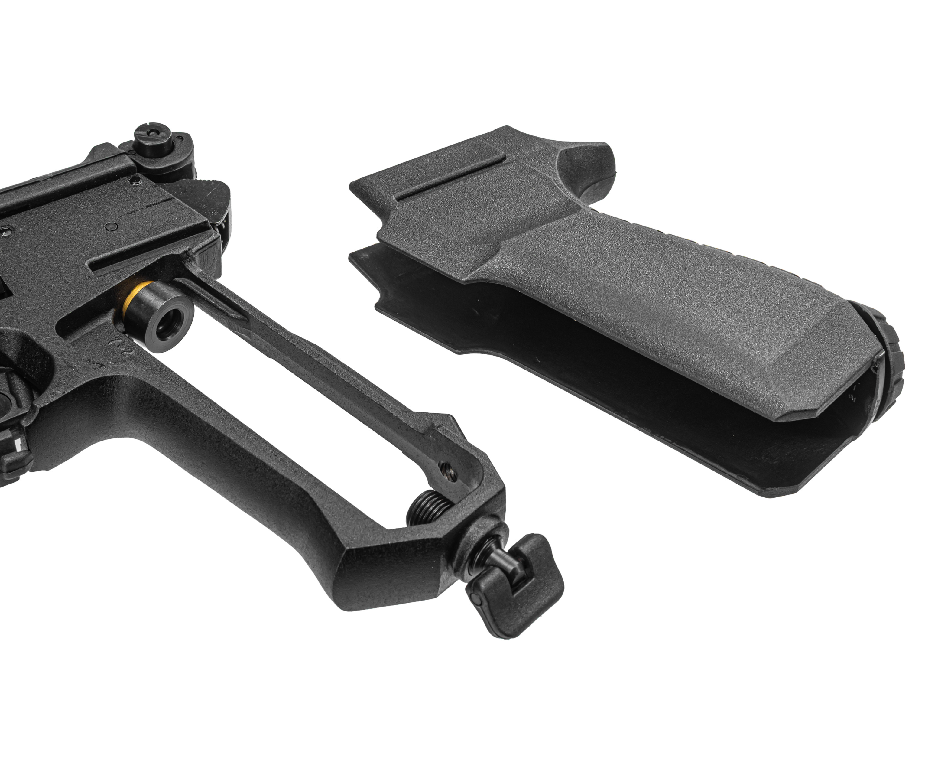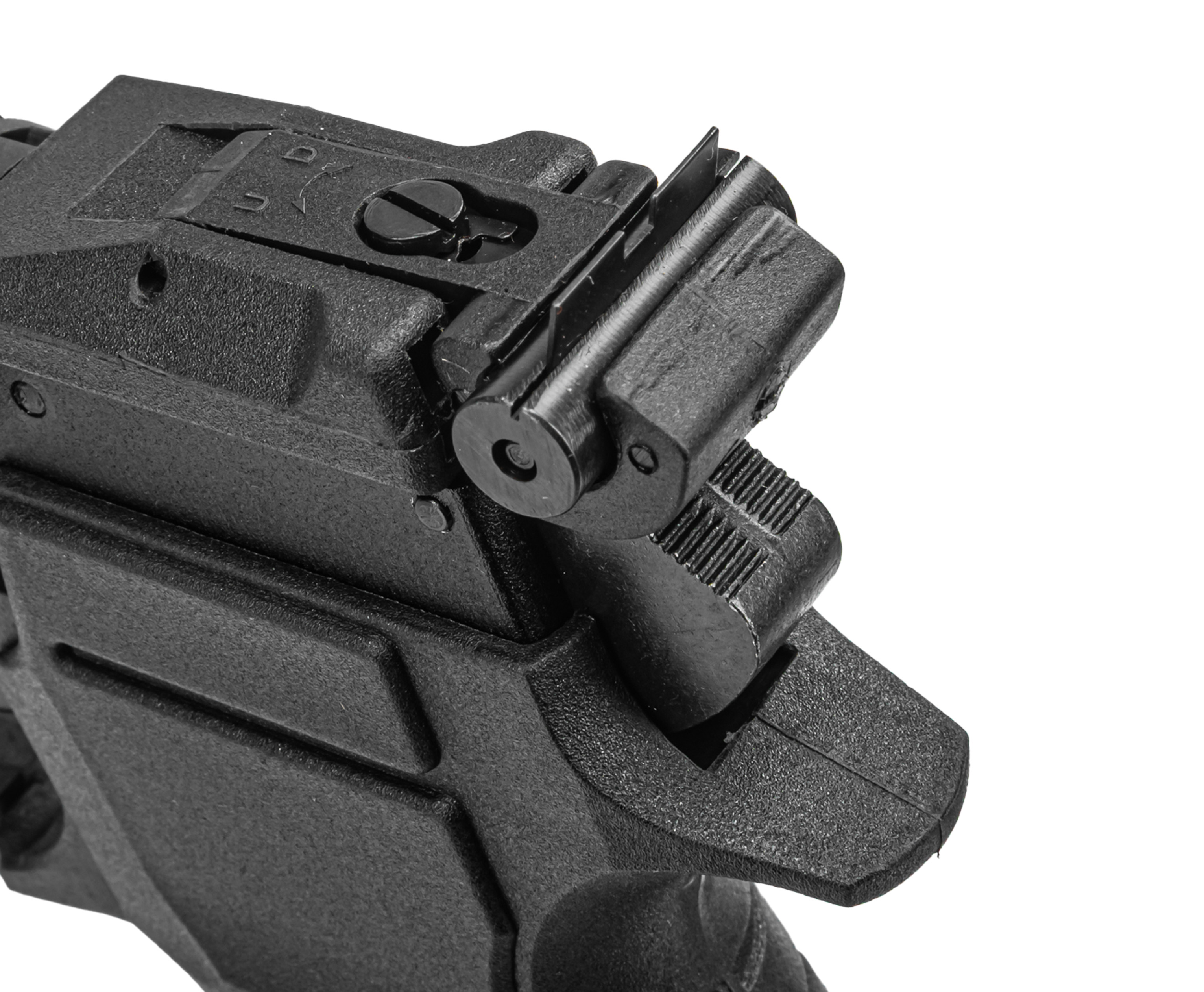 Для прицеливания здесь используется фиксированная мушка и целик нового образца, присутствующий только в текущем исполнении под маркировкой 10. Формы последнего сделали больше для комфорта оперативной настройки - поворотом маховичка можно менять положение прорези по горизонтали, а работа с винтом меняет вертикальное расположение. При этом курок оружия остается в доступе.