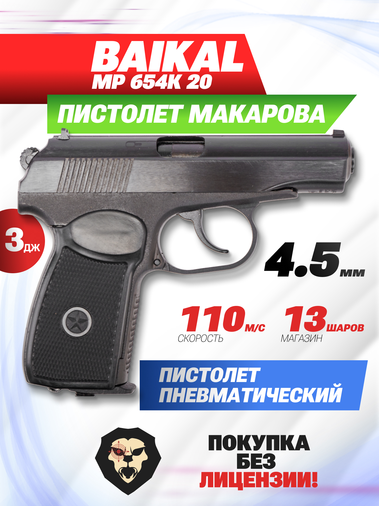 Пистолет Baikal МР-654К-20 выпускается заводом в соответствии с разрешенным на территории РФ показателем дульной энергии 3 Дж. Следовательно, для приобретения пневматического Макарова не потребуется получать разрешительные документы в Росгвардии - достаточно быть старше восемнадцати лет. Несмотря на это, мощности изделия хватает, чтобы разогнать боеприпас до 110-120 метров в секунду.