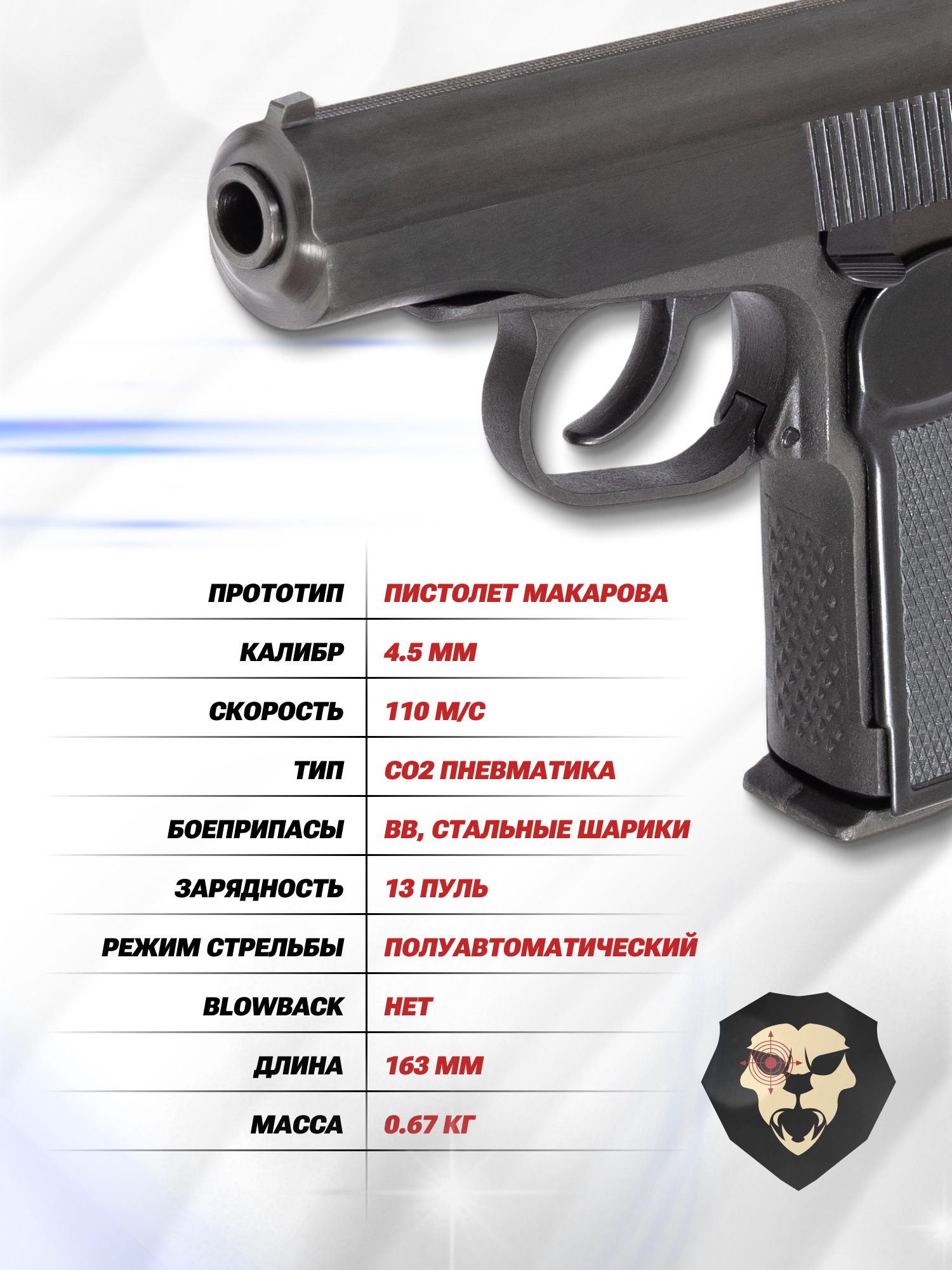 | Комплектация | Пистолет, магазин, набор уплотнителей, упаковка, краткая документация, копия сертификата (по запросу покупателя) |