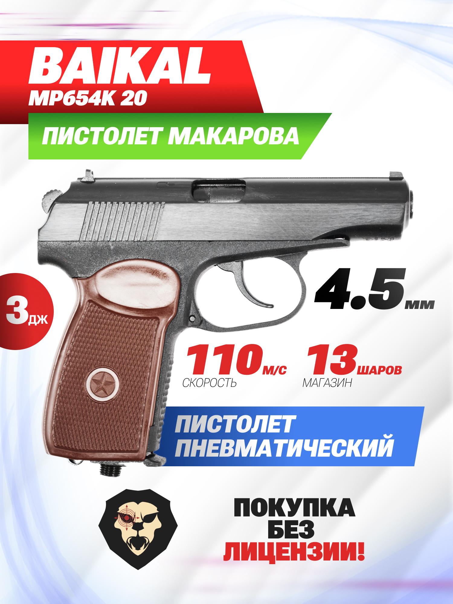 Пистолет Baikal МР-654К-20 выпускается заводом в соответствии с разрешенным на территории РФ показателем дульной энергии 3 Дж. Следовательно, для приобретения пневматического Макарова не потребуется получать разрешительные документы в Росгвардии - достаточно быть старше восемнадцати лет. Несмотря на это, мощности изделия хватает, чтобы разогнать боеприпас до 110-120 метров в секунду.