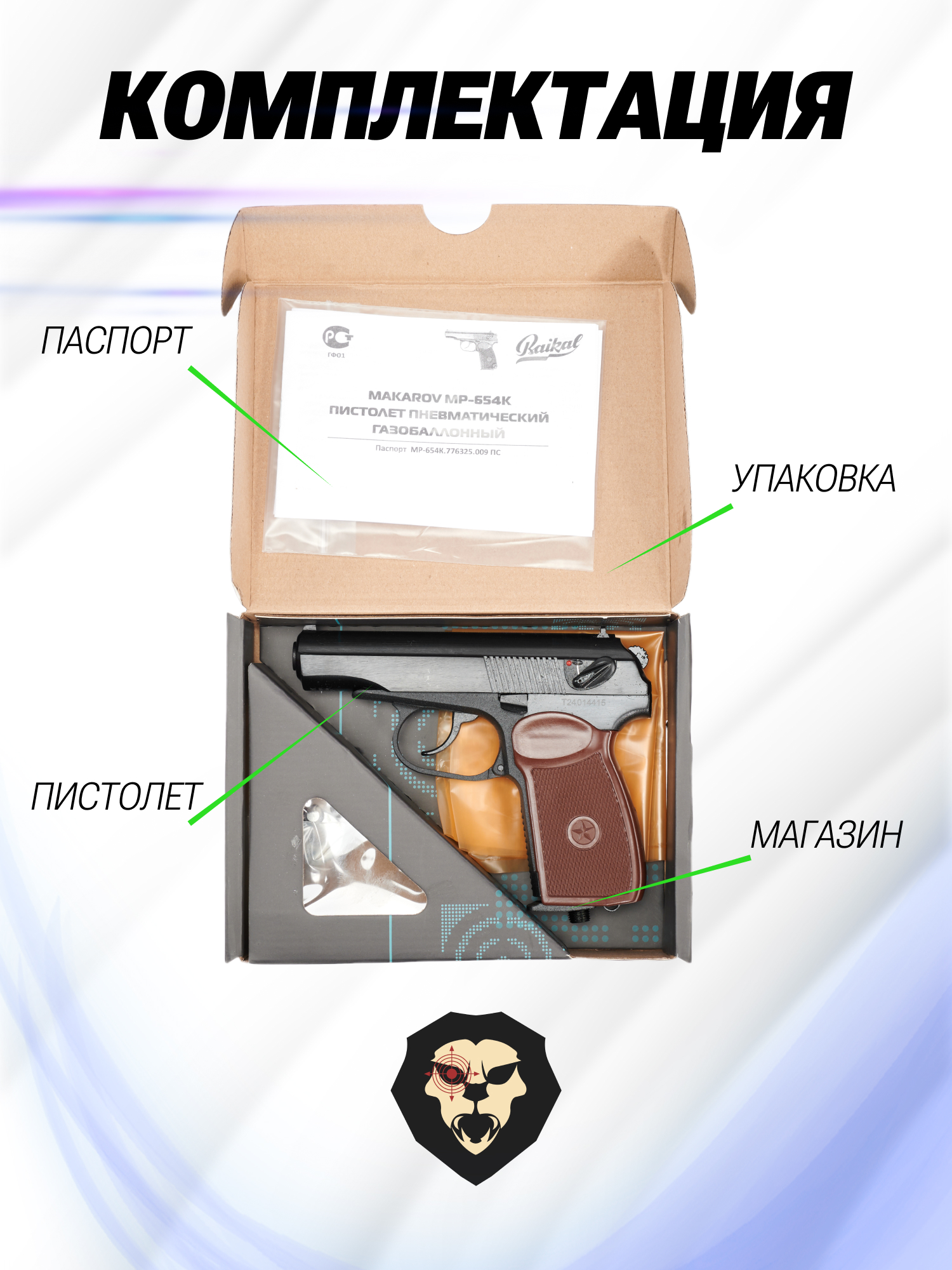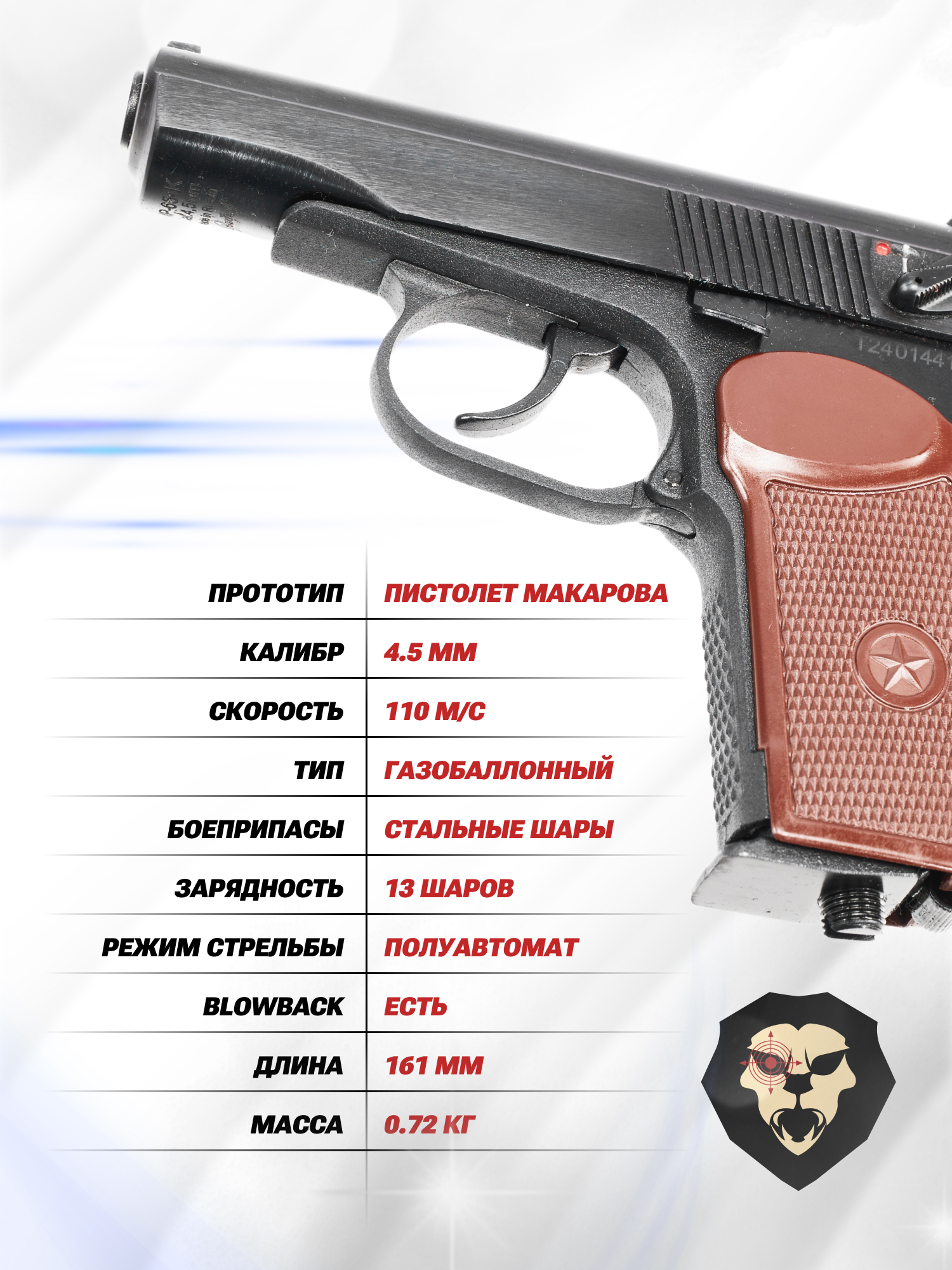 | Комплектация | Пистолет, магазин, набор уплотнителей, упаковка, краткая документация, копия сертификата (по запросу покупателя) |
