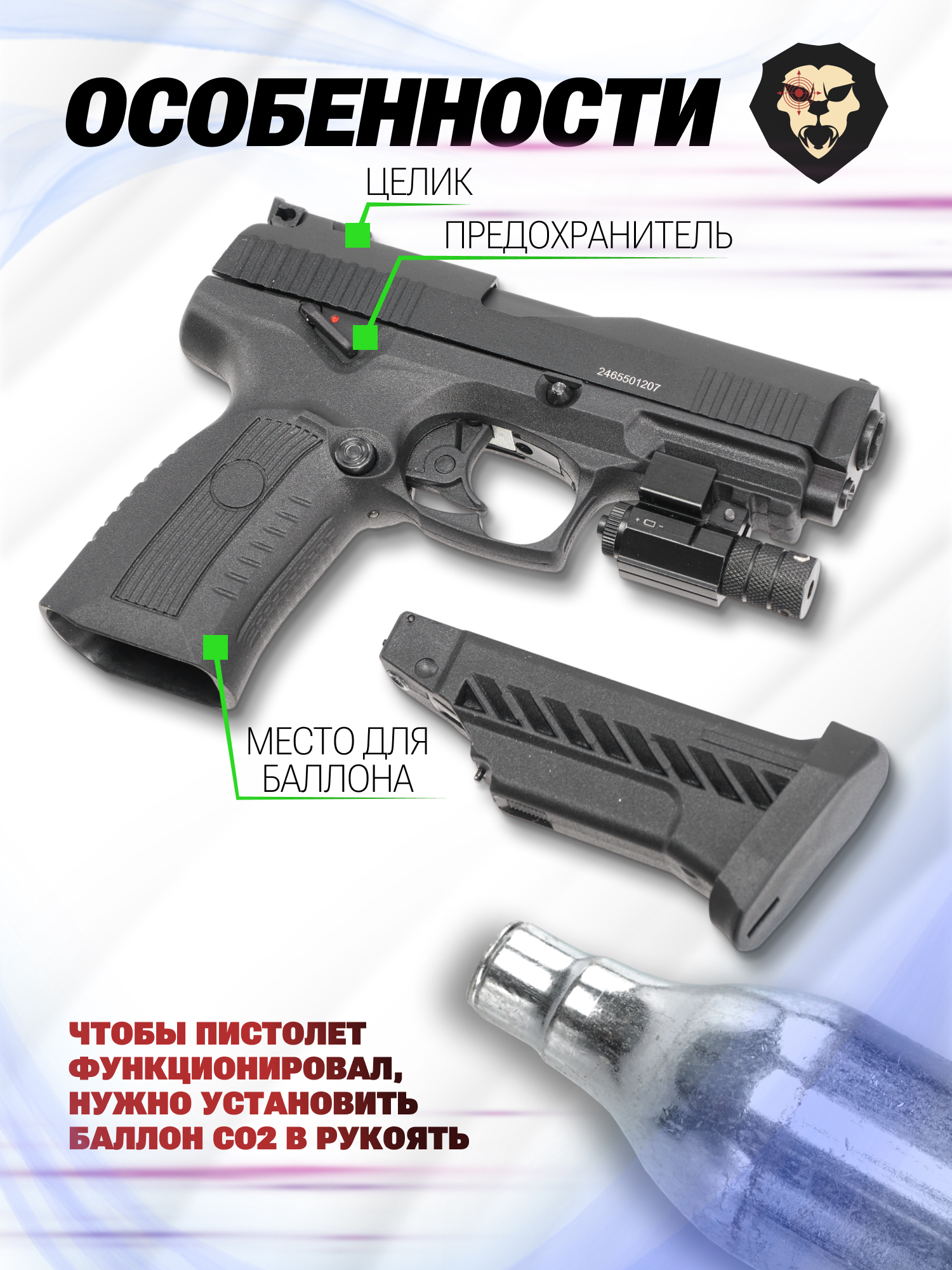 Запас шариков при этом можно хранить в отсеке классического пистолетного магазина, извлекаемого по нажатию круглой кнопки возле спусковой скобы. Однако его основная задача в данном исполнении - обеспечивать распределение углекислого газа. Он подается через клапан из одноразового баллончика CO2 12 грамм, который помещается в соответствующий отсек и поджимается винтом до прокола носовой части.