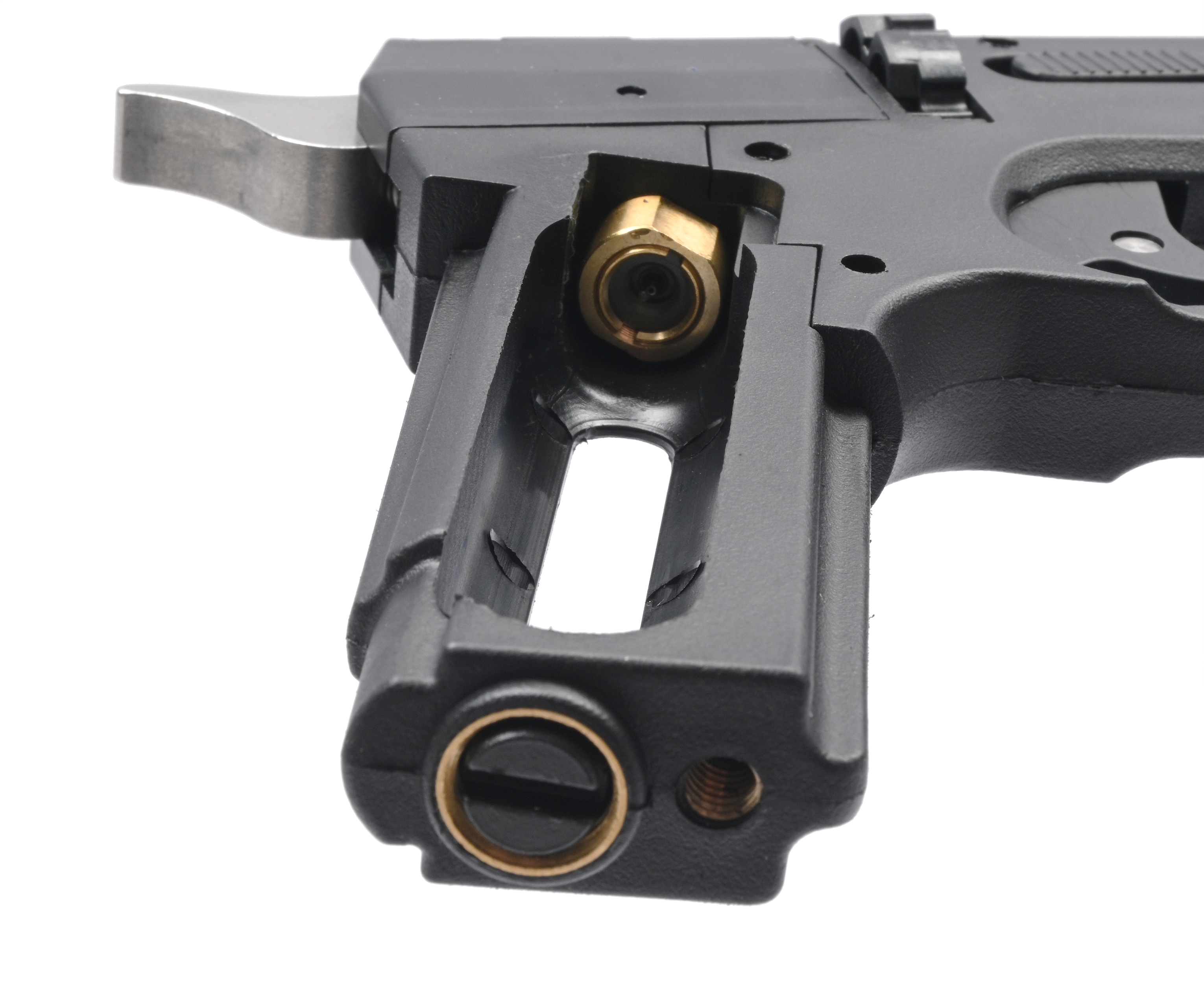 Пистолет относится к газобаллонному типу - пневматика функционирует за счет энергии паров углекислоты, заточенных в сменных емкостях. Баллончики CO2 на 12 грамм устанавливаются в специальную нишу внутри рукояти - для этого необходимо снять накладку. После размещения резервуара его потребуется затянуть прижимным винтом до накола носика, что сопровождается характерным шипящим звуком травления газа.