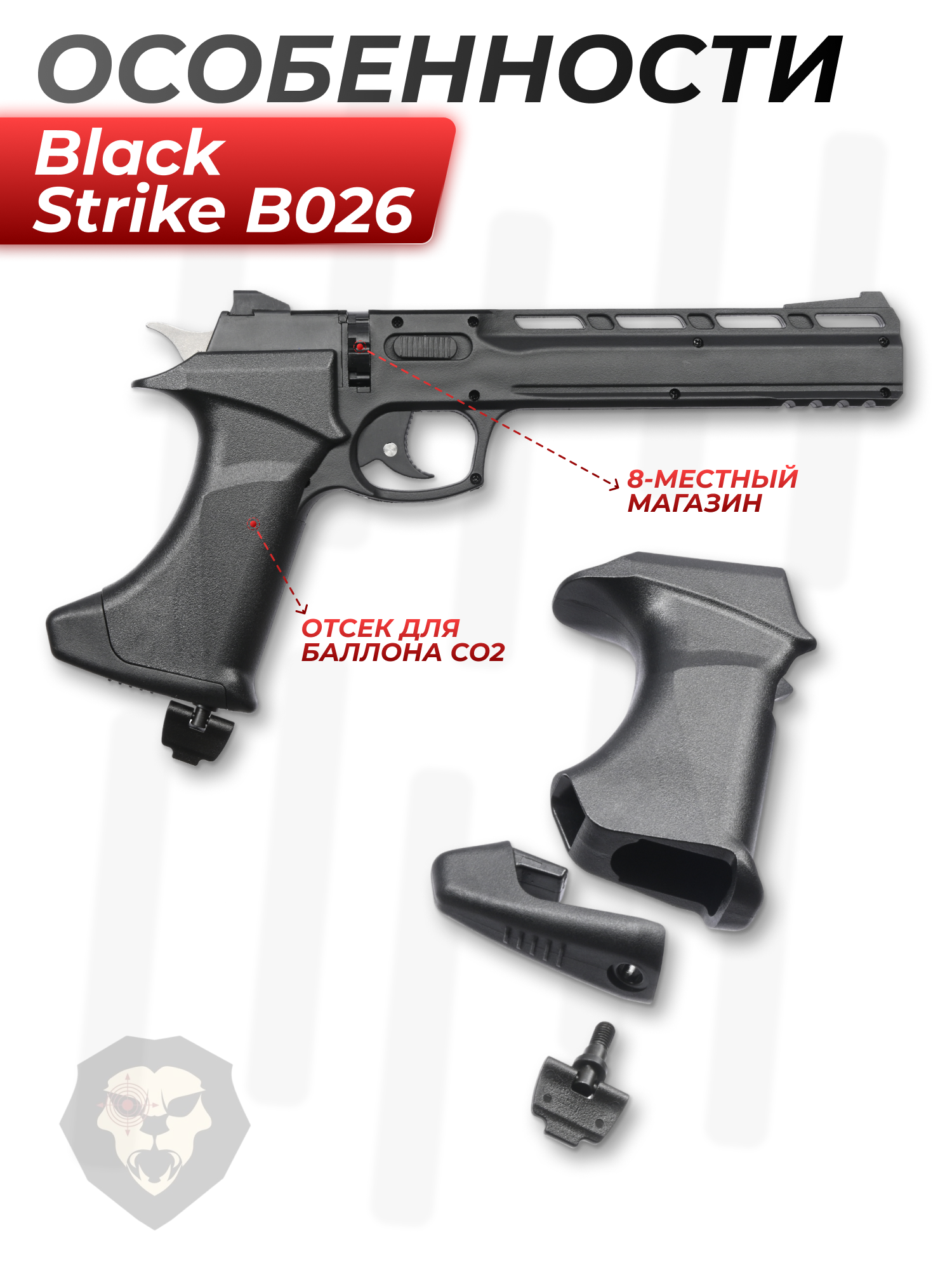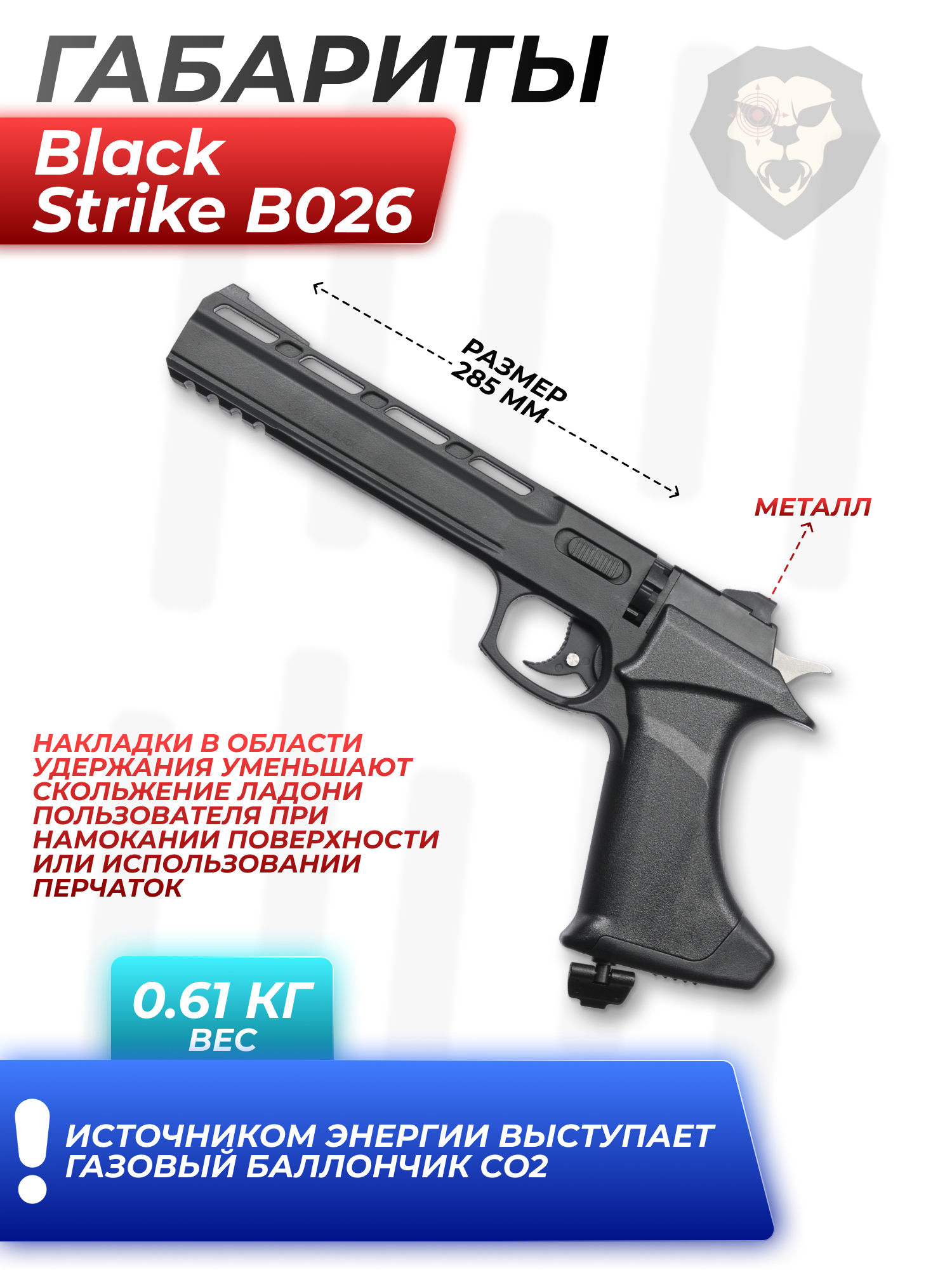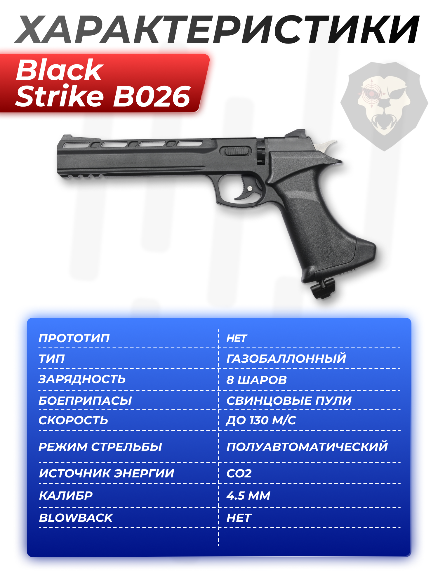 Информация о товаре "Пневматический пистолет Black Strike B026 4.5 мм (3 Дж, пулевой)" носит ознакомительный характер, и не является публичной офертой, определяемой положениями Статьи 437 Гражданского кодекса Российской Федерации, характеристики, внешний вид, цвет и комплектация могут быть изменены производителем без уведомления.