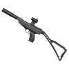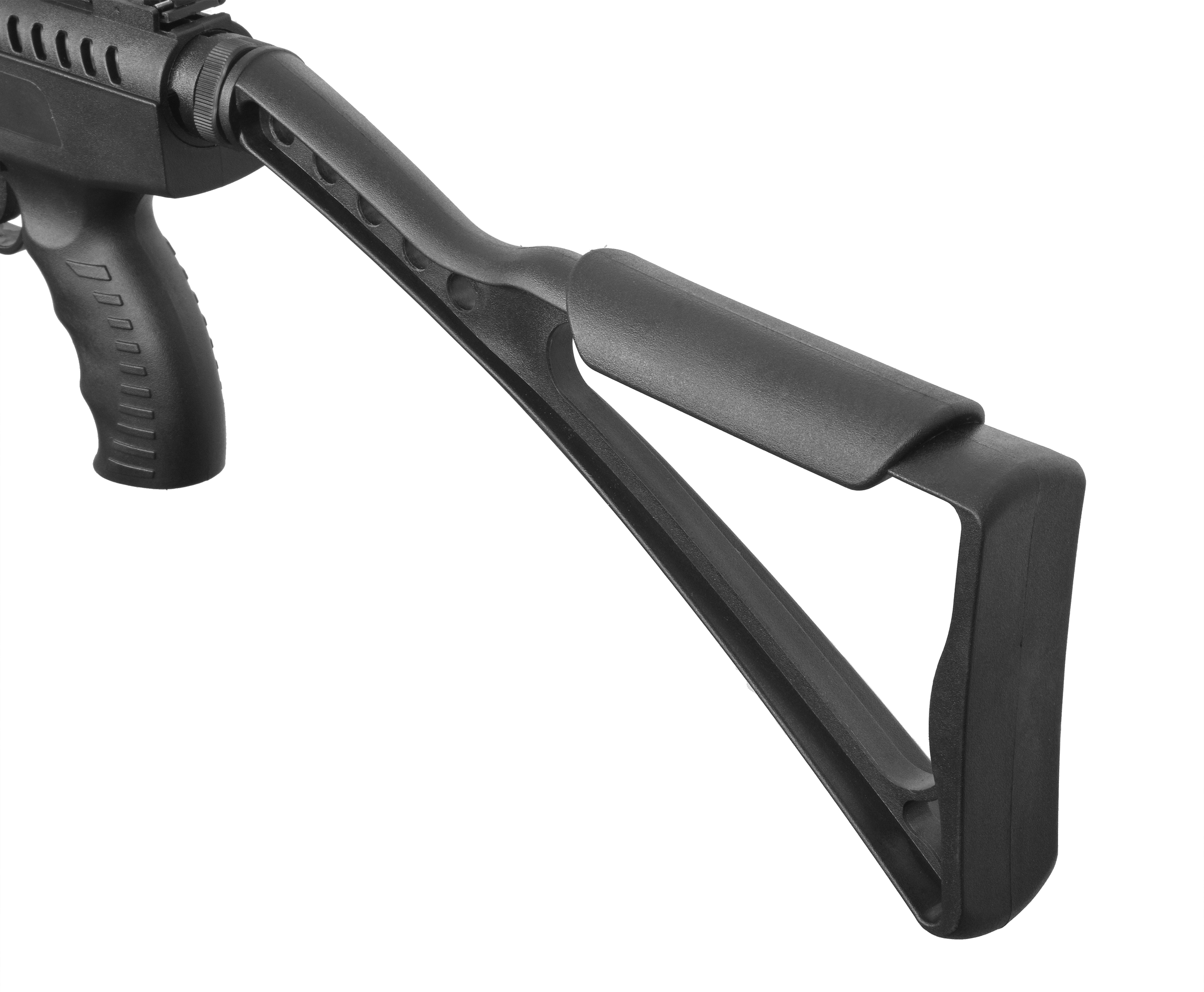 Образец S02 от фирмы Блек Страйк не совсем классический пистолет - в комплекте с этой моделью идет отъемный рамочный приклад, что позволяет стрелять из него с двух рук с упором в плечо, благодаря чему стрелок получает плюсы эргономики карабина оставаясь в то же время при компактном оружии. Для установки узла используется фиксация пазом, за счет чего конвертацию можно провести без инструмента - нужно только вставить шток приклада в ответную часть и провернуть до фиксации. При отсутствии необходимости в упоре последний демонтируют, снижая габарит с 625 мм до 450 мм - уменьшение длины сделает транспортировку комфортнее.