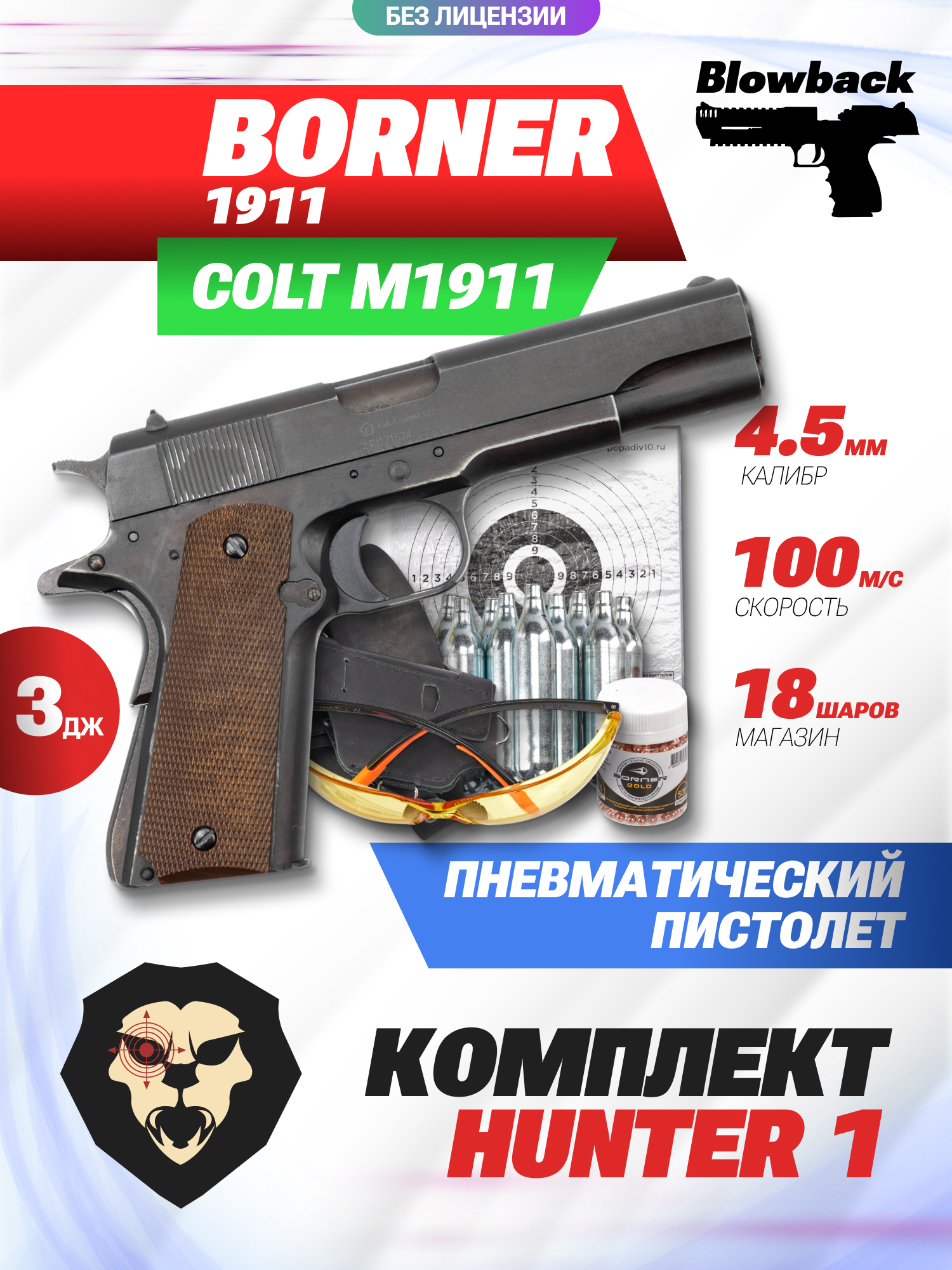 Пневматический пистолет Borner 1911 4.5 мм комплект Hunter №1 (Colt, кобура, шарики, баллончики, очки, мишени, Blowback) купить в интернет-магазине Popadiv10.