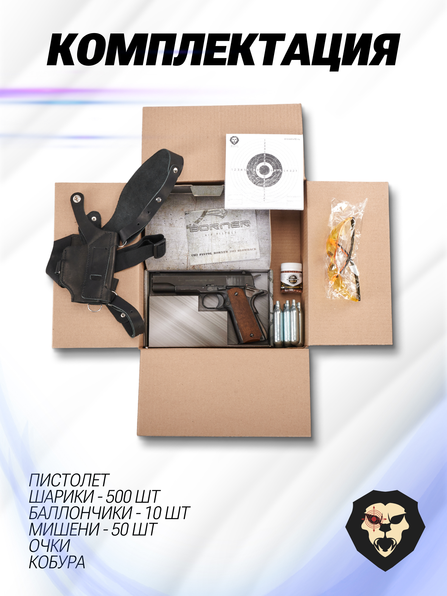 Информация о товаре "Пневматический пистолет Borner 1911 4.5 мм комплект Hunter №1 (Colt, кобура, шарики, баллончики, очки, мишени, Blowback)" носит ознакомительный характер, и не является публичной офертой, определяемой положениями Статьи 437 Гражданского кодекса Российской Федерации, характеристики, внешний вид, цвет и комплектация могут быть изменены производителем без уведомления.