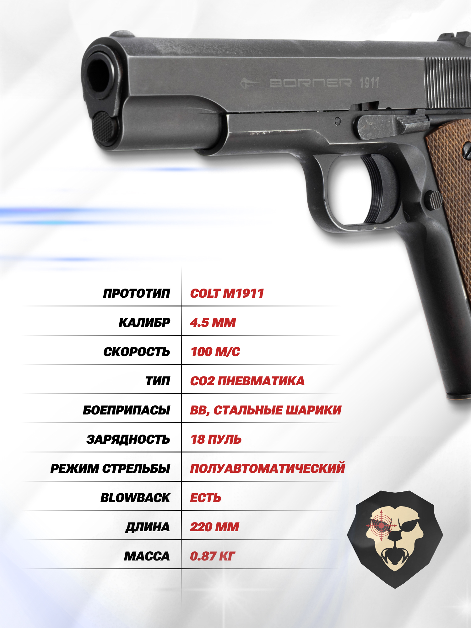 Выбирая пневматическое оружие, многие отдают предпочтение продукции фирмы Borner. Изделия бренда получили популярность благодаря высокому качеству исполнения, надежности и максимально аутентичной передаче визуальной составляющей прототипов. Не стала исключением обозреваемая модель, которая в мельчайших деталях воссоздает знаменитый Кольт 1911.