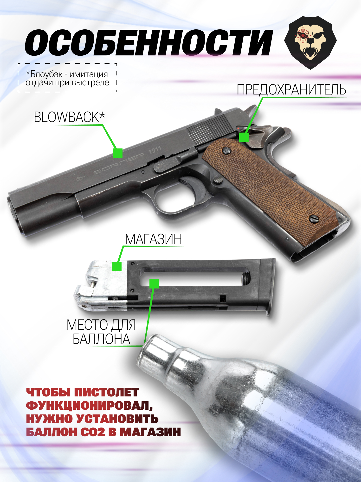 Перед первым нажатием на триггер потребуется взвести затвор. Выпускаемые заряды развивают скорость до ста метров в секунду. Пистолет Borner 1911 Blowback соответствует разрешенному на территории РФ показателю мощности три Джоуля, ввиду чего не требует оформления разрешения на покупку.