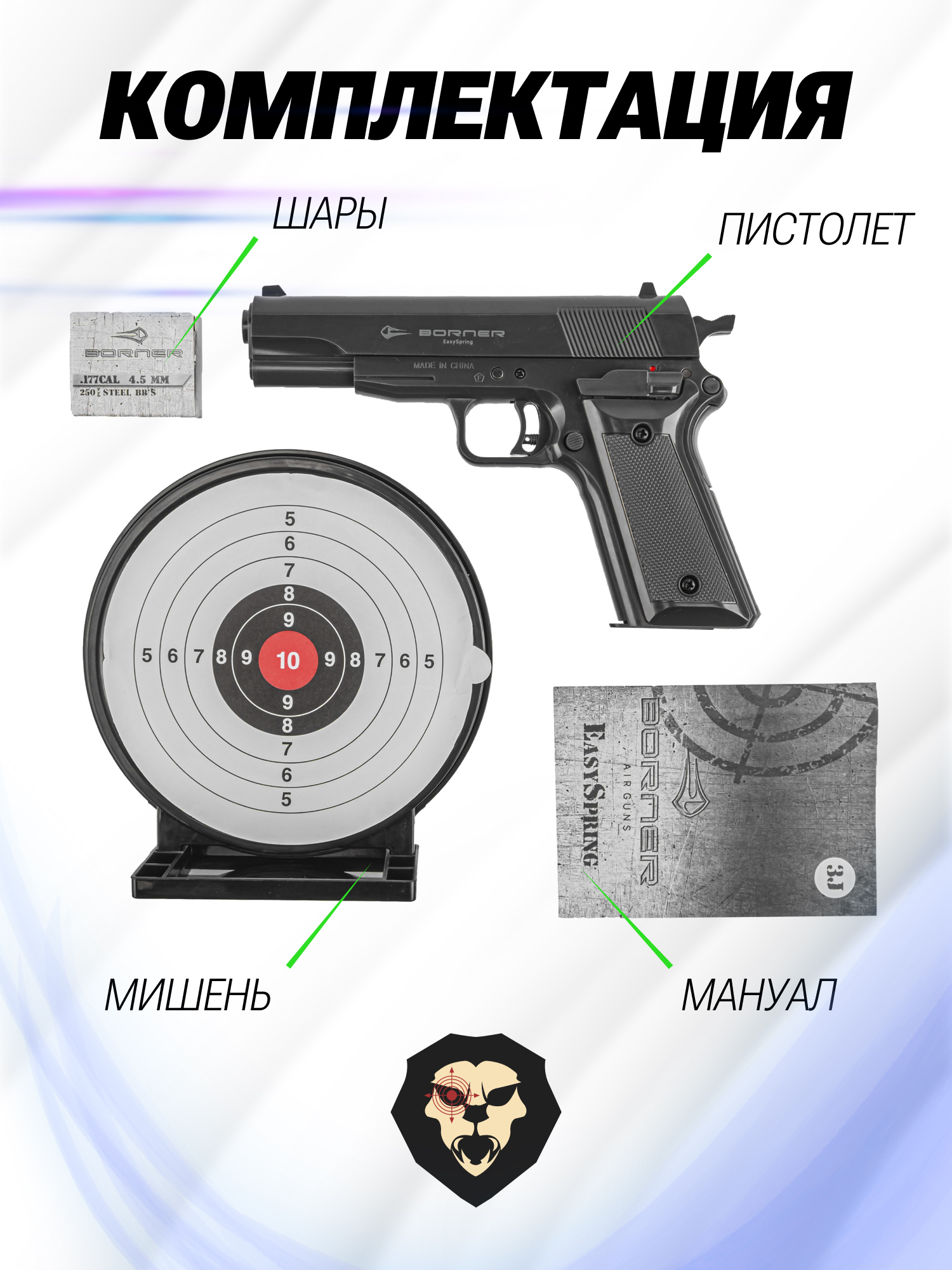 Информация о товаре "Пневматический пистолет Borner Easy Spring 4.5 мм (3 Дж, спринговый)" носит ознакомительный характер, и не является публичной офертой, определяемой положениями Статьи 437 Гражданского кодекса Российской Федерации, характеристики, внешний вид, цвет и комплектация могут быть изменены производителем без уведомления.