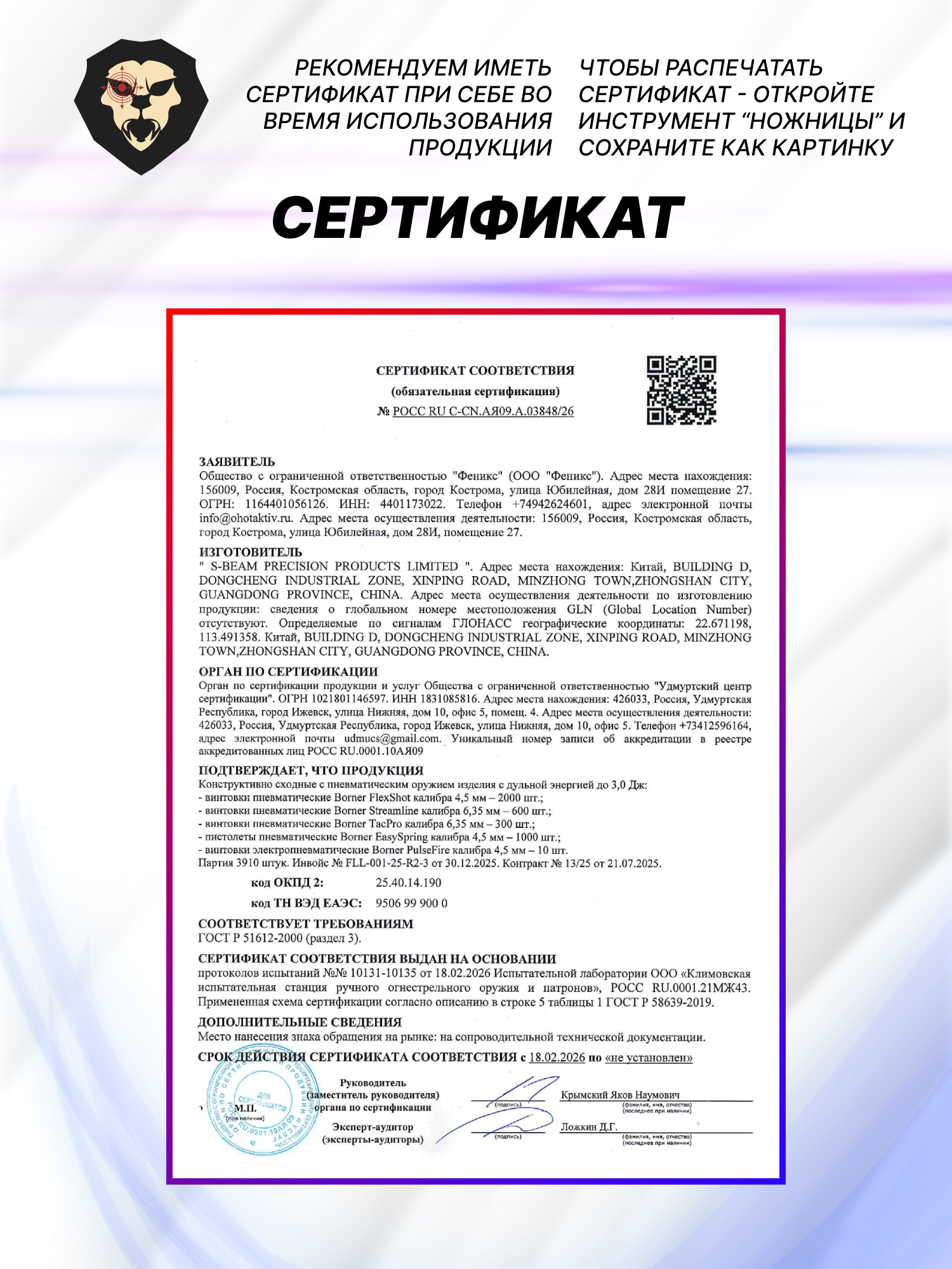 | Комплектация | Пистолет, магазин, упаковка, краткая документация, копия сертификата (по запросу покупателя) |