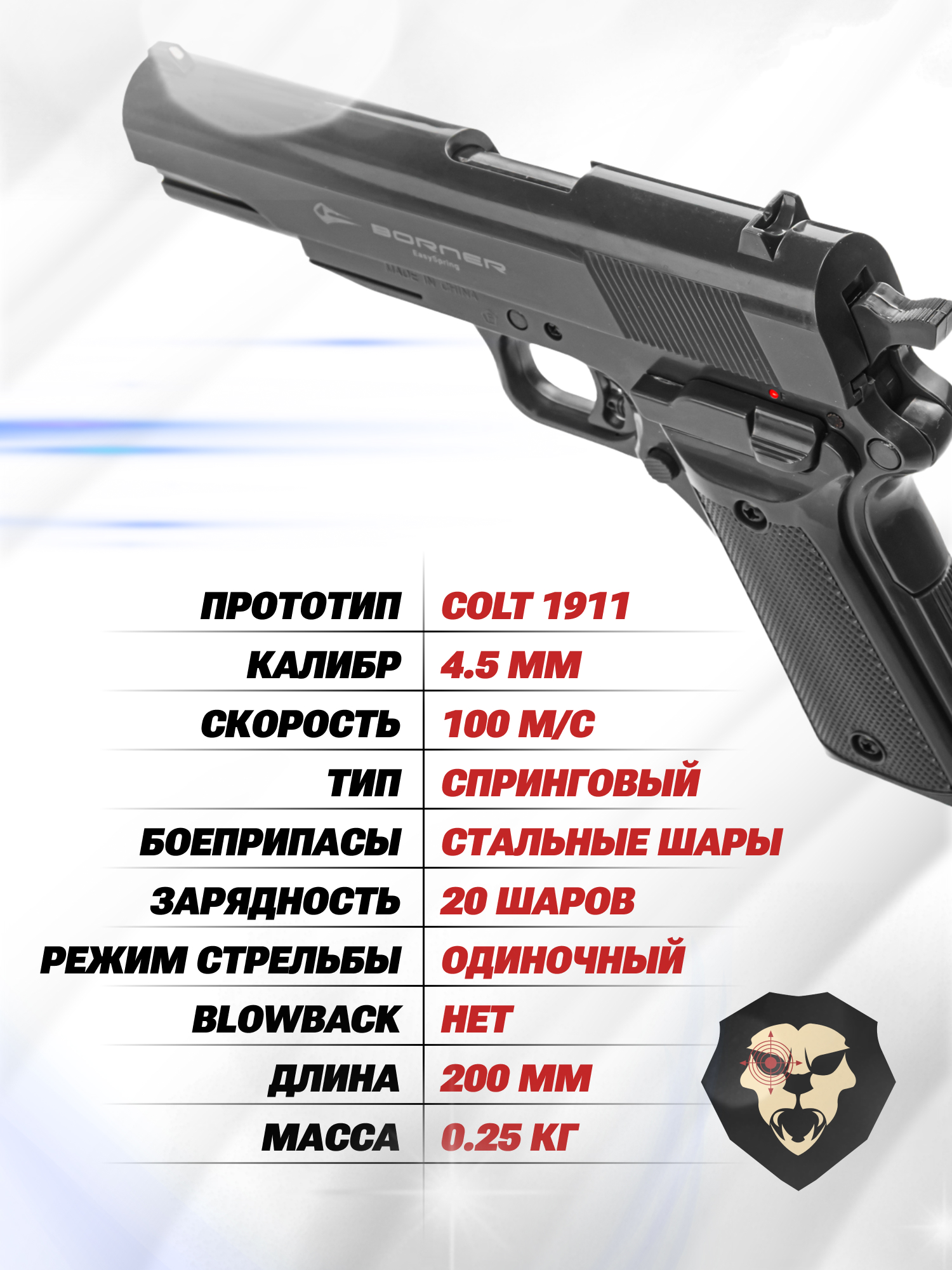 Пистолет Борнер выпускает шары со скоростью до 100 метров в секунду. Этого показателя предостаточно для использования пневматики в большинстве развлекательных сценариев, будь то стрельба по бумажным мишеням или плинкинг. При этом модель не требует специального разрешения и приобретается свободно всеми совершеннолетними гражданами.