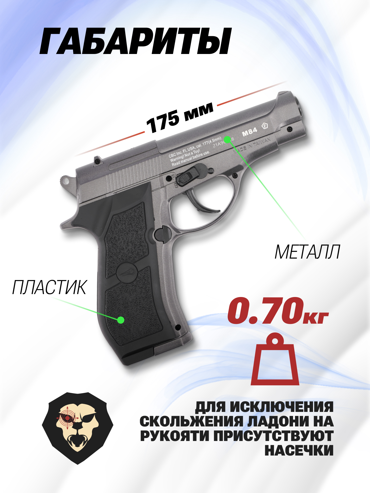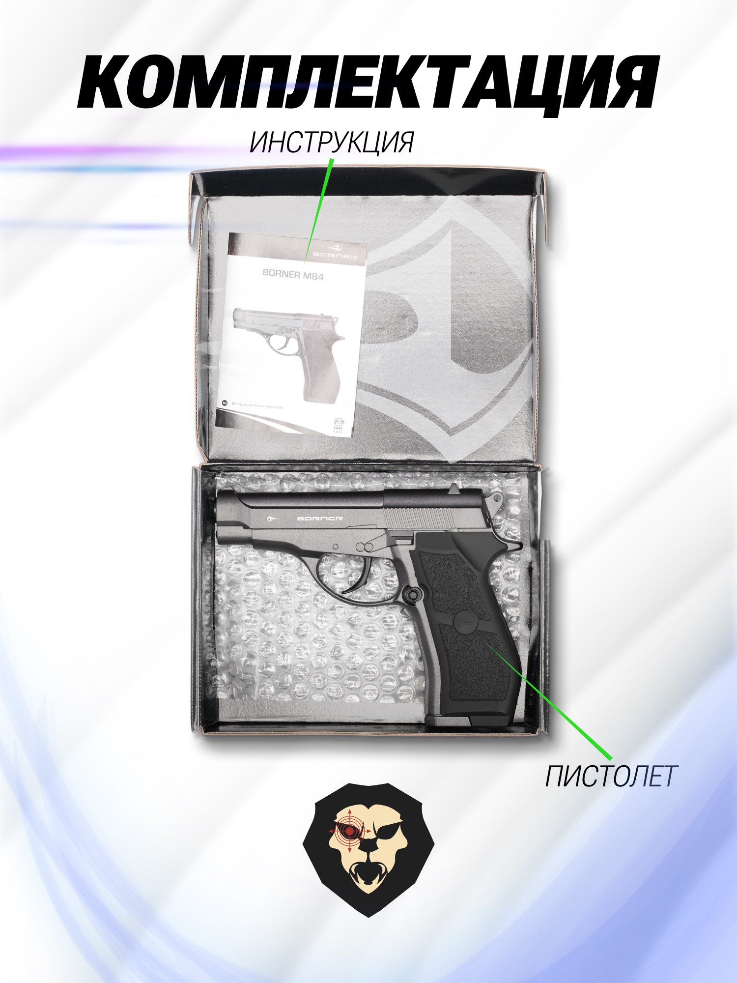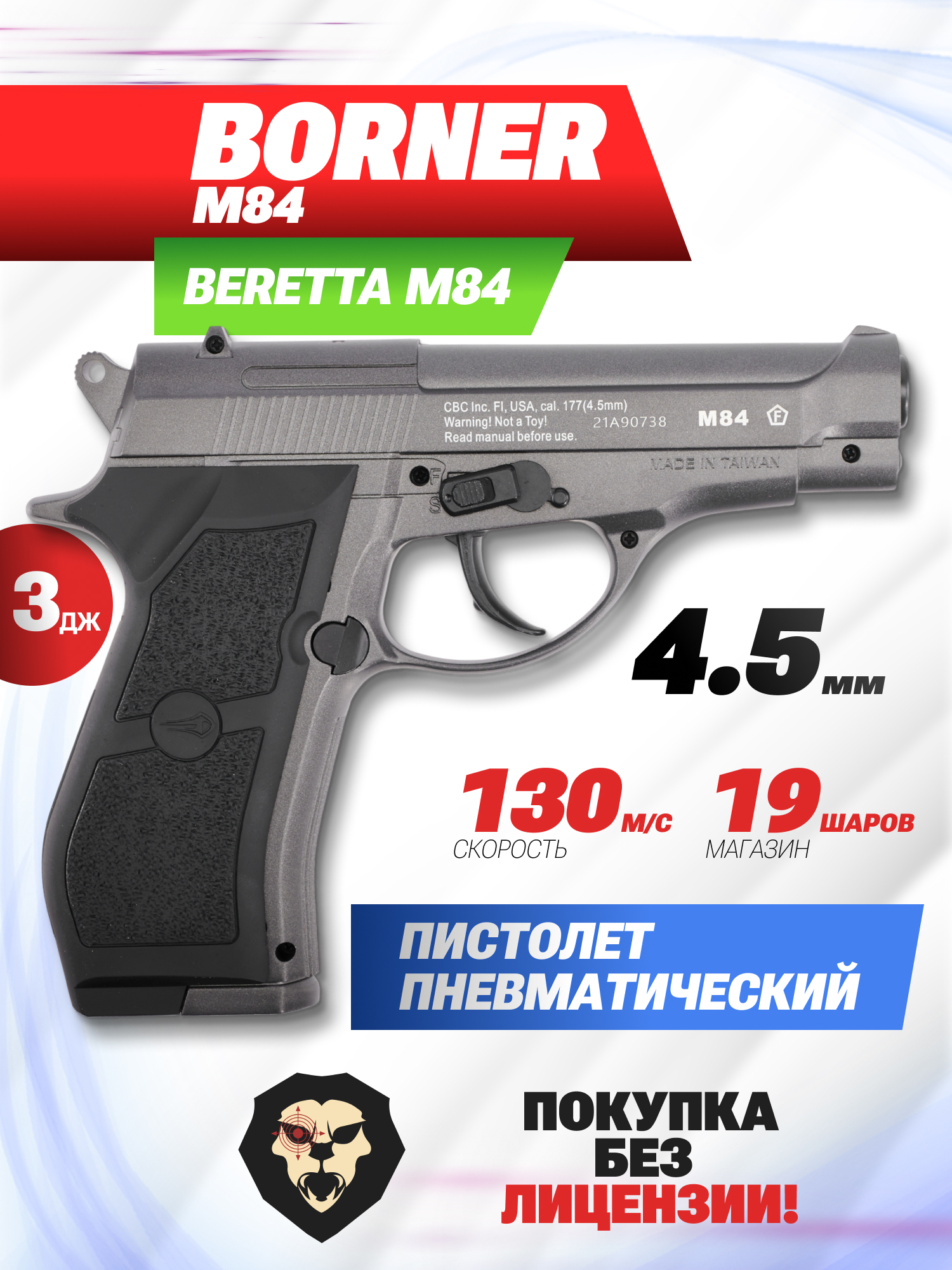 Информация о товаре "Пневматический пистолет Borner M84 4.5 мм (Beretta M84)" носит ознакомительный характер, и не является публичной офертой, определяемой положениями Статьи 437 Гражданского кодекса Российской Федерации, характеристики, внешний вид, цвет и комплектация могут быть изменены производителем без уведомления.