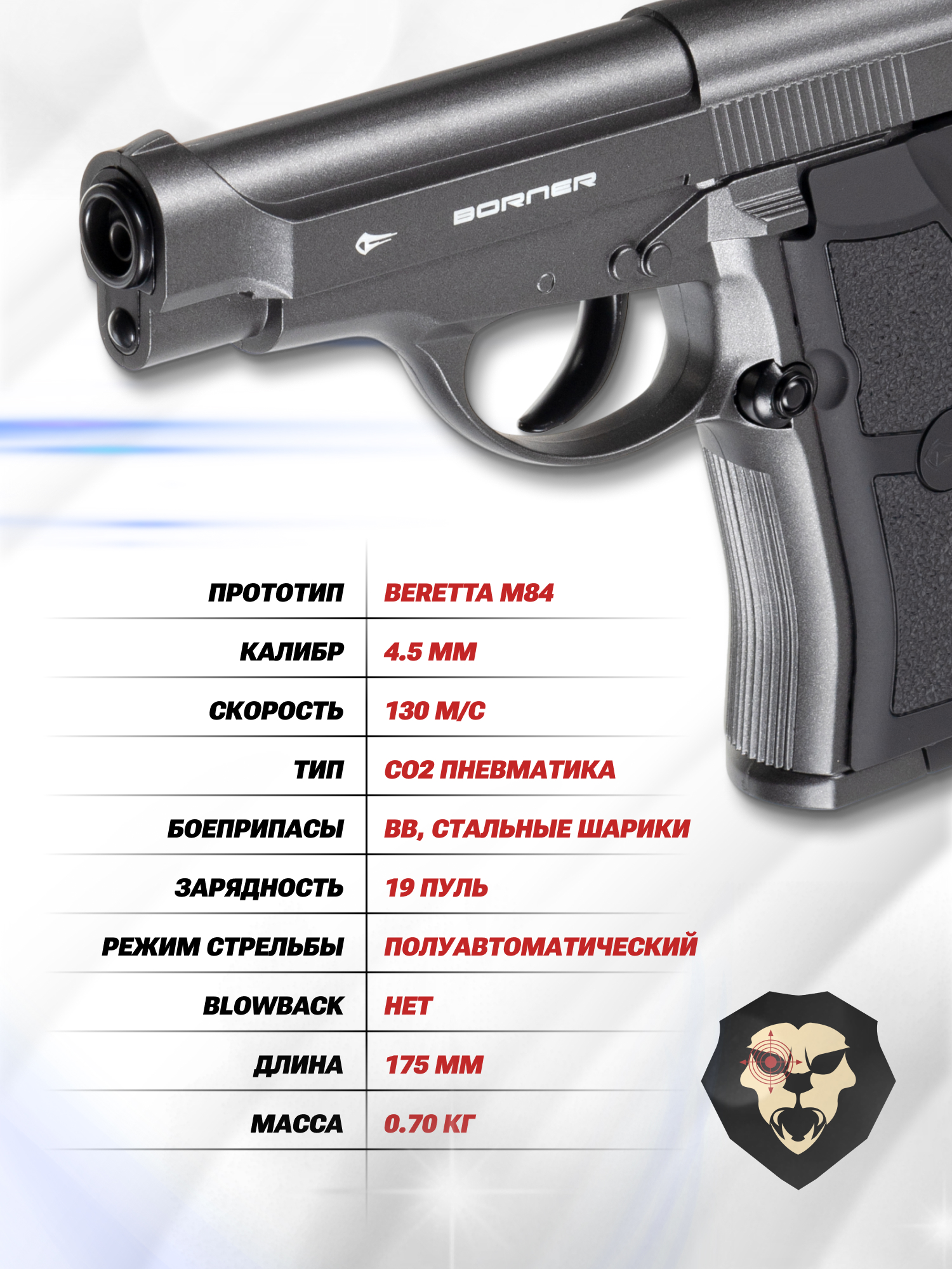 Рынок пневматических газобаллонных пистолетов наполнен множеством различных образцов, которые придутся по вкусу каждому стрелку. Внимания стрелков заслуживает короткоствольная пневматика, выполненная по образу существующих на вооружении образцов пистолетов разных стран мира. Изготавливается такое оружие американской компанией Borner, которая представила новый пистолет Borner M84.