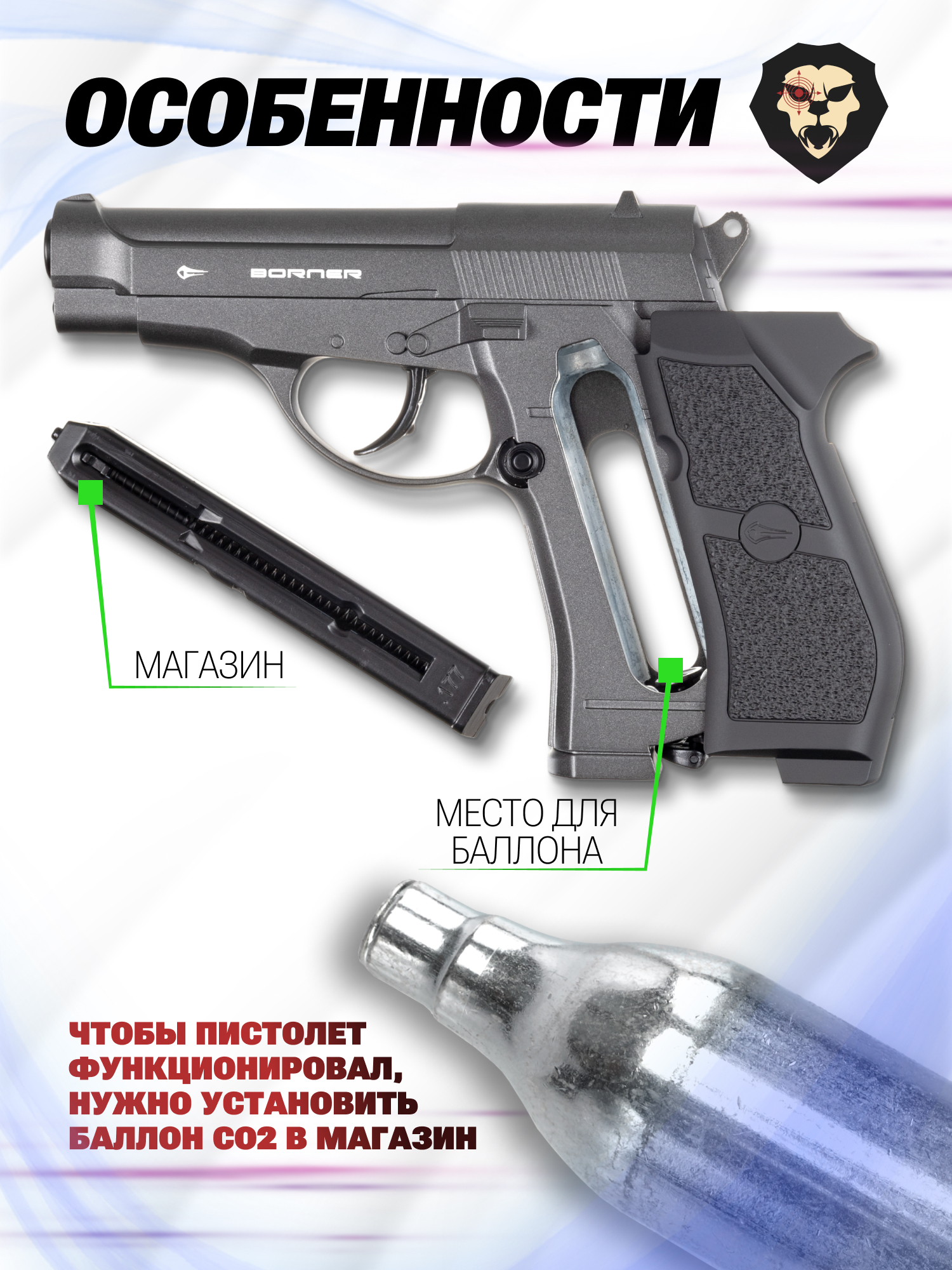Пневматическая реплика пистолета от компании Borner выпускается с гладким металлическим стволом, калибр которого дает применять стальные шарики с диаметром 4.5 миллиметра. Боепитание происходит с помощью однорядного магазина, в котором размещается до 19 пулевых снарядов. Устанавливается магазин в рукояти пистолета.