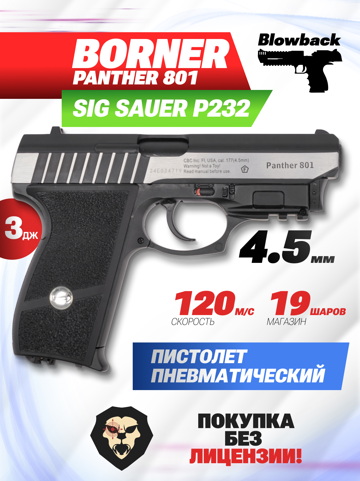 Американский бренд Borner уже больше двадцати лет поставляет пневматику на территорию России и утвердила себя, как надежный производитель, специализируясь на пневматических копиях широко известных покупателям пистолетов. Одним из таких стала модель Sig Sauer P232L выпущенная в 1996 году стоящая на вооружении специальных ведомств стран первого эшелона, таких как Япония, Швеция и США. На основе Зиг Зауэра компания выпустила газобаллонный пневматический пистолет Borner Panther 801, полностью копирующий внешний вид огнестрельного прототипа.