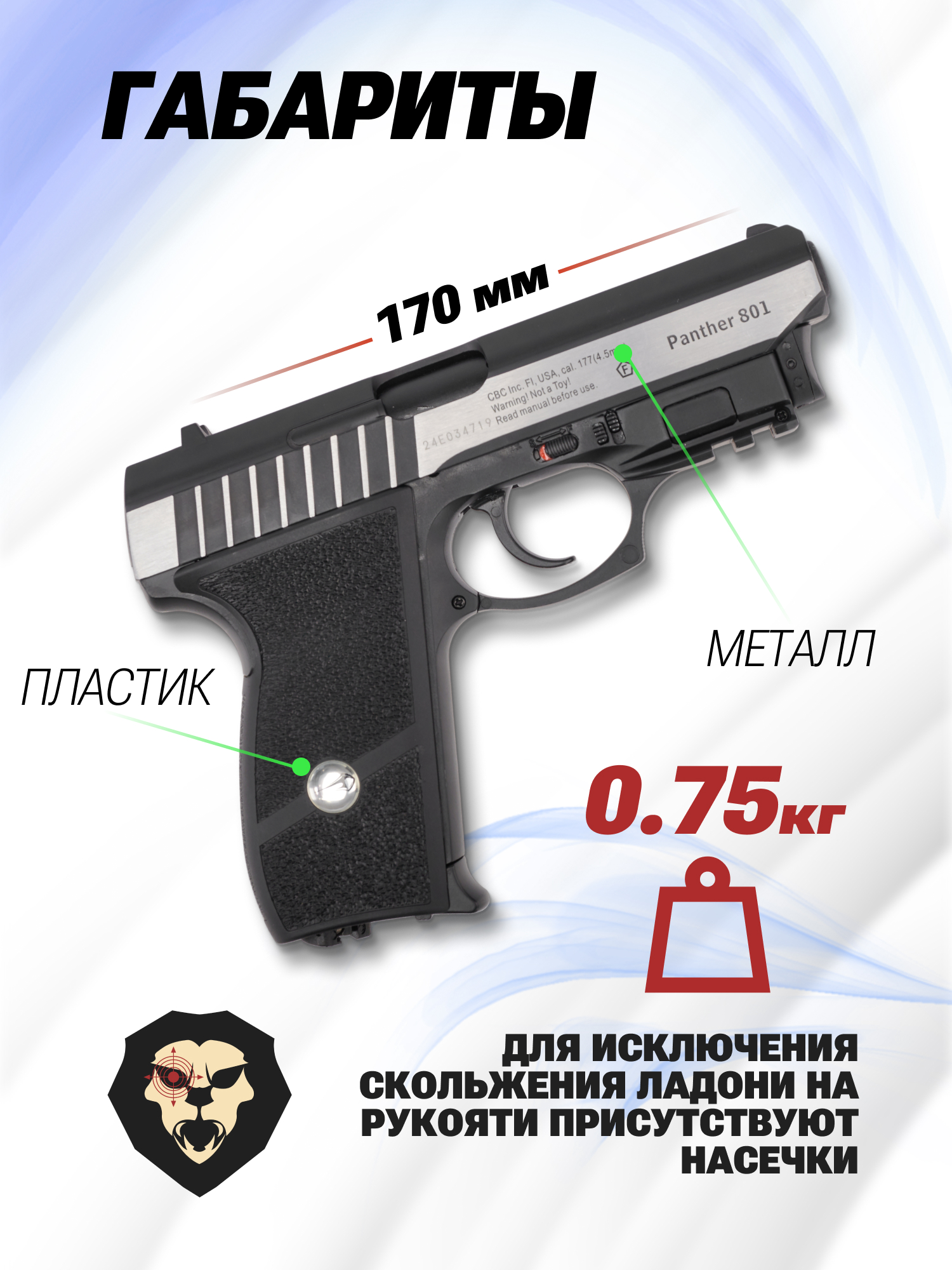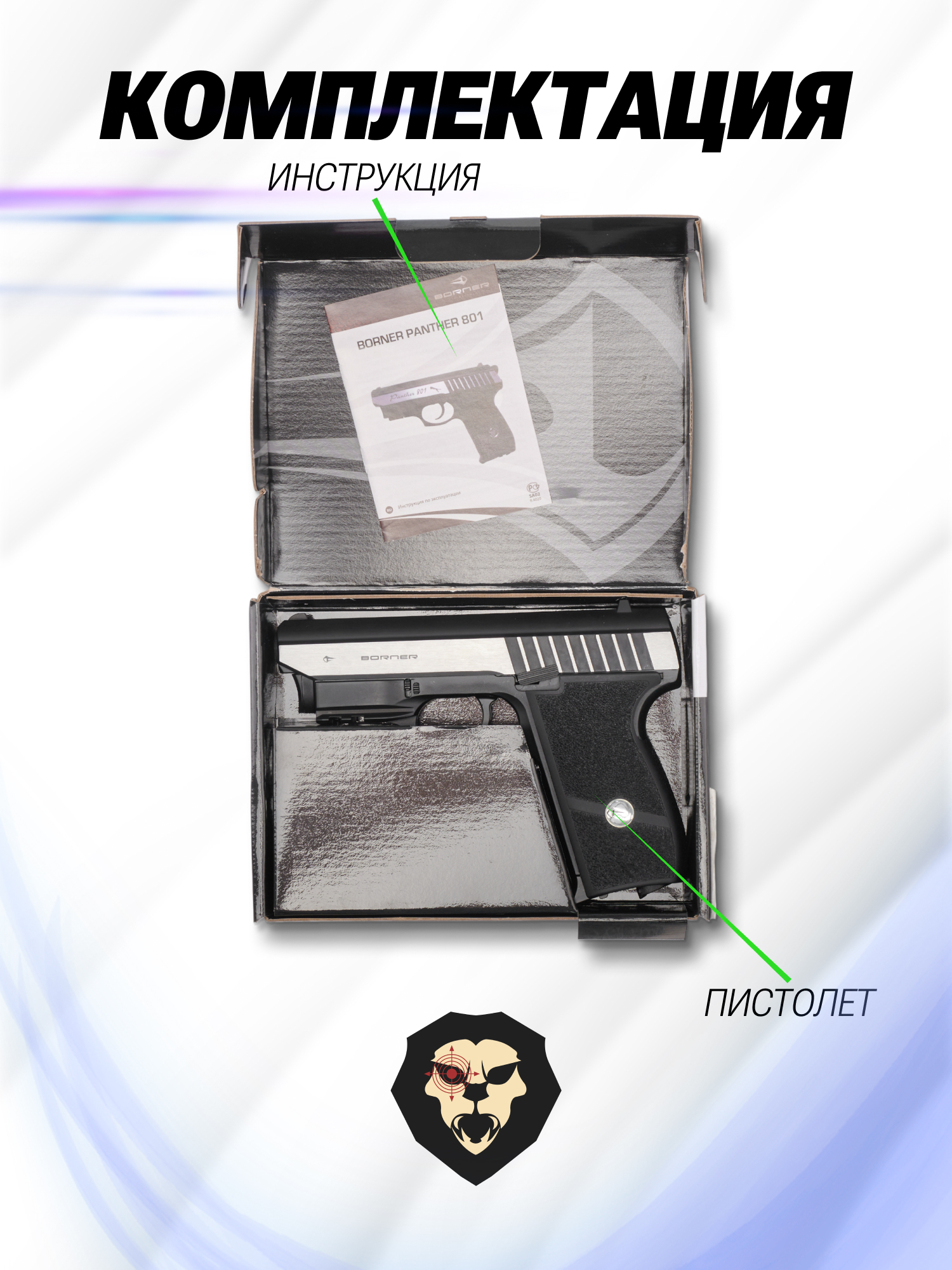 Модель Пантер отличается компактными размерами в 210 миллиметров и весом менее 800 грамм, за счет использования облегченного и ударопрочного пластика в основе рамки и рукояти пистолета. Затворная рама и внутренние компоненты изделия выполнены из металлического сплава, что делает пневматический пистолет Борнер Пантера 801 устойчивым ко всевозможным видам нагрузок и интенсивной стрельбе.