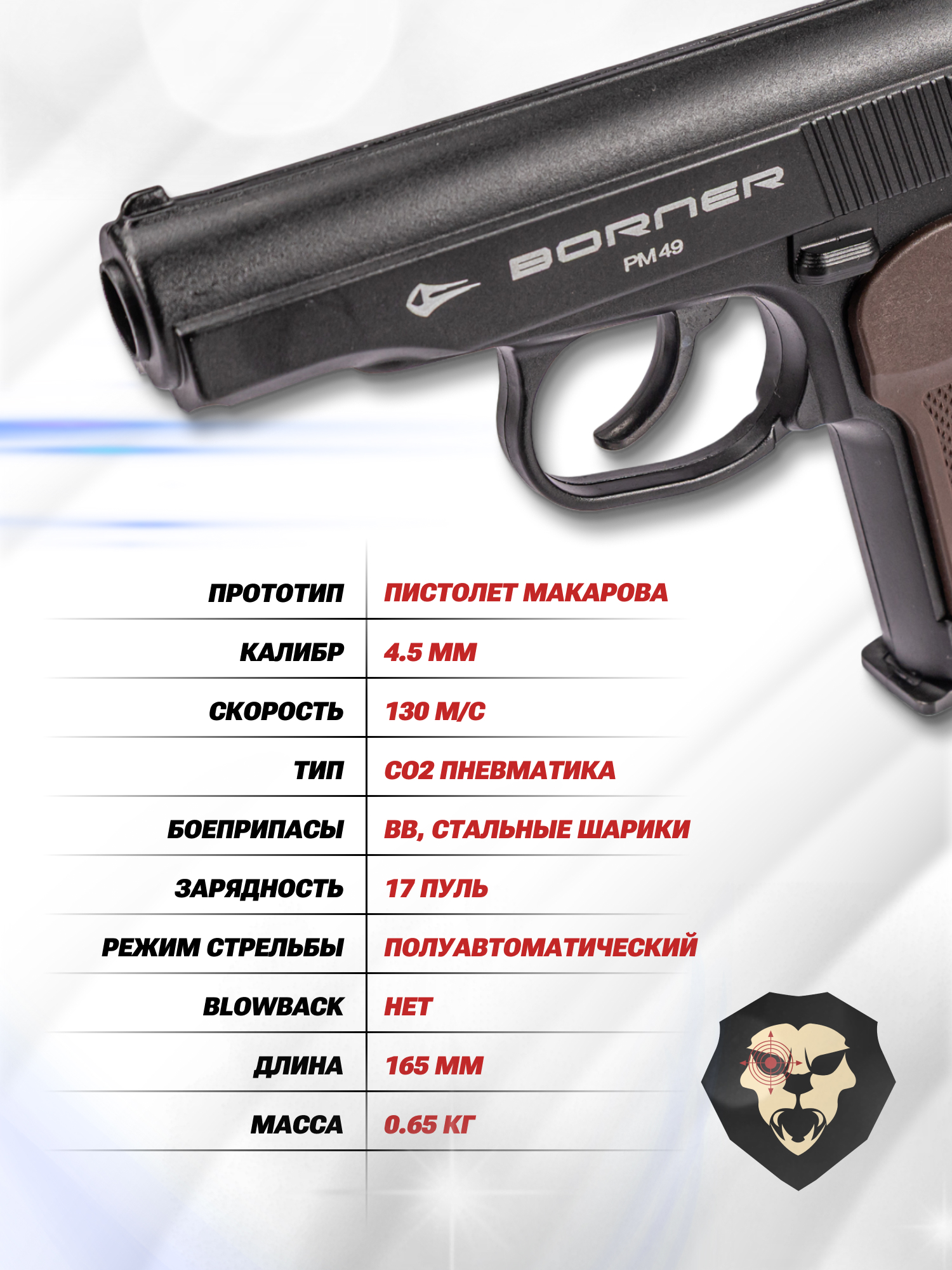 Информация о товаре "Пневматический пистолет Макарова Borner ПМ49 (4.5 мм)" носит ознакомительный характер, и не является публичной офертой, определяемой положениями Статьи 437 Гражданского кодекса Российской Федерации, характеристики, внешний вид, цвет и комплектация могут быть изменены производителем без уведомления.