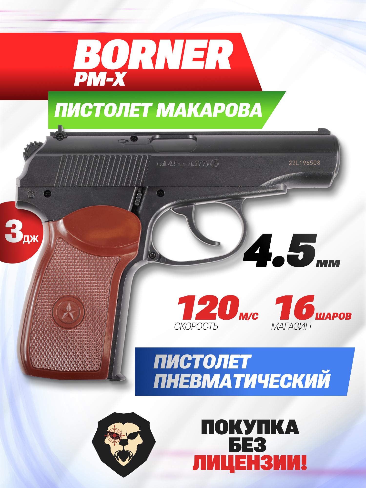 Подобная репутация делает «Макаров» популярным и в области пневматики – это один из наиболее реплицируемых образцов вооружения среди производителей «воздушек». К подобным репликам относится и пистолет пневматический Borner PM-X 4.5-миллиметрового калибра, созданный базирующейся в США компанией Борнер. Бренд знаменит примечательным ассортиментом не самых дорогих, но надежных образцов пневматики.