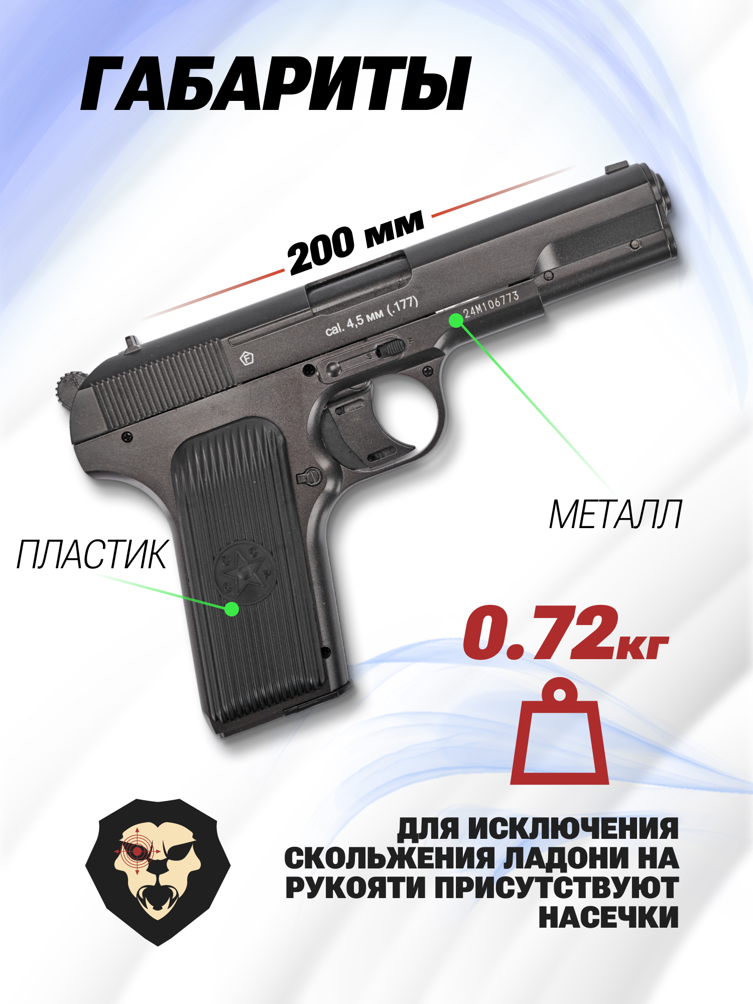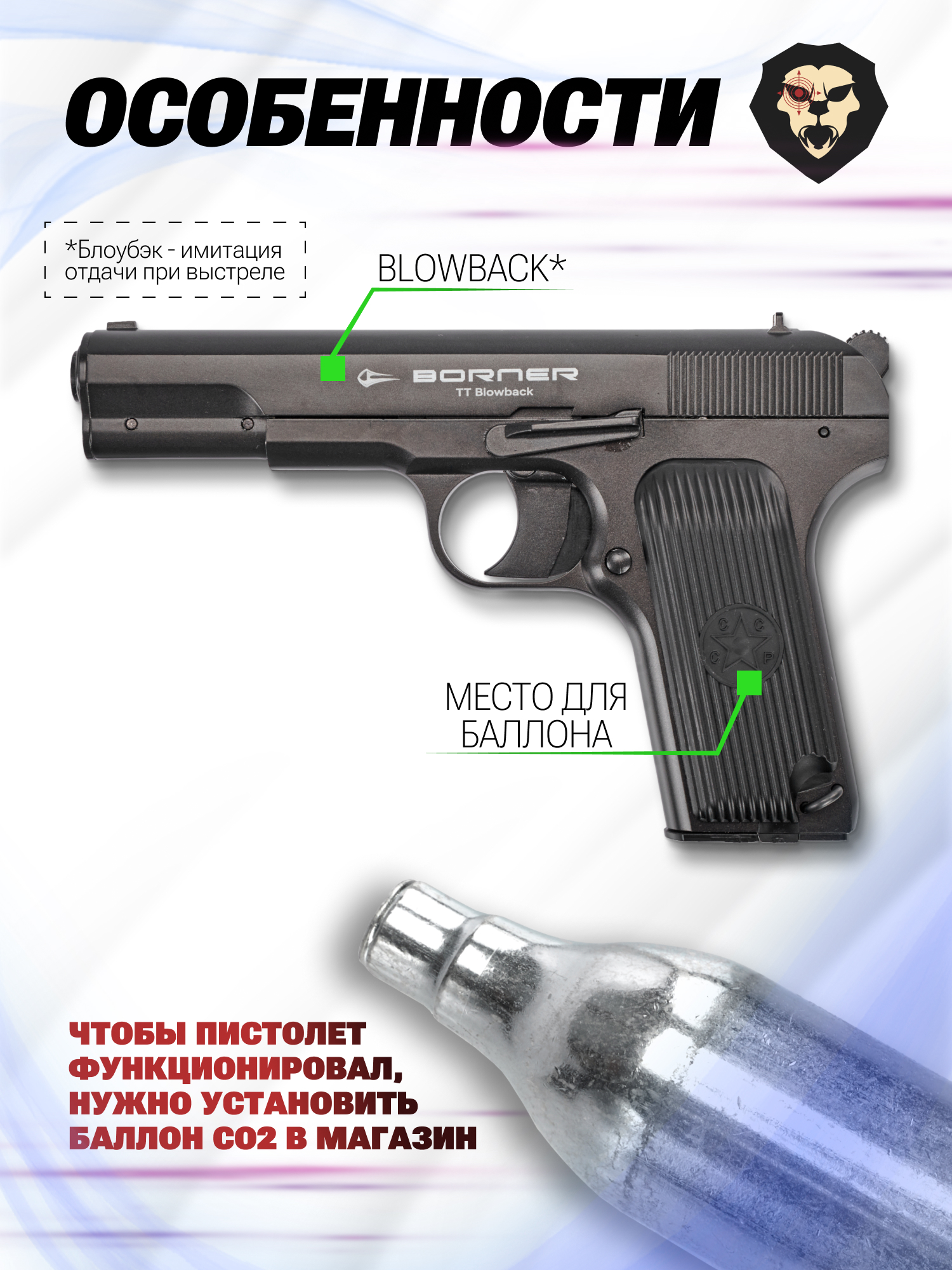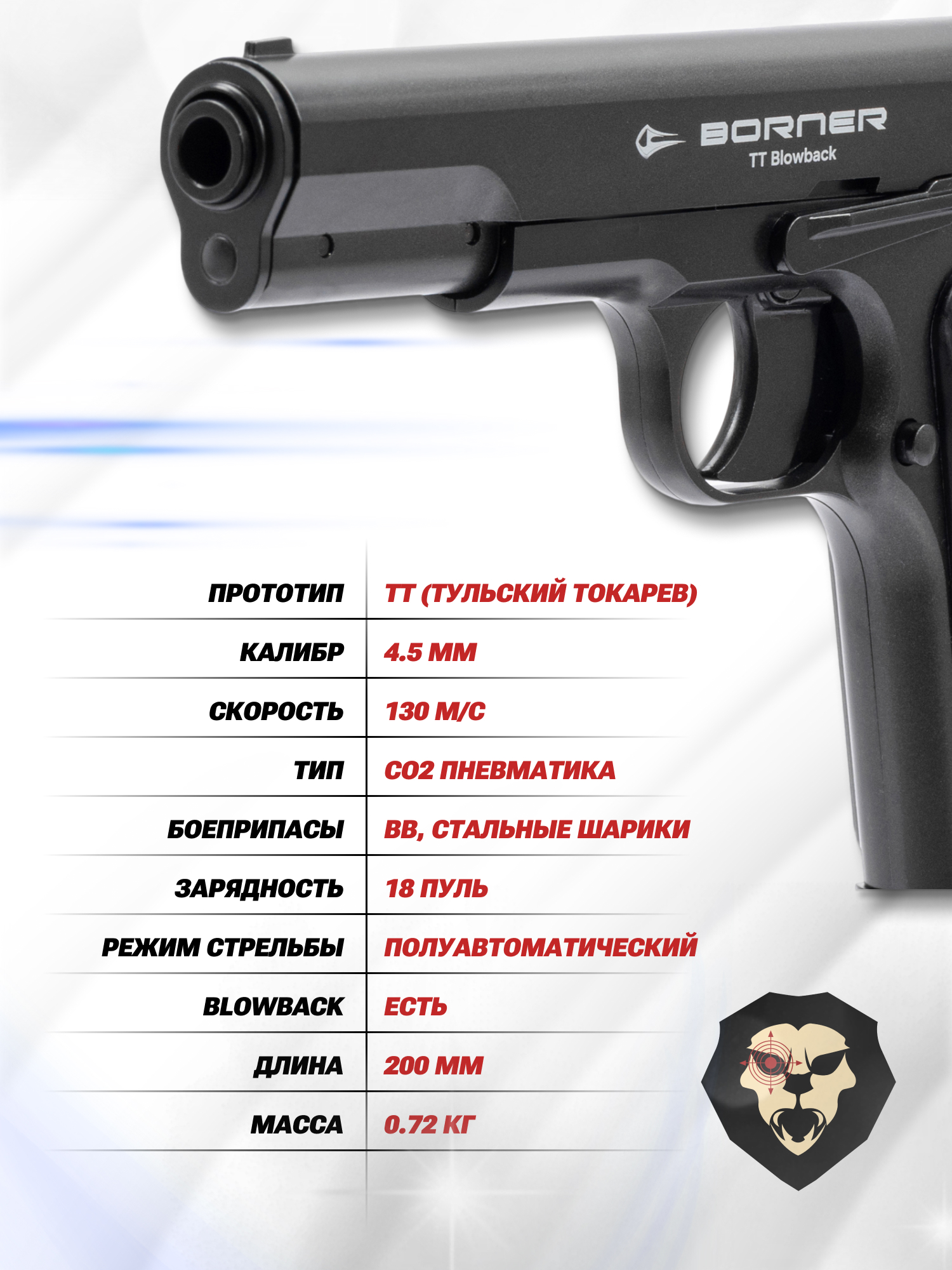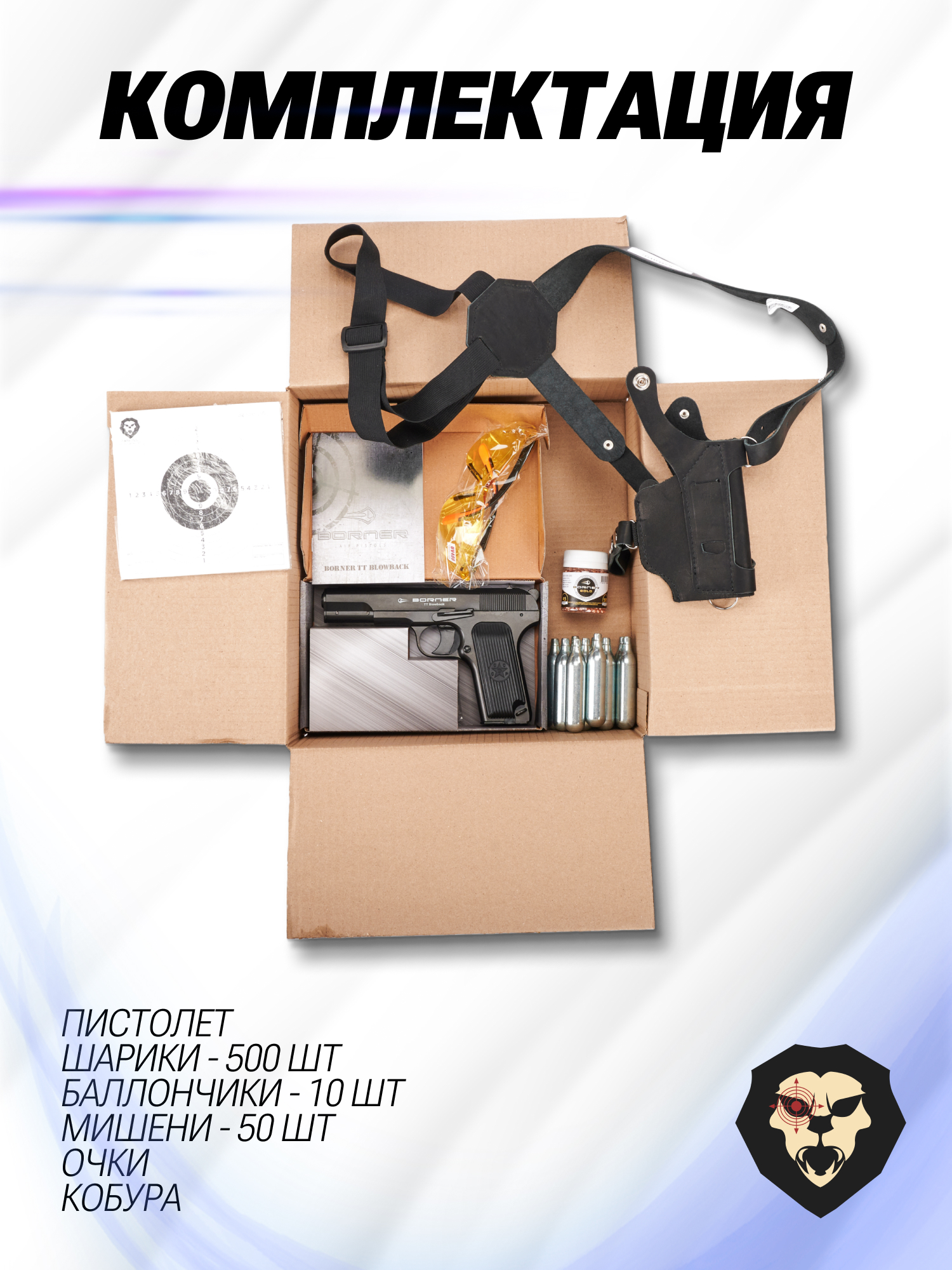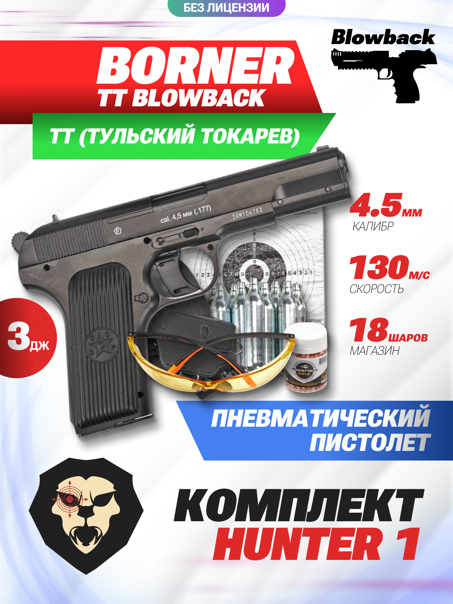 Пневматический пистолет Borner TT Blowback 4.5 мм комплект Hunter №1 подарочный (Токарев, металлический, кобура, 500 шаров, 10 баллонов, очки, 50 мишеней) купить в интернет-магазине Popadiv10.