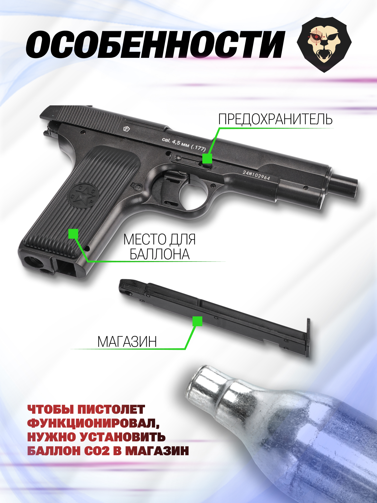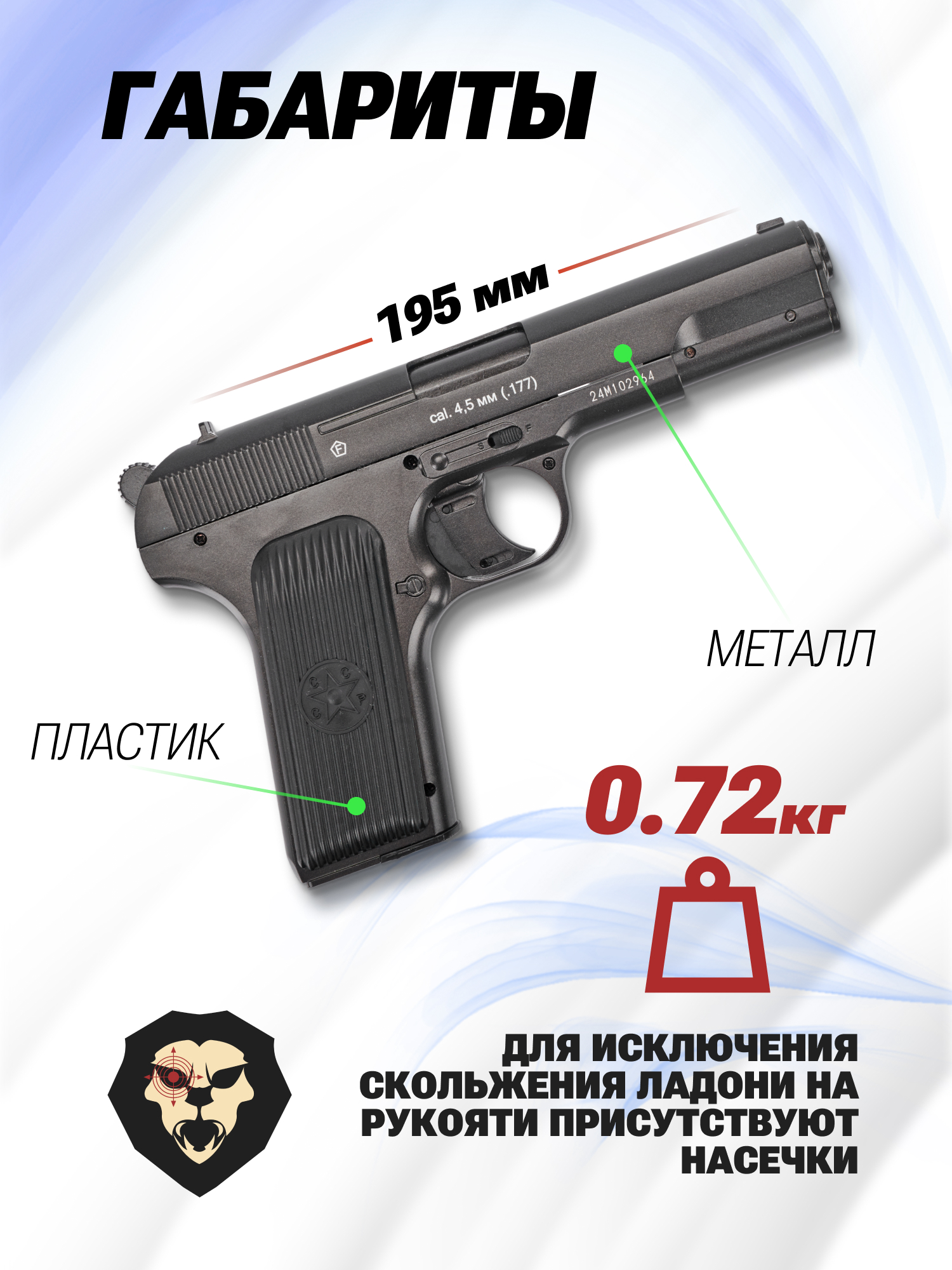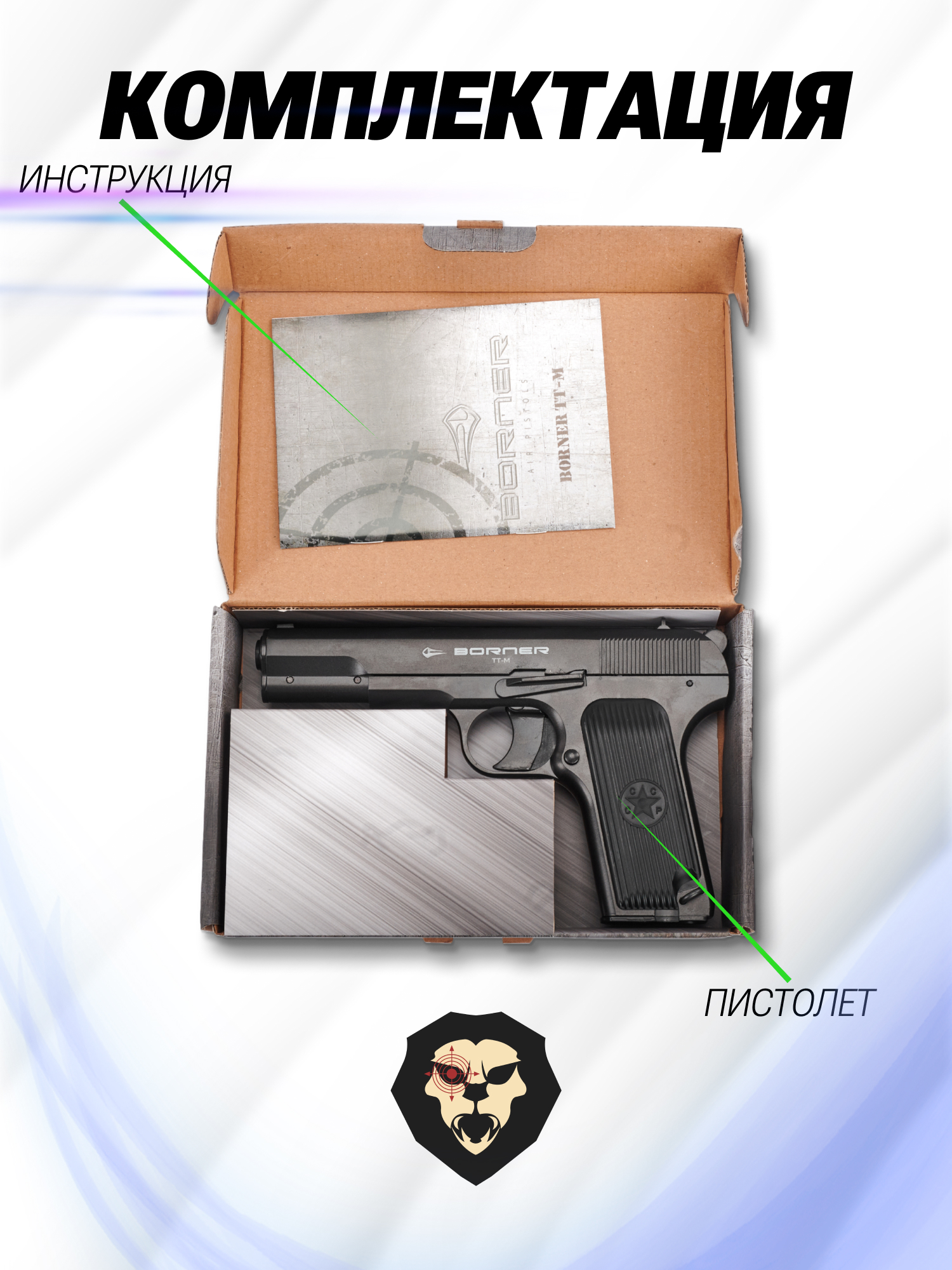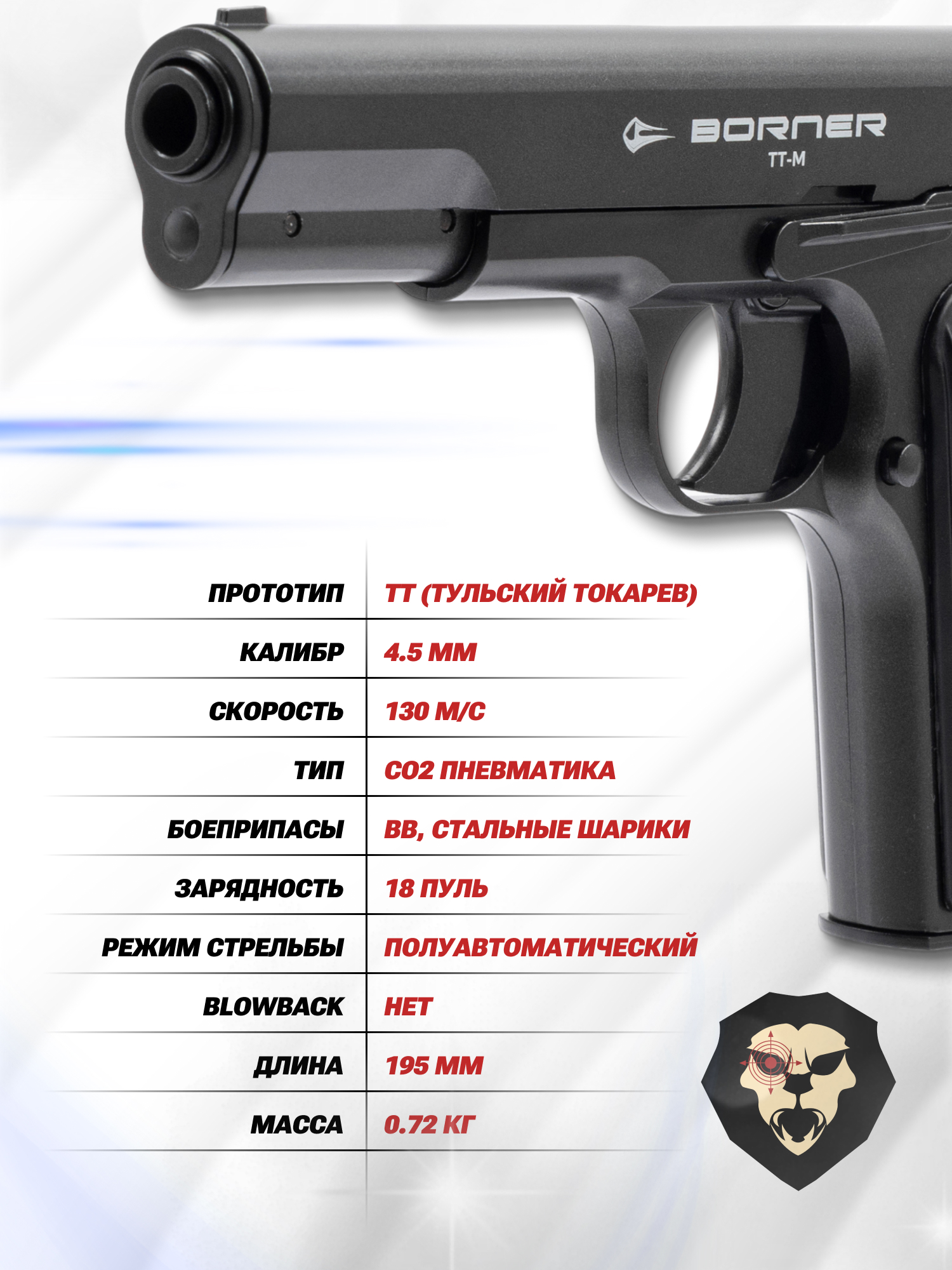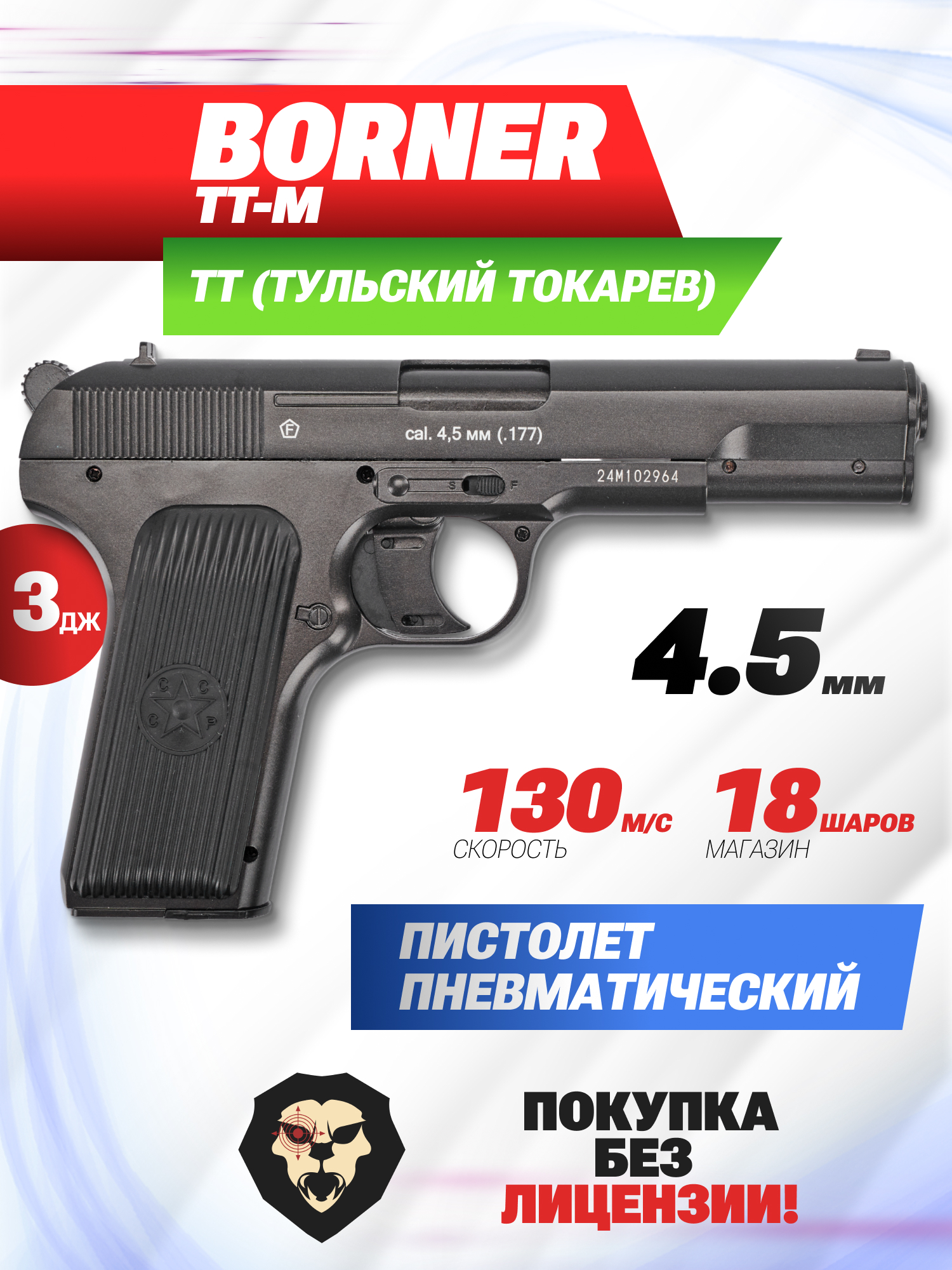 Информация о товаре "Пневматический пистолет Borner TT-M 4.5 мм (металл, Тульский Токарева)" носит ознакомительный характер, и не является публичной офертой, определяемой положениями Статьи 437 Гражданского кодекса Российской Федерации, характеристики, внешний вид, цвет и комплектация могут быть изменены производителем без уведомления.