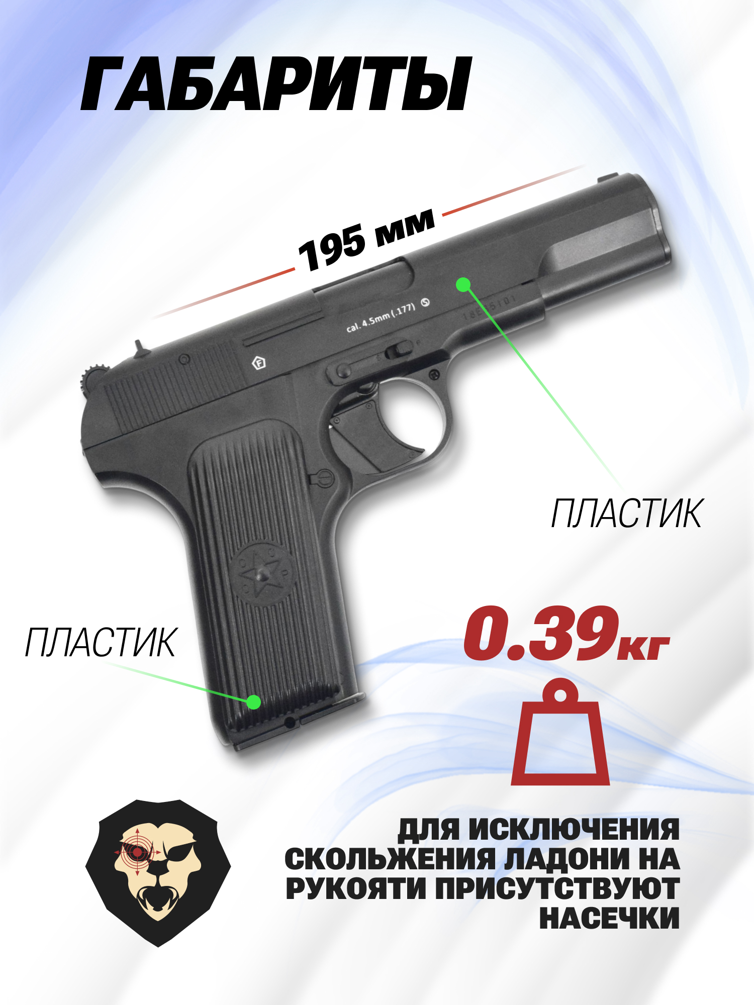 Габариты пистолета максимально приближены к боевому прототипу. Так его длина составляет 195 миллиметров. По бокам рукояти присутствуют щечки с аутентичной эмблемой - благодаря ребристой поверхности они предотвращают скольжение ладони при удержании.