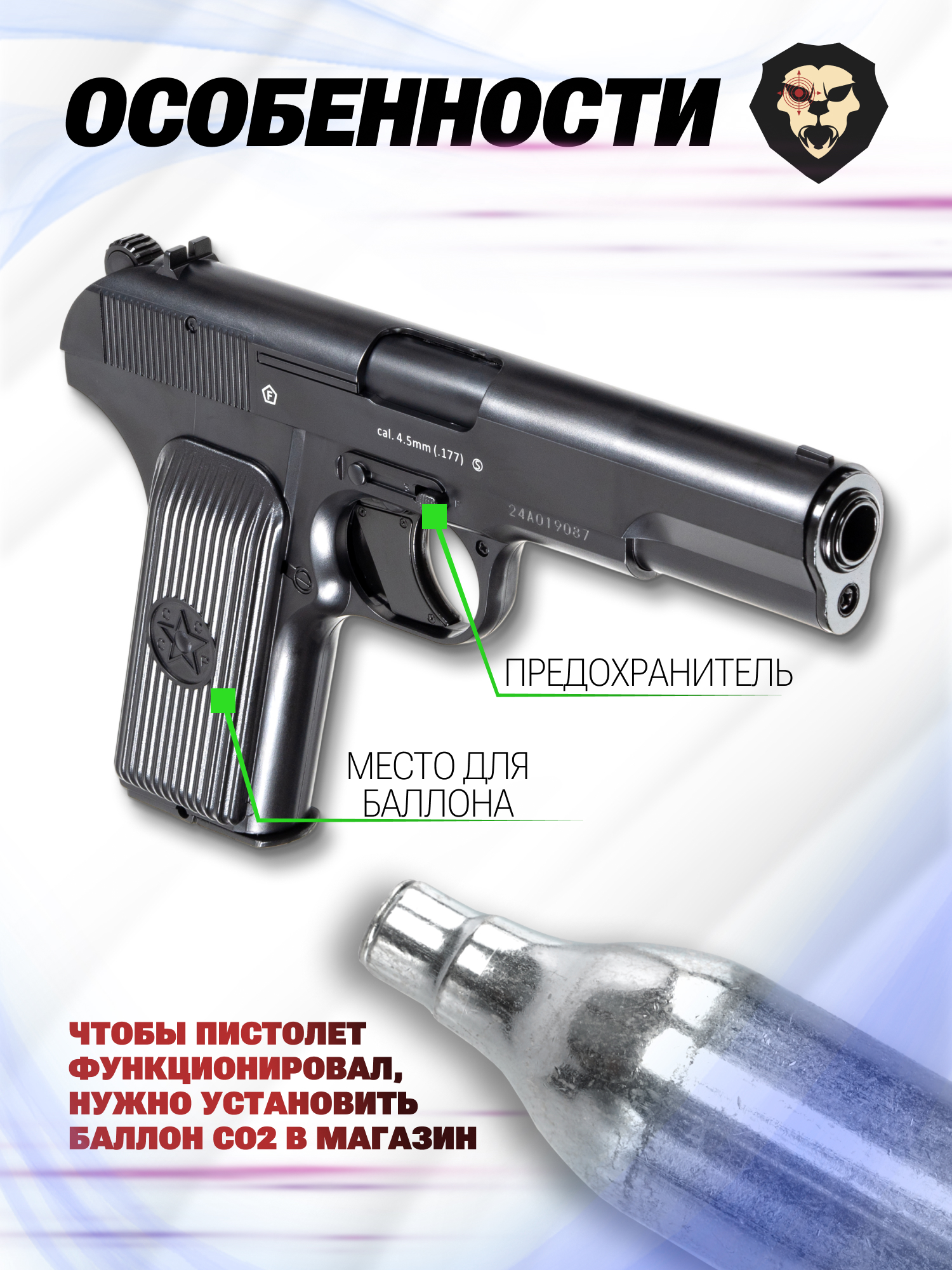 Под действием углекислого газа в момент нажатия на триггер заряд разгоняется по каналу гладкого ствола до 120 метров в секунду. При этом мощность пневматики остается в пределах разрешенного показателя в три Джоуля. Таким образом, изделие сможет приобрести любой желающий по достижении возраста восемнадцати лет - лицензия не потребуется.