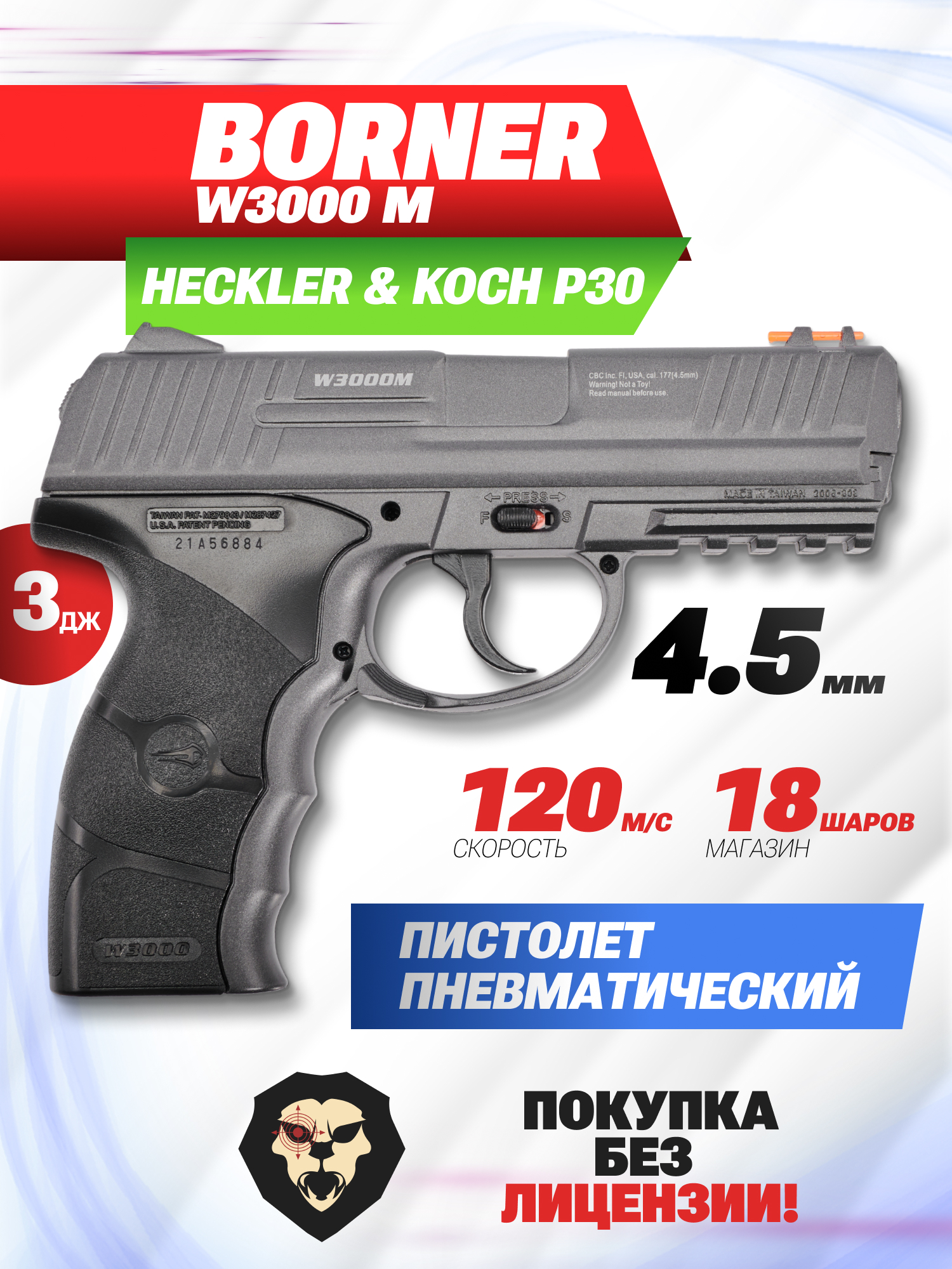 Пневматический пистолет Borner W3000 M оснащается ствольной заготовкой гладкого вида, стреляющий стальными шариками 4.5 миллиметров. Пулька из стали способна достигать скорости в 110-120 м/с выдавая высокие показатели точности и кучности полёта стального шарика. Пистолет поступает на российский рынок мощностью до 3 Джоулей, позволяя приобрести такой образец пневматического оружия без лицензирования.