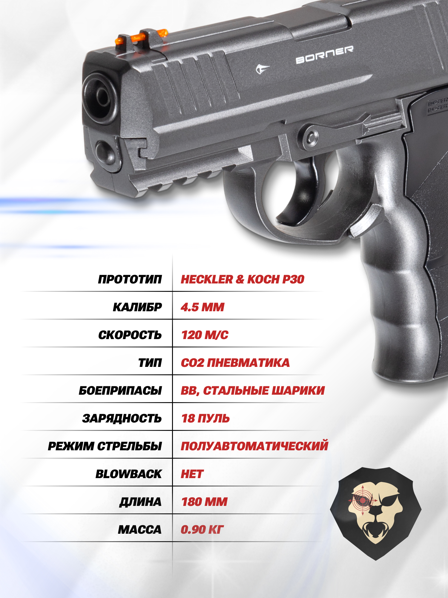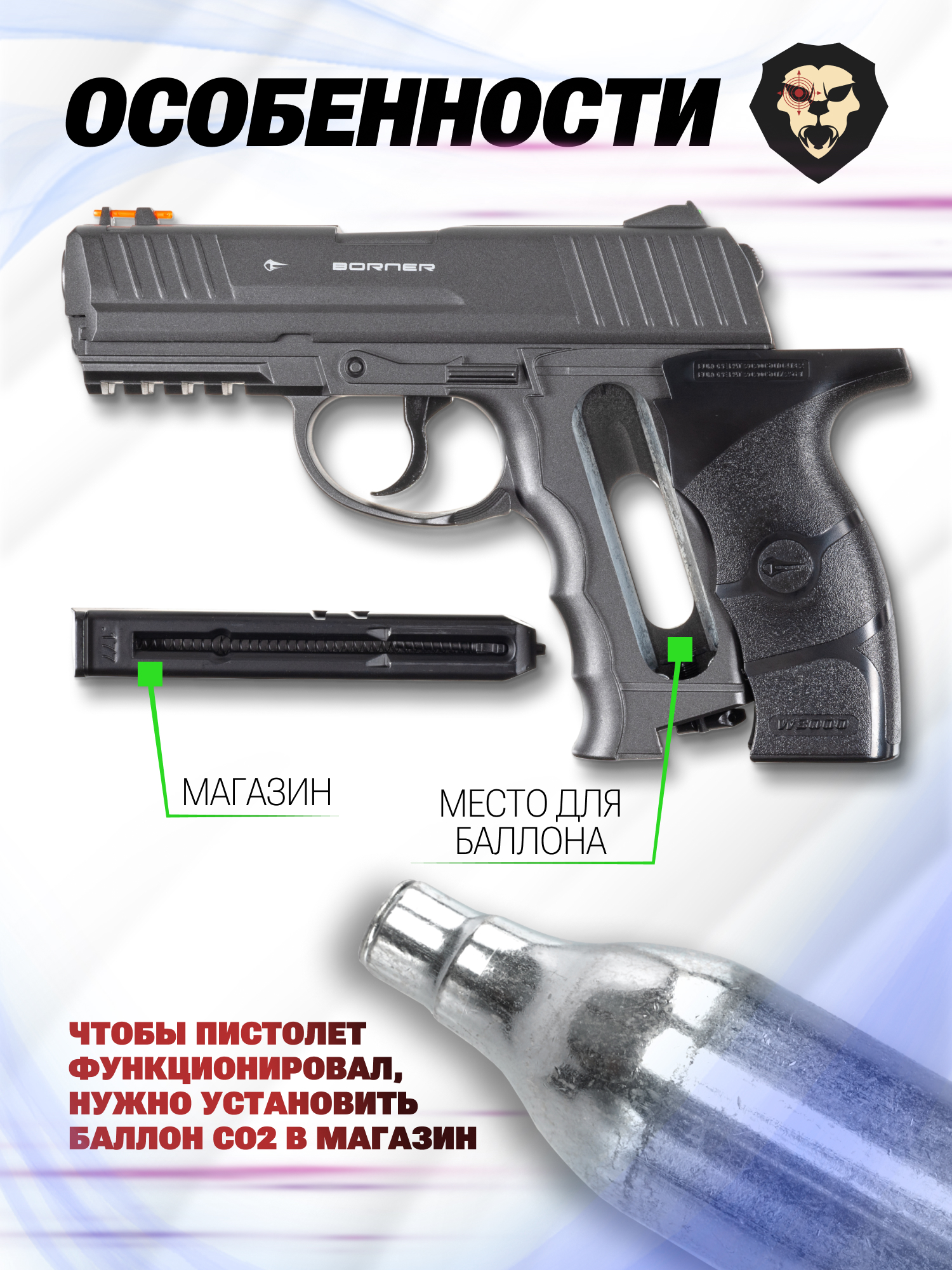 Американская компания Borner известна производством пневматики и ее поставками в различные страны мира. На российский рынок бренд поставляет продукцию с 2011 года и набирает популярность благодаря изготовлению пневматических пистолетов, повторяющих внешний вид огнестрельного оружия. Такие образцы подойдут для развлекательной стрельбы или тренировки различных приёмов при использовании короткоствольного оружия.