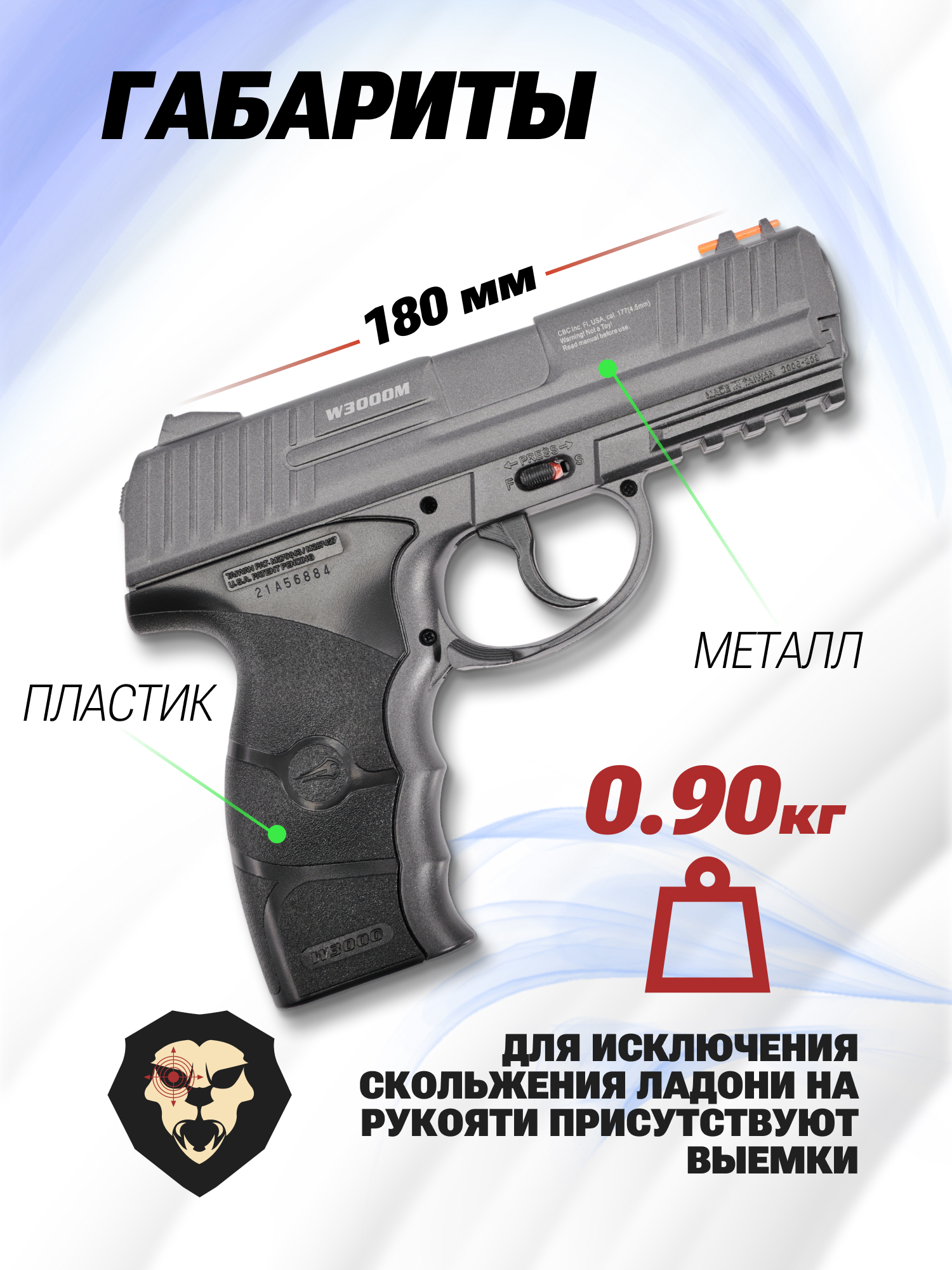 Borner W3000 M стоит относить к категории компактных пистолетов, при исполнении в металле вес оружия достигает 0.9 килограмм, при длине в 180 мм, повышая удобство транспортировки.