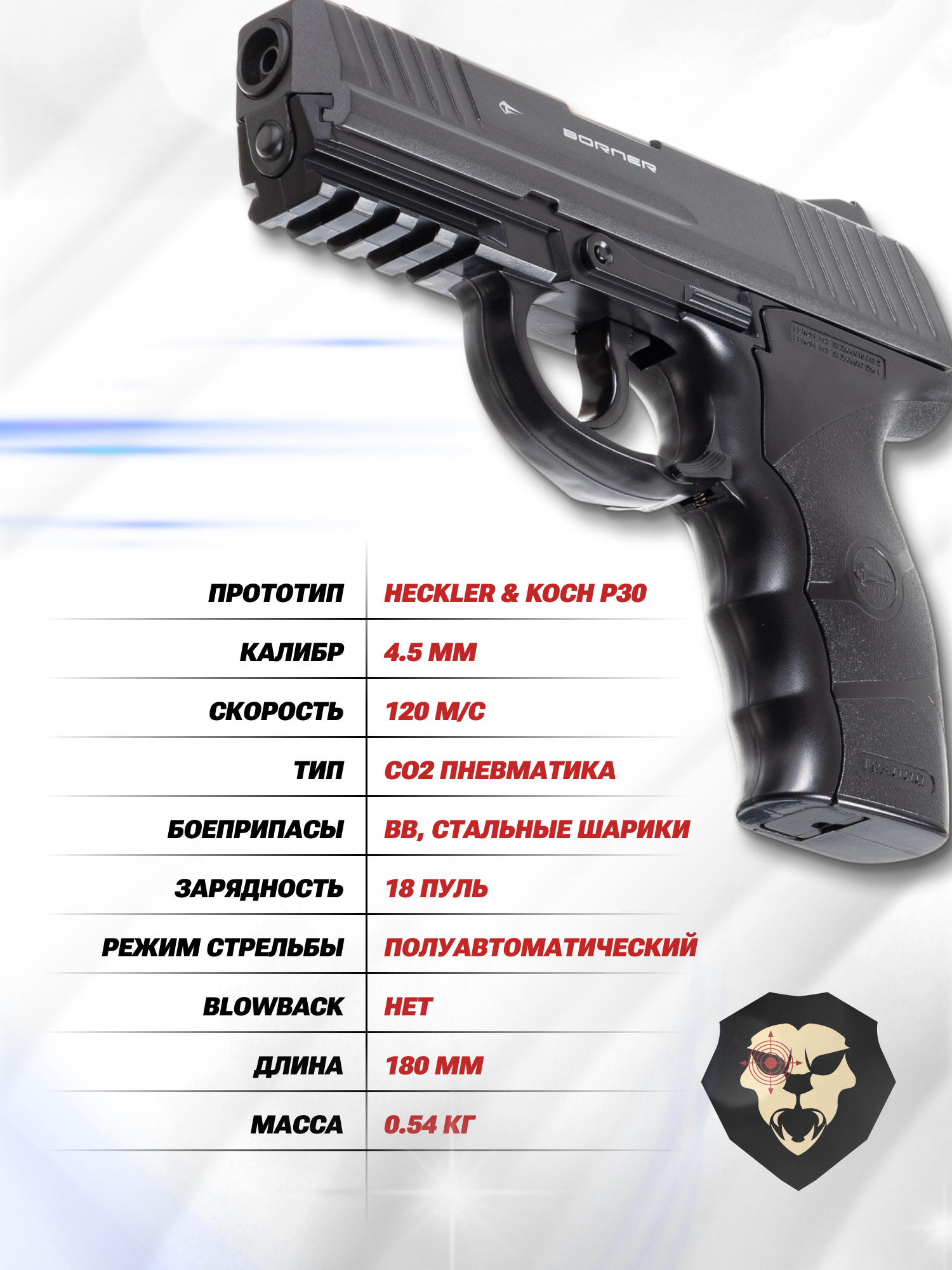 Пневматический пистолет Borner W3000 также представляет собой копию пистолета P30 компании Heckler & Koch. Прототип подарил реплике дизайн рамки и кожуха затвора, и все мелкие детали — присутствует даже узнаваемая клавиша сброса магазина. Тем не менее, компания внесла и собственные коррективы. Пример — более округлая скобка спуска.