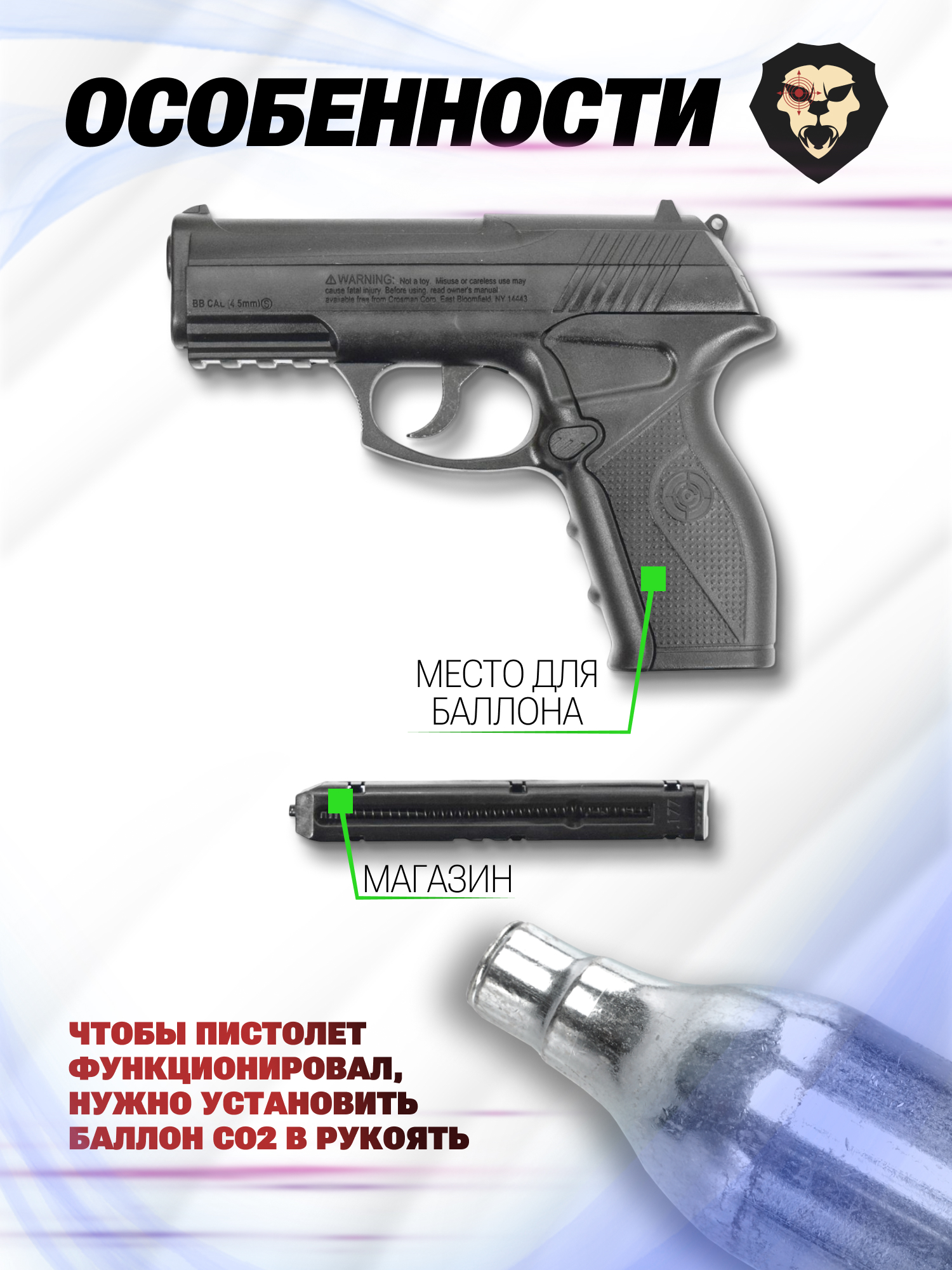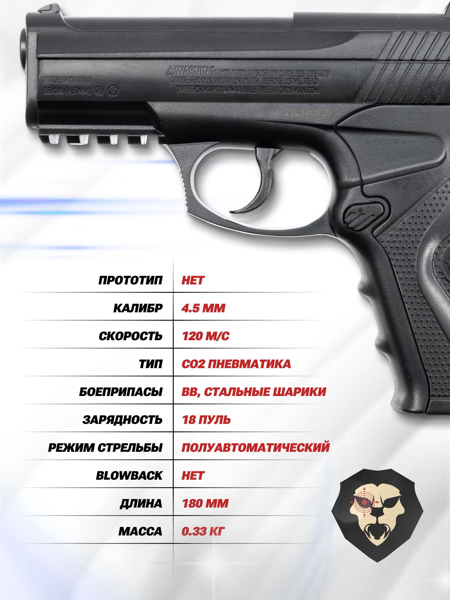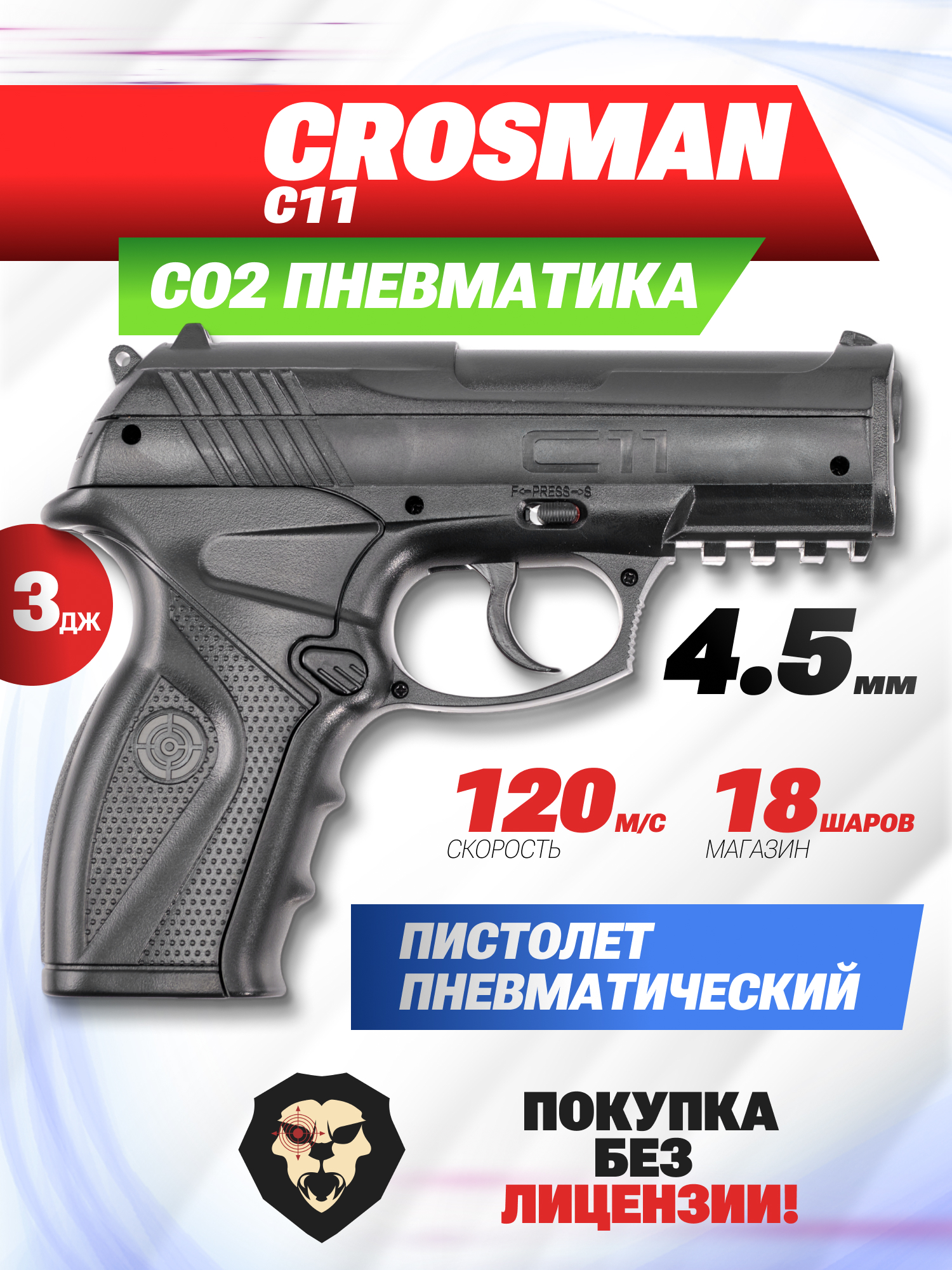 Информация о товаре "Пневматический пистолет Crosman C11 4.5 мм (пластик, CO2)" носит ознакомительный характер, и не является публичной офертой, определяемой положениями Статьи 437 Гражданского кодекса Российской Федерации, характеристики, внешний вид, цвет и комплектация могут быть изменены производителем без уведомления.