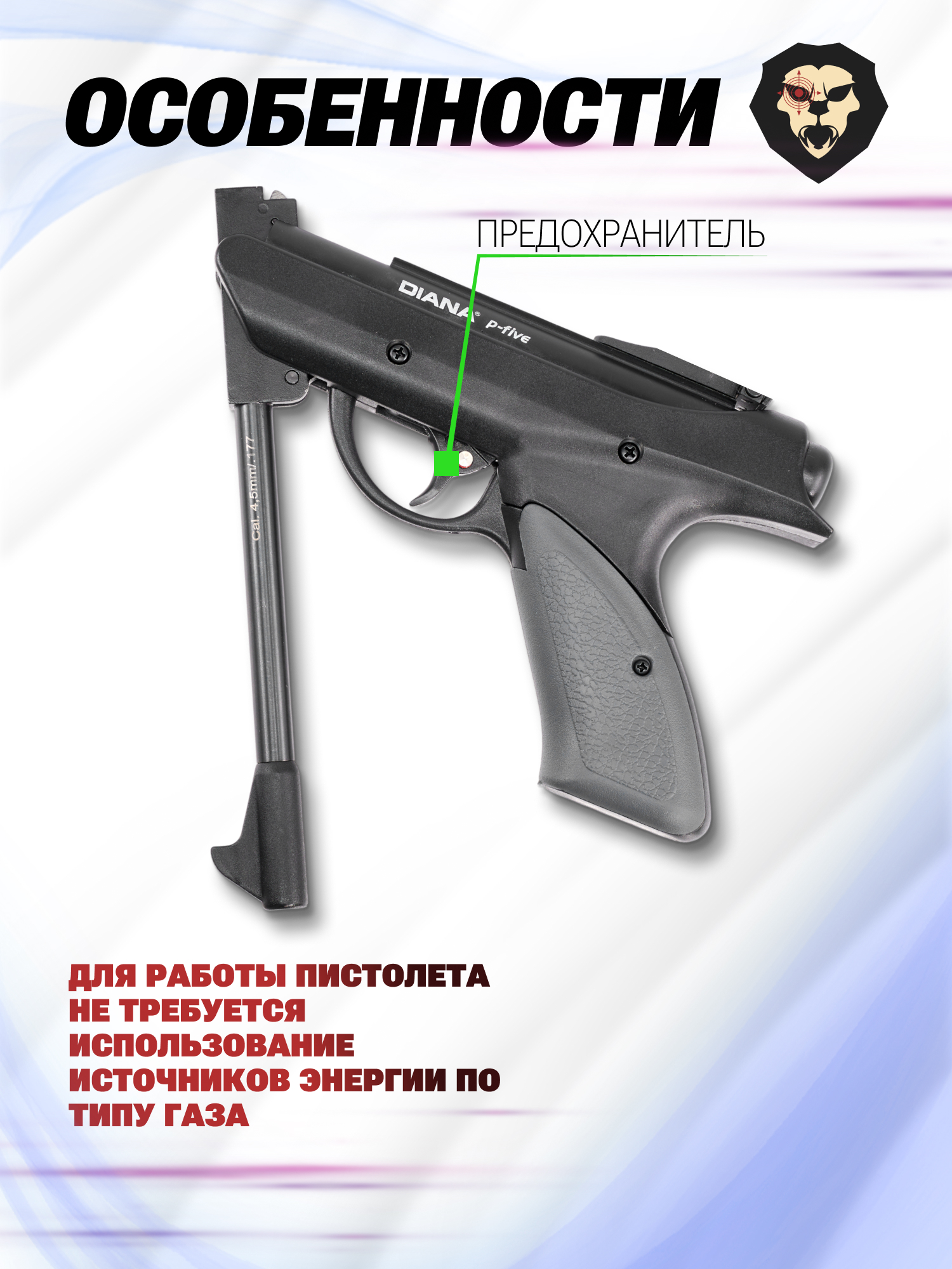 Представленный пневматический пистолет Diana P-Five 4.5 мм оснащается предохранительным механизмом, который представляет собой двухпозиционную кнопку на спусковом крючке. Такой узел защищает пользователя и окружающих от случайного неконтролируемого выстрела, блокируя триггер до момента переключения положения рычага стрелком.