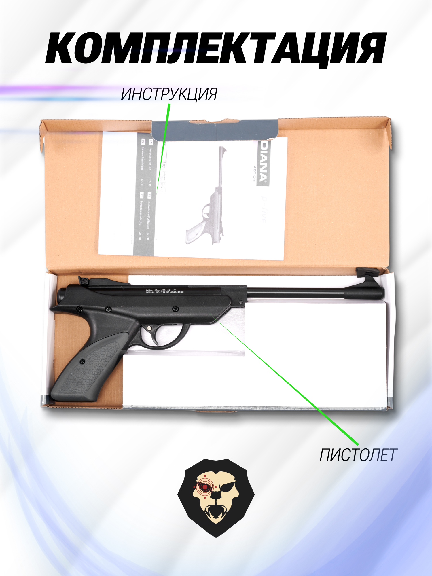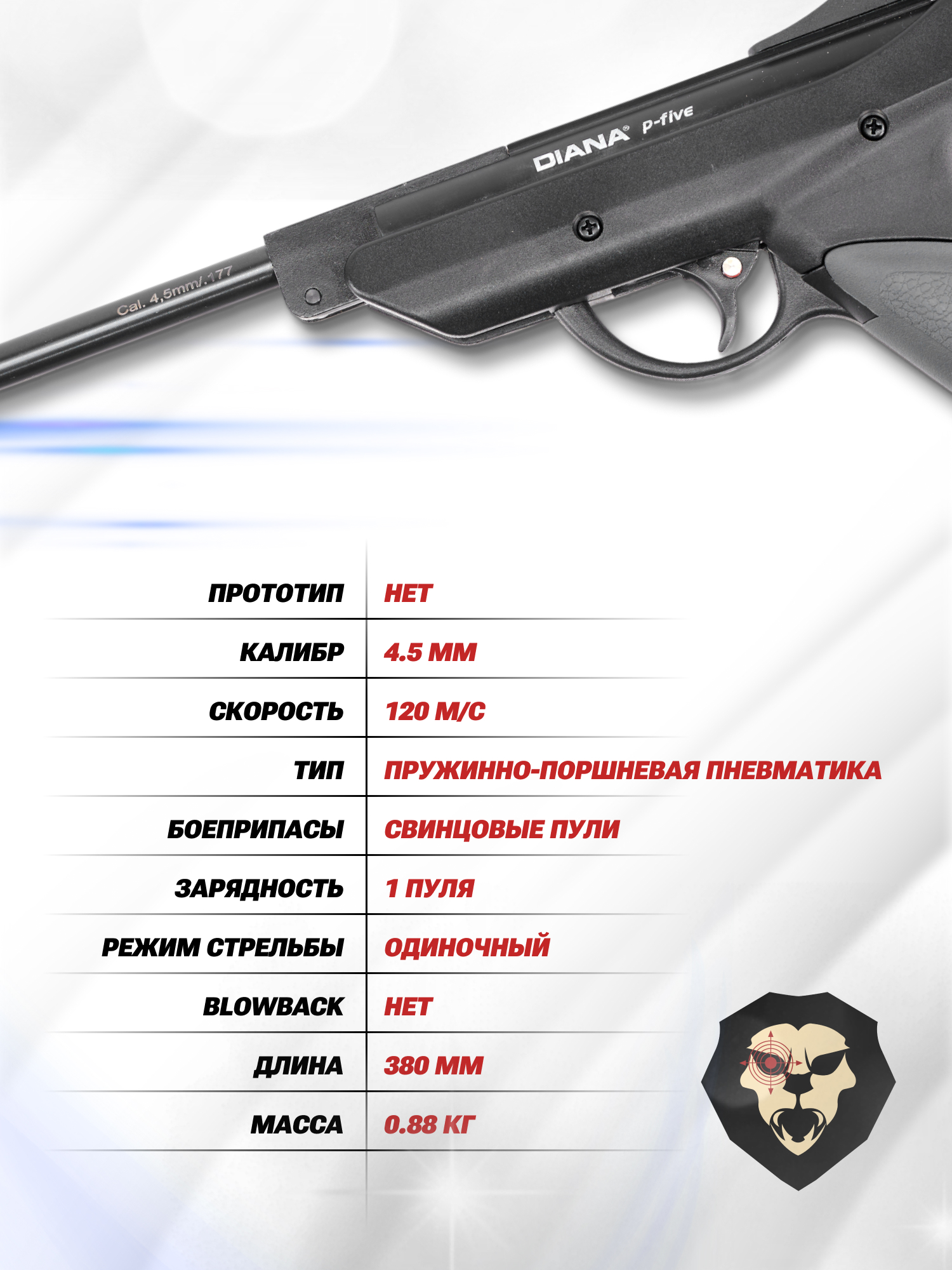 Информация о товаре "Пневматический пистолет Diana P-Five 4.5 мм (3 Дж)" носит ознакомительный характер, и не является публичной офертой, определяемой положениями Статьи 437 Гражданского кодекса Российской Федерации, характеристики, внешний вид, цвет и комплектация могут быть изменены производителем без уведомления.