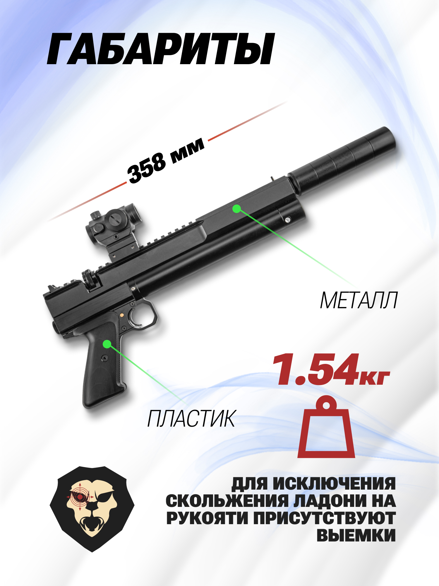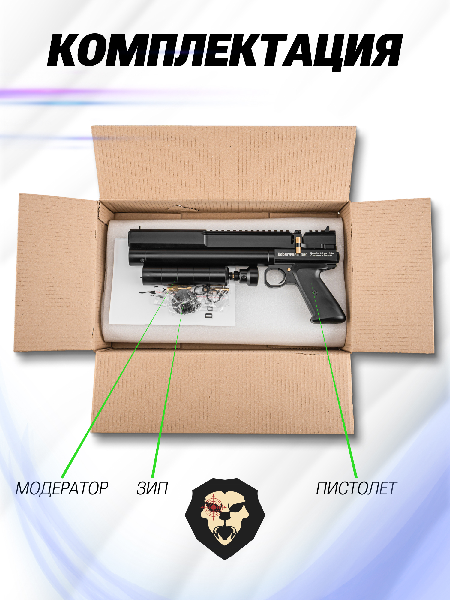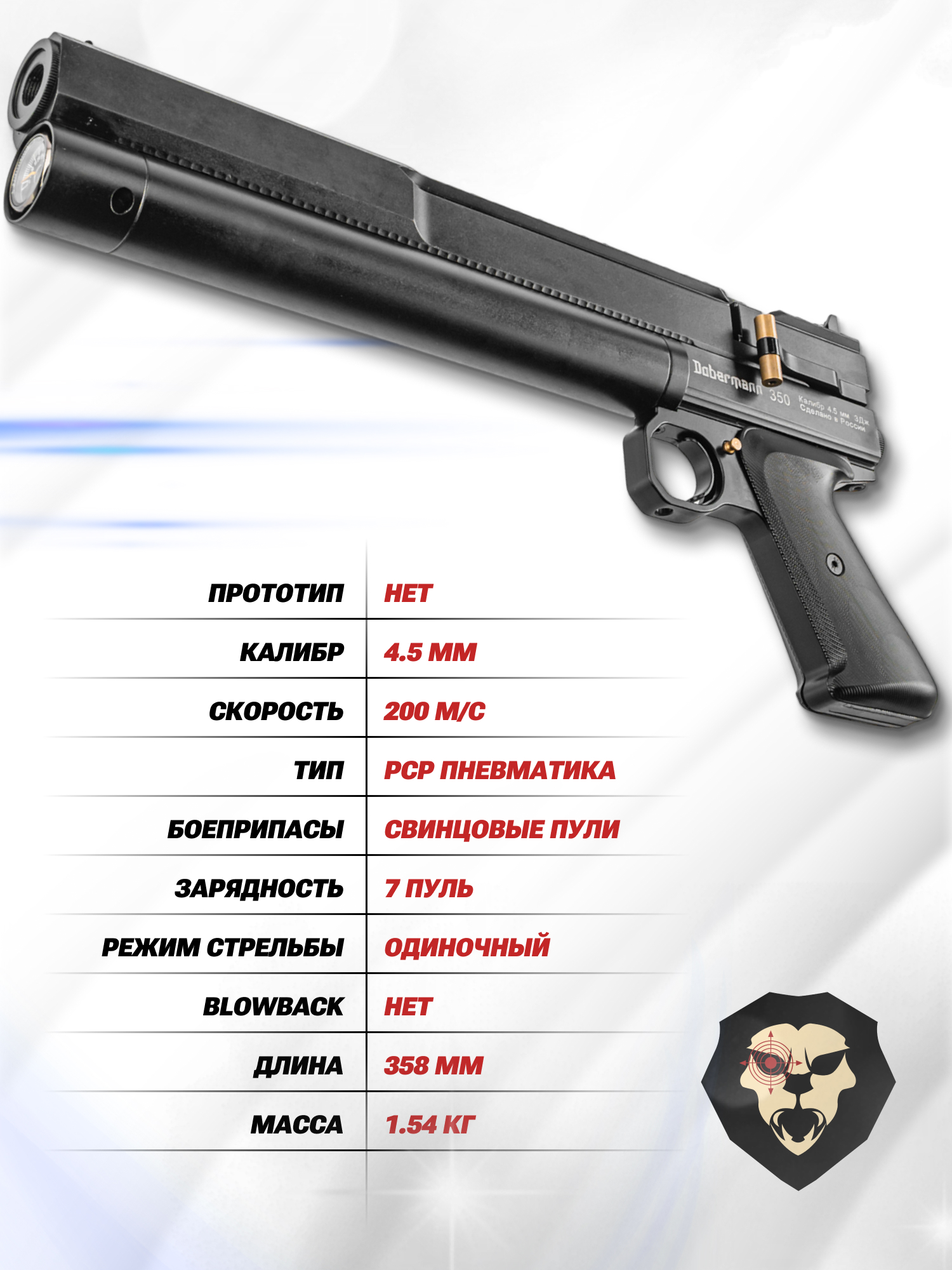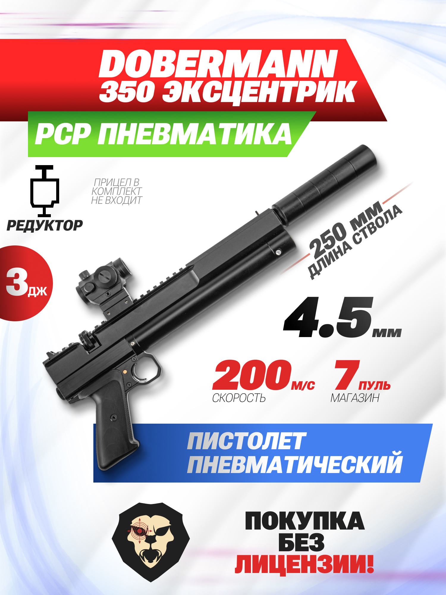Информация о товаре "Пневматический пистолет Dobermann 350 Эксцентрик 4.5 мм (250 мм, редуктор)" носит ознакомительный характер, и не является публичной офертой, определяемой положениями Статьи 437 Гражданского кодекса Российской Федерации, характеристики, внешний вид, цвет и комплектация могут быть изменены производителем без уведомления.