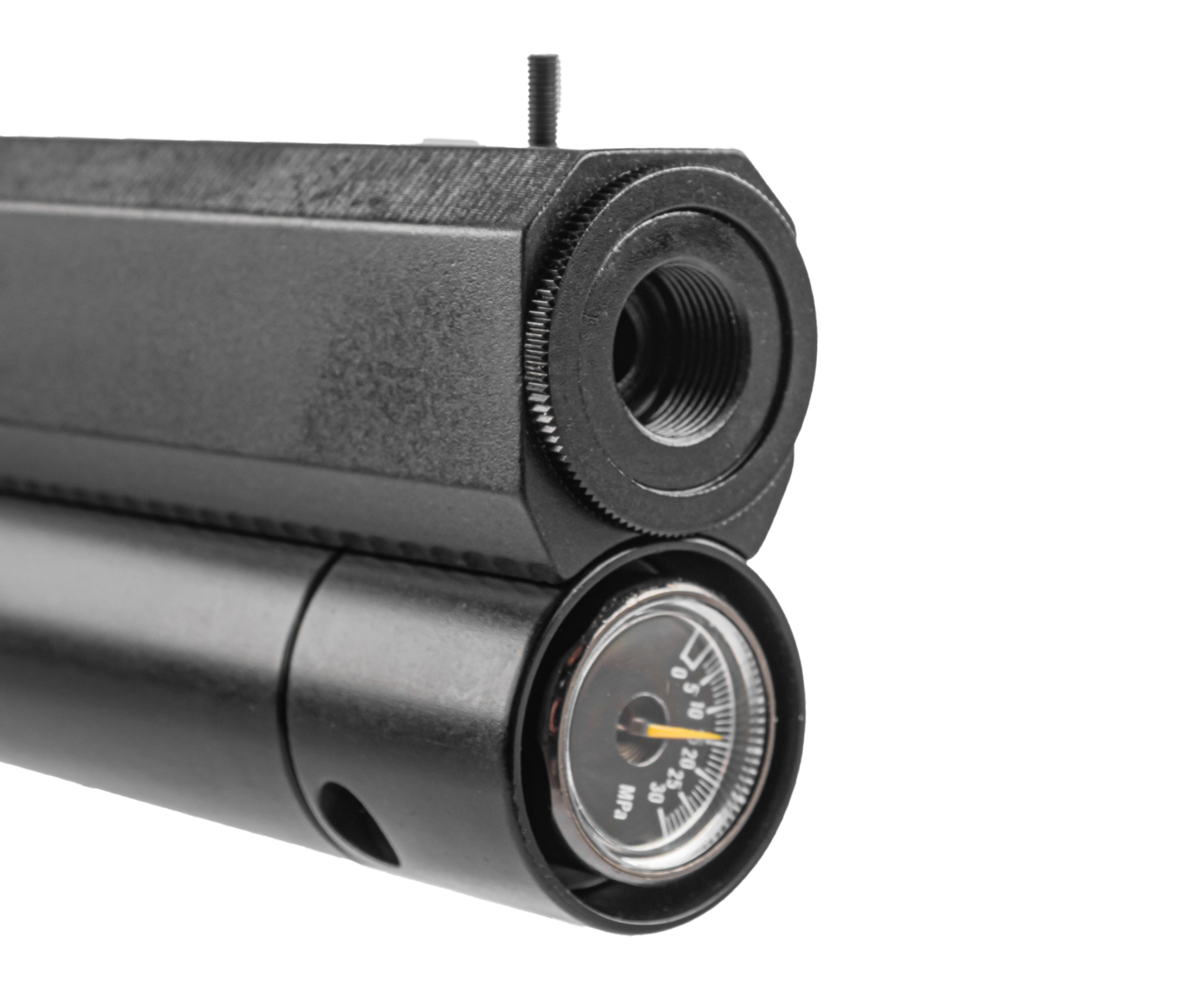 При ограниченных размерах платформу снабдили резервуаром на 108 кубических сантиметров, причем рассматриваемая вариация Dobermann 350 Эксцентрик по умолчанию идет с редуктором. Это значит, что давление пропускаемого в ствол воздуха выставляется пользователем самостоятельно для более стабильной и предсказуемой стрельбы. Накачка системы происходит насосами ВД, подсоединяемыми через штуцер, при этом предельный уровень заполнения составляет 250 Бар - текущее состояние отслеживается интегрированным со стороны передней пробки манометром.