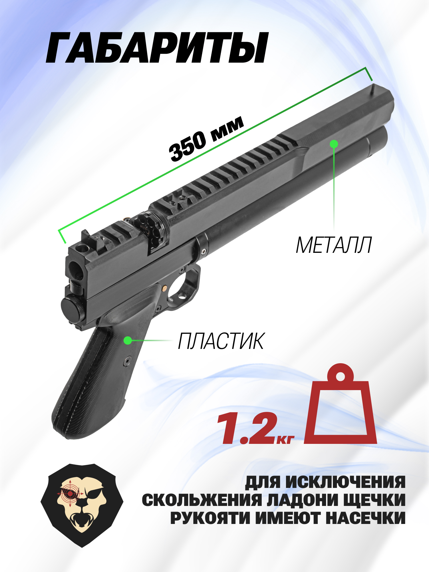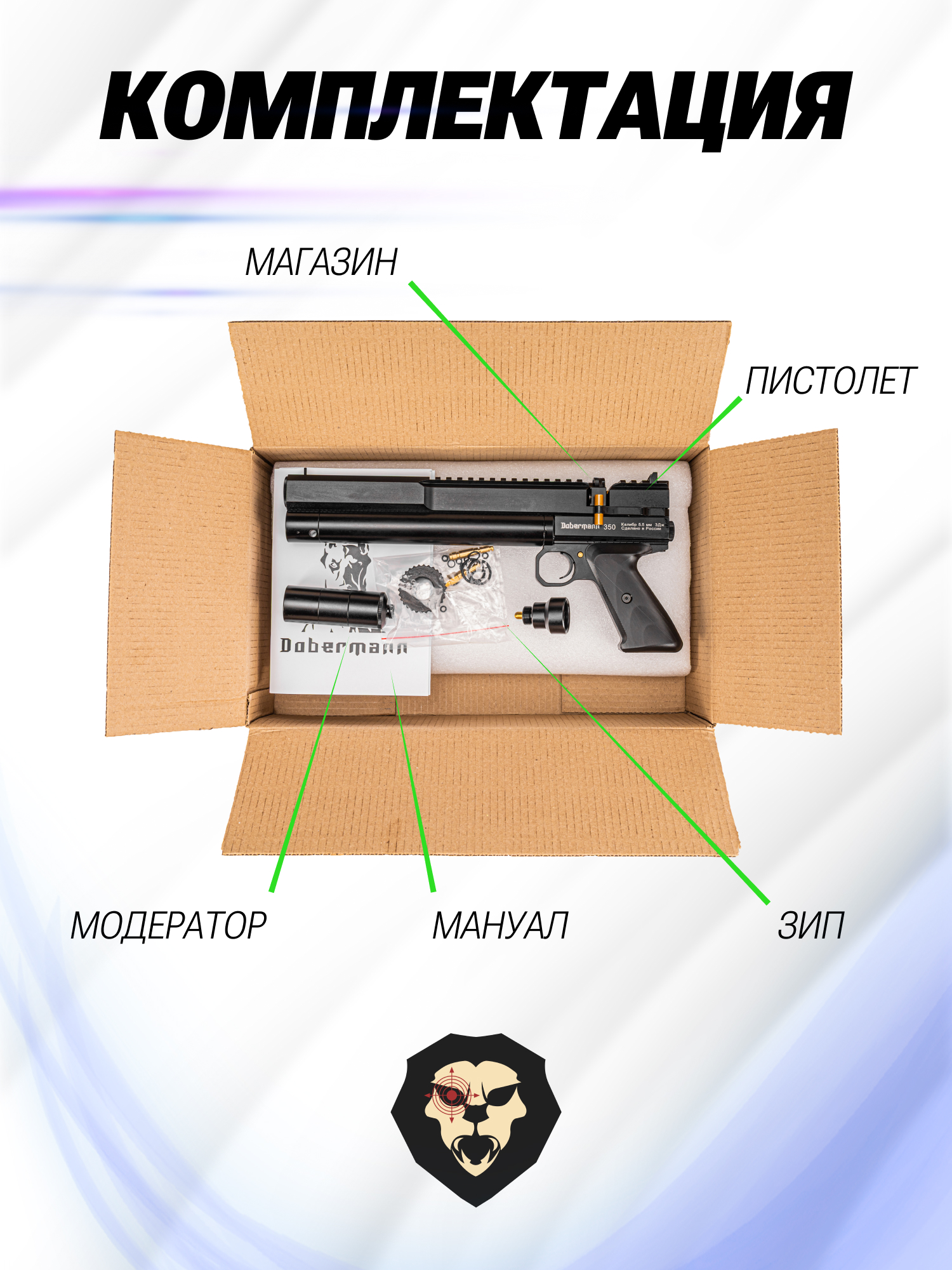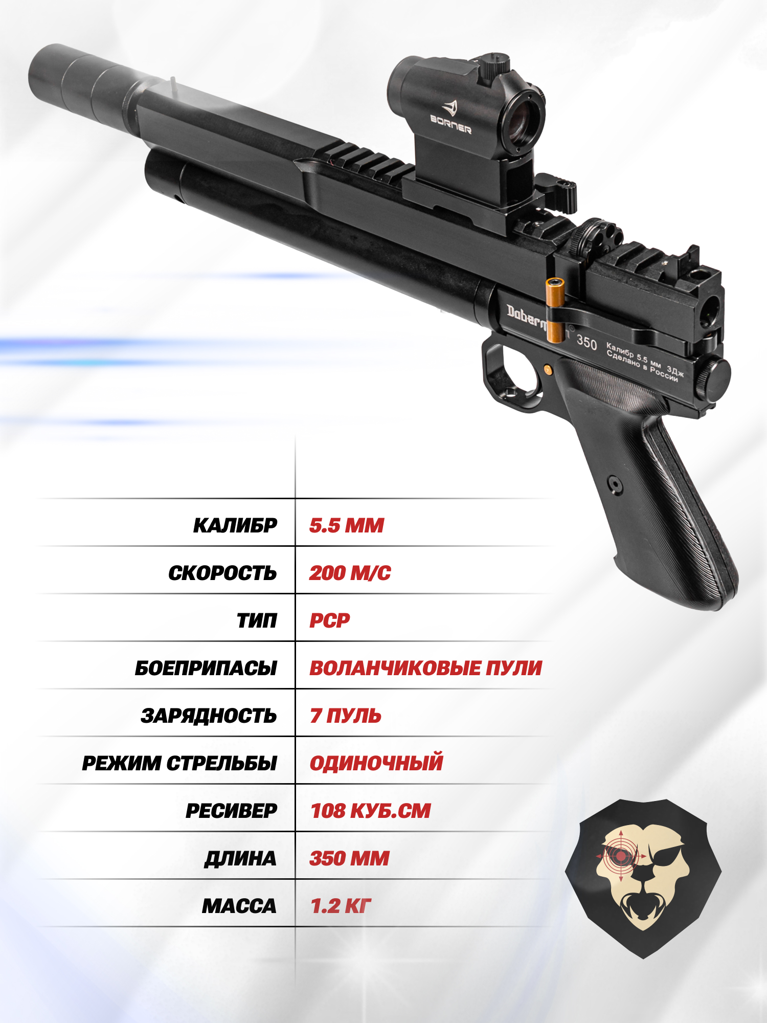 Информация о товаре "Пневматический пистолет Dobermann 350 Эксцентрик 5.5 мм (200 мм, редуктор)" носит ознакомительный характер, и не является публичной офертой, определяемой положениями Статьи 437 Гражданского кодекса Российской Федерации, характеристики, внешний вид, цвет и комплектация могут быть изменены производителем без уведомления.