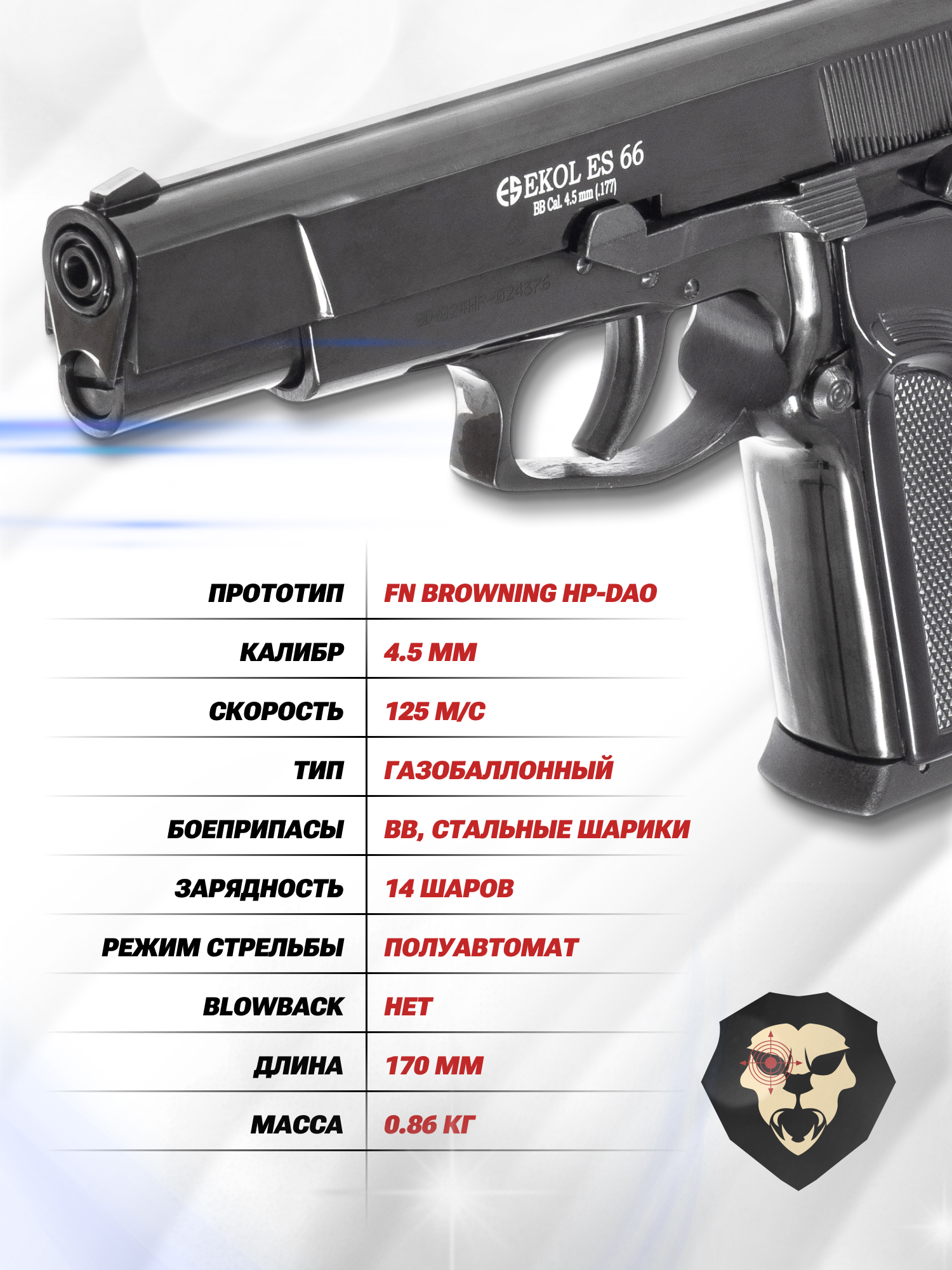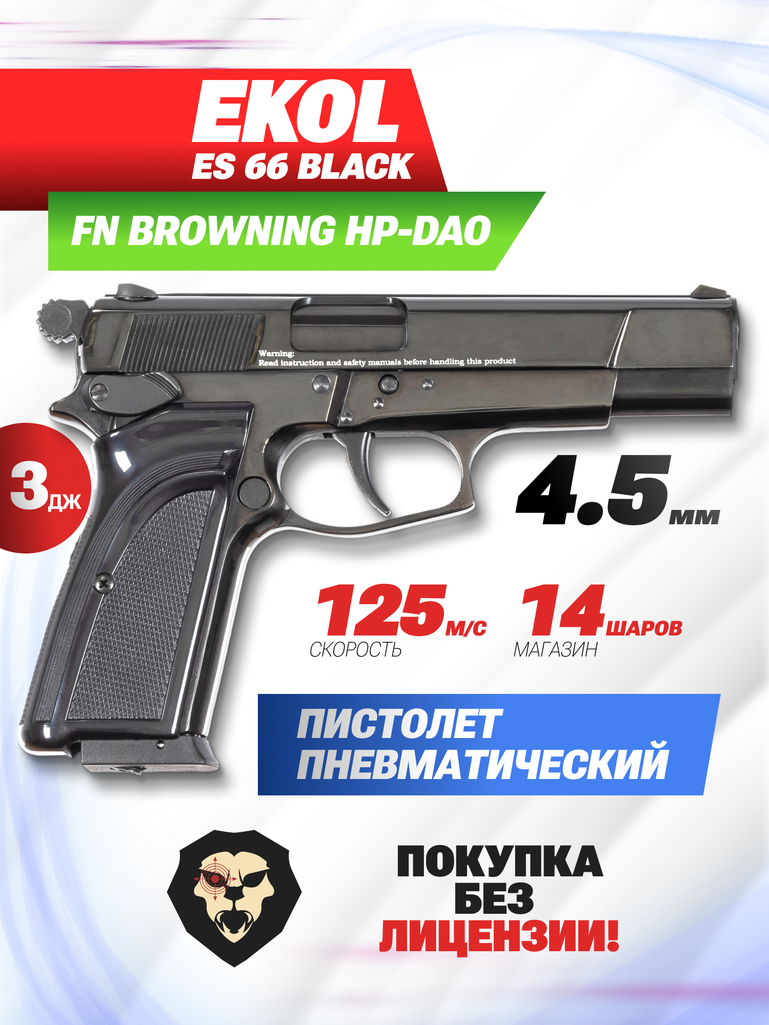 Информация о товаре "Пневматический пистолет Ekol ES 66 Black 4.5 мм (Браунинг ХП, 3 Дж, металл)" носит ознакомительный характер, и не является публичной офертой, определяемой положениями Статьи 437 Гражданского кодекса Российской Федерации, характеристики, внешний вид, цвет и комплектация могут быть изменены производителем без уведомления.